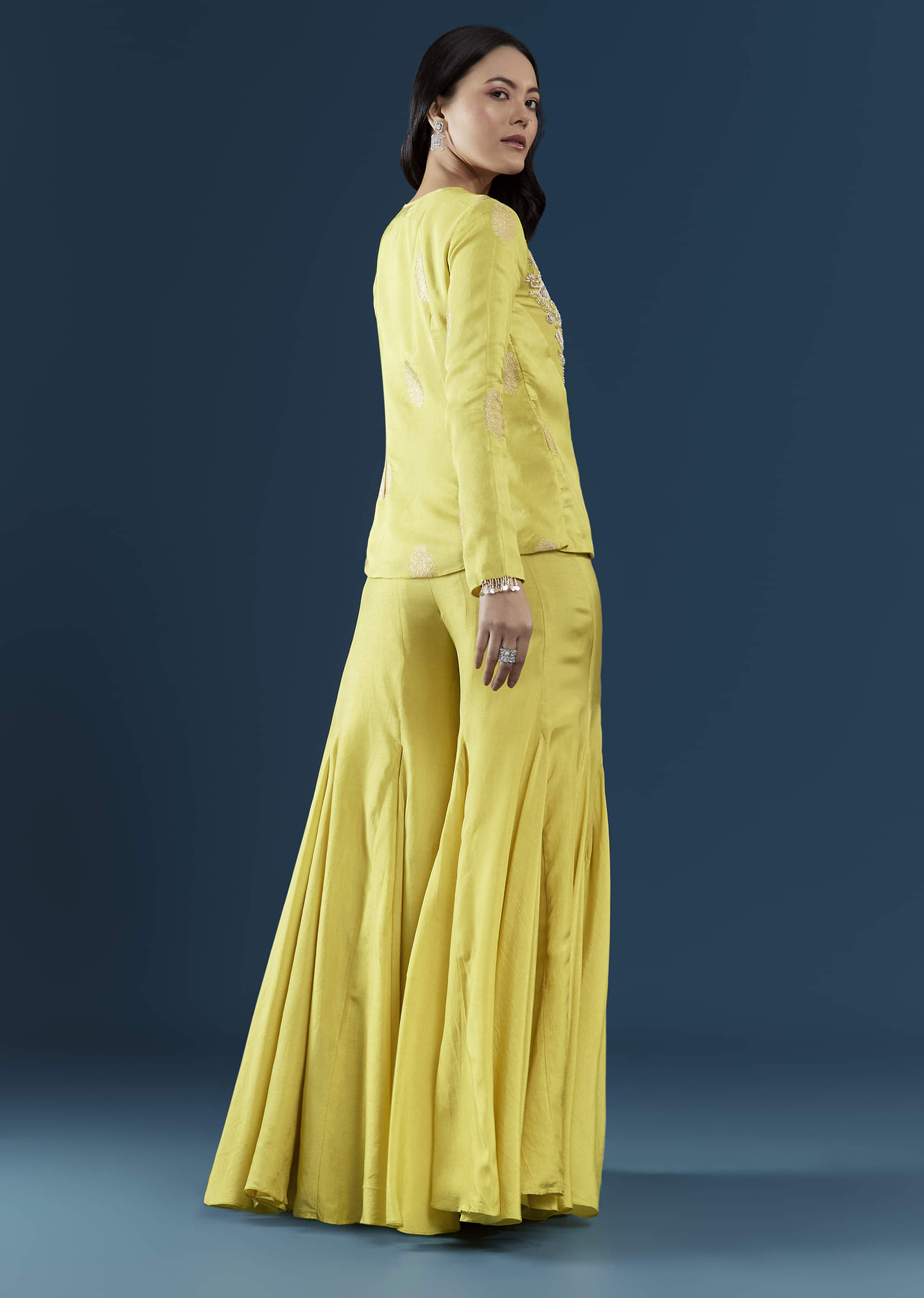 Playful and refreshing, this lime green silk crop top and pant set is a contemporary take on festive dressing. The lustrous silk fabric enhances the vibrant hue, while delicate moti... More Product Details