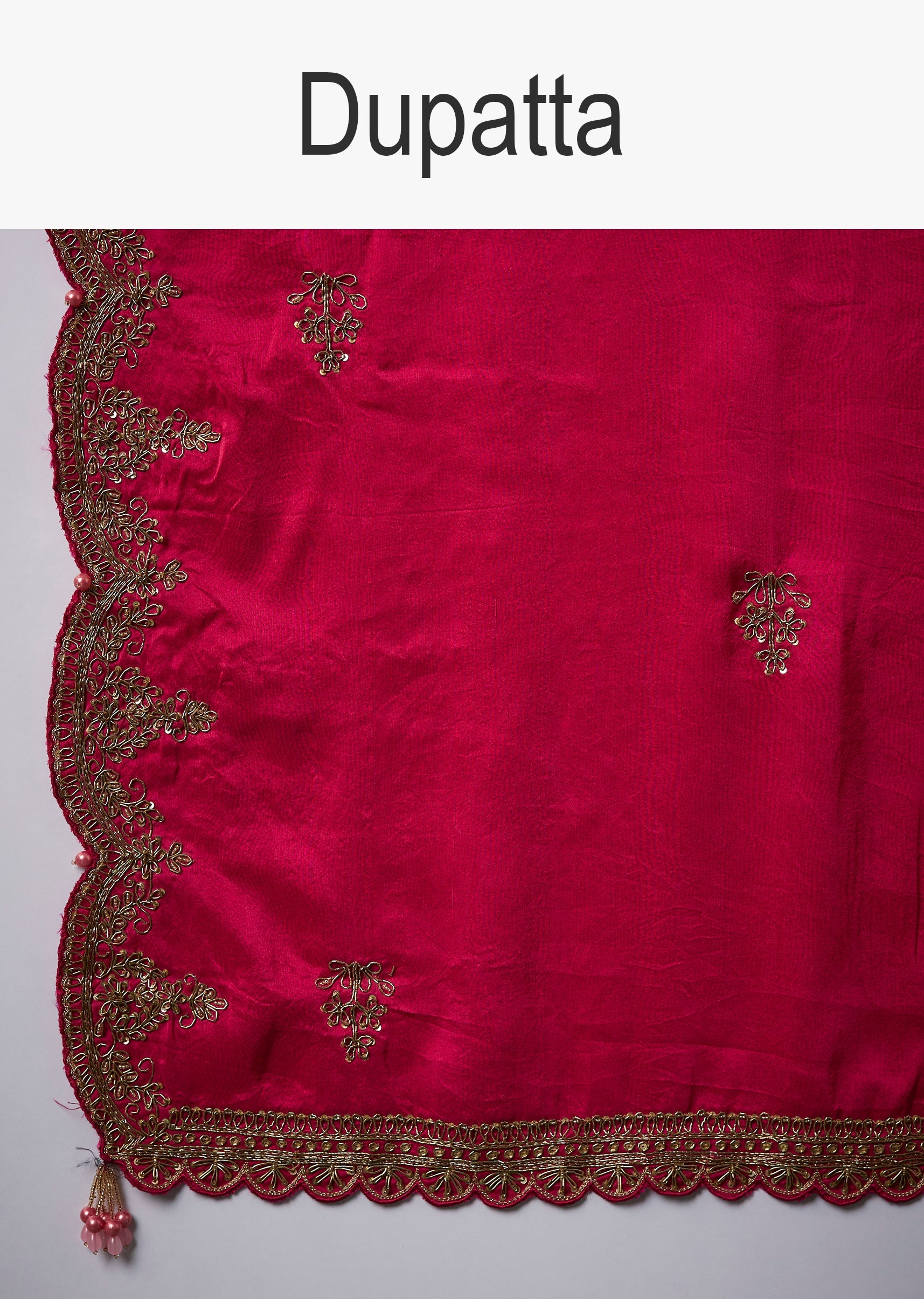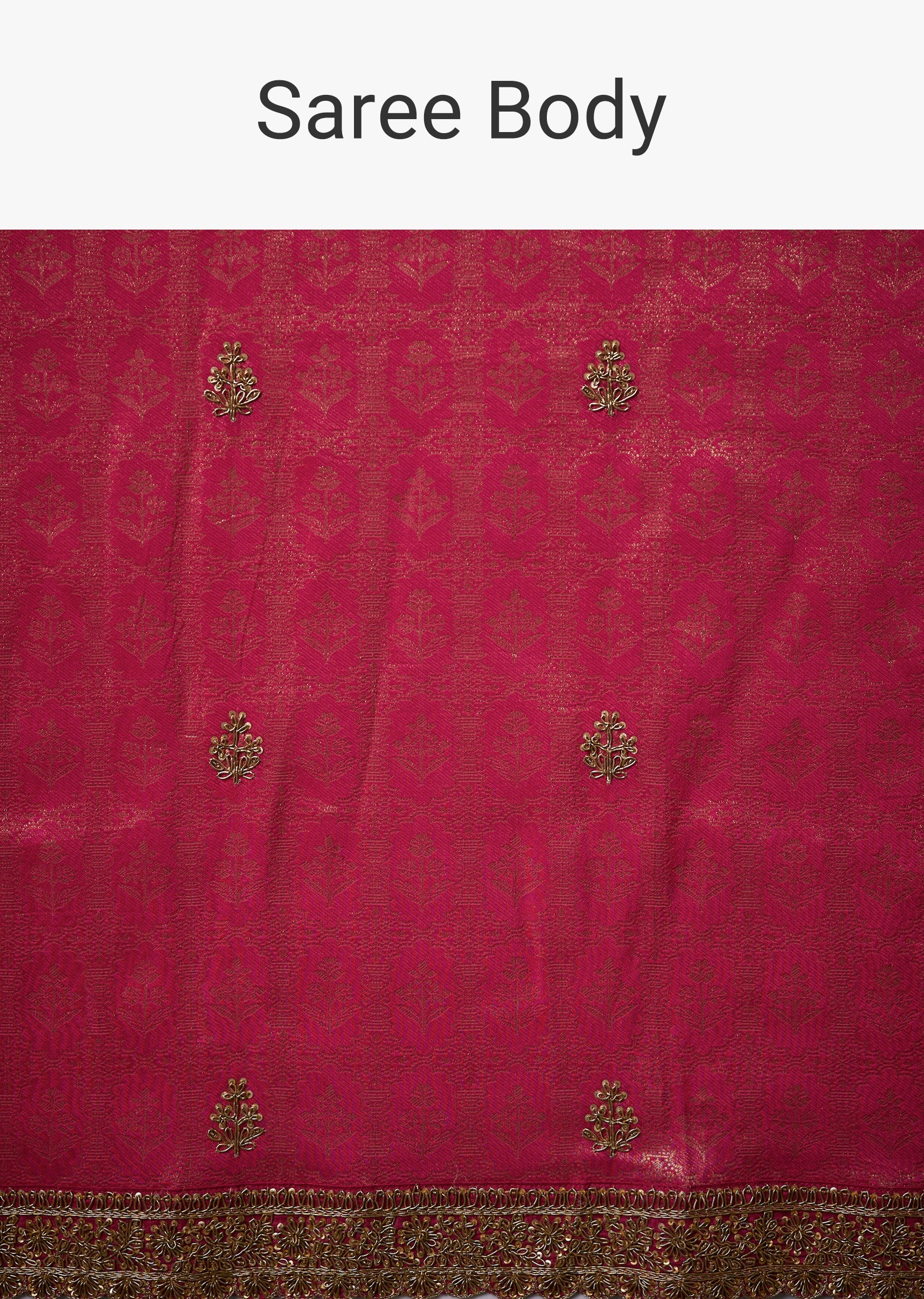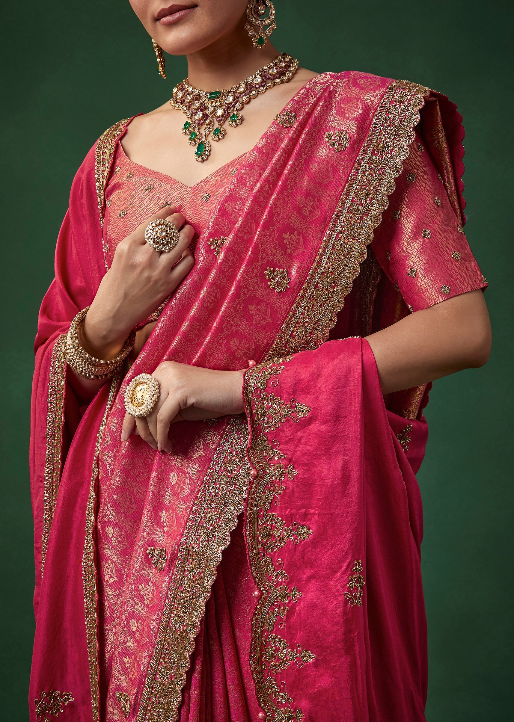 Bridal grandeur shines through this soft silk saree, lavishly adorned with jacquard zari brocade and intricate butti embroidery highlighted with fine zardosi work. The scallop border adds a refined elegant finish, while the vibrant magenta tone enhances its regal appeal, making it a stunning choice for weddings, receptions, and celebratory occasions. The set includes one saree and one embroidered unstitched blouse fabric, offering luxurious styling versatility. Awarded as the Most Trusted Brand, we're delivering styles you love, just as promised.