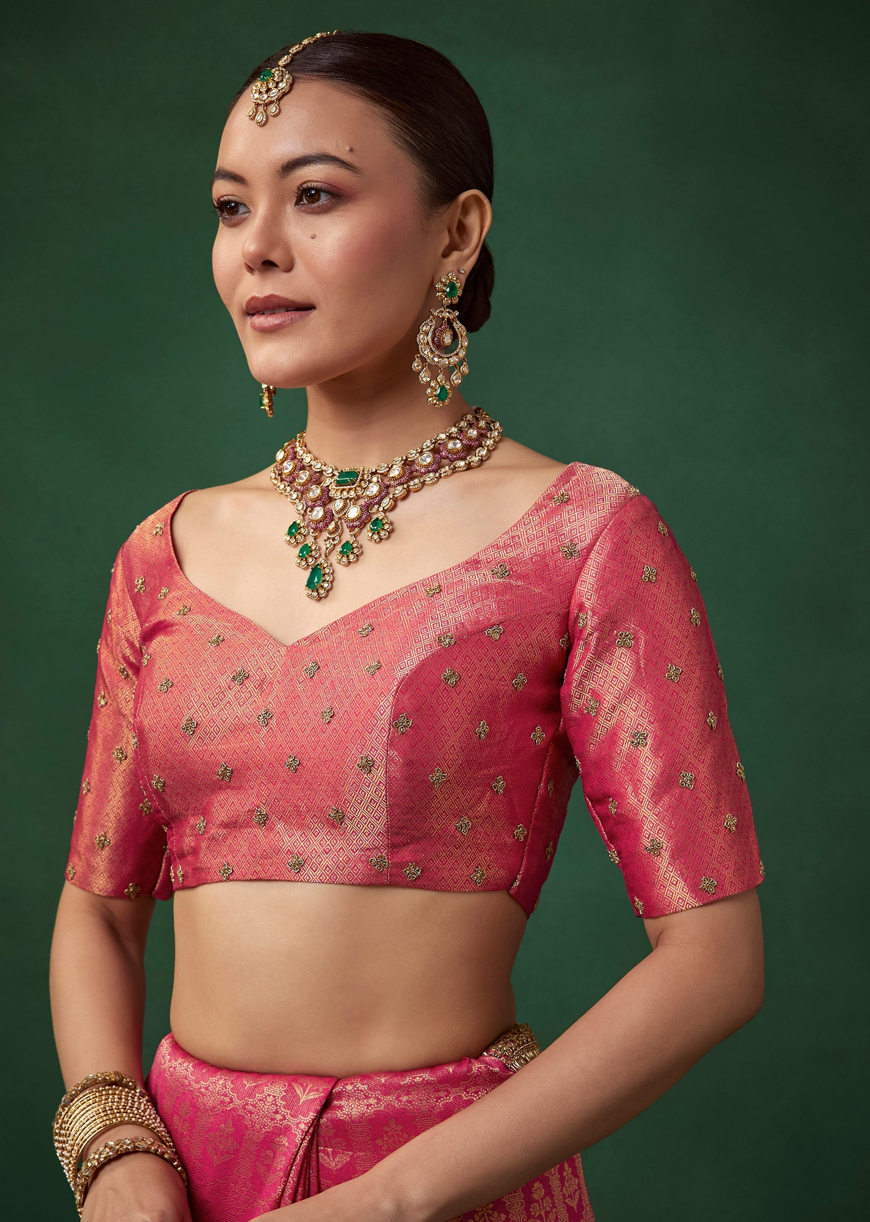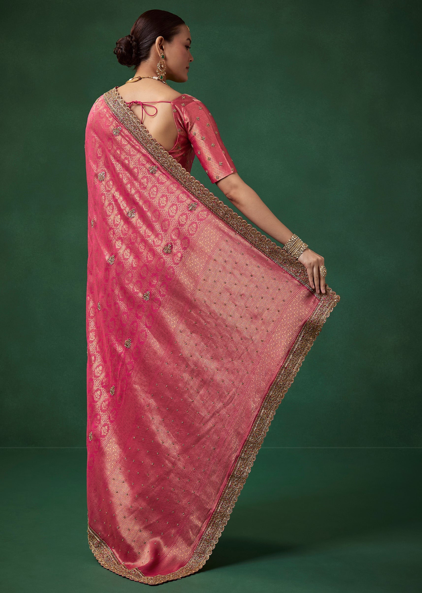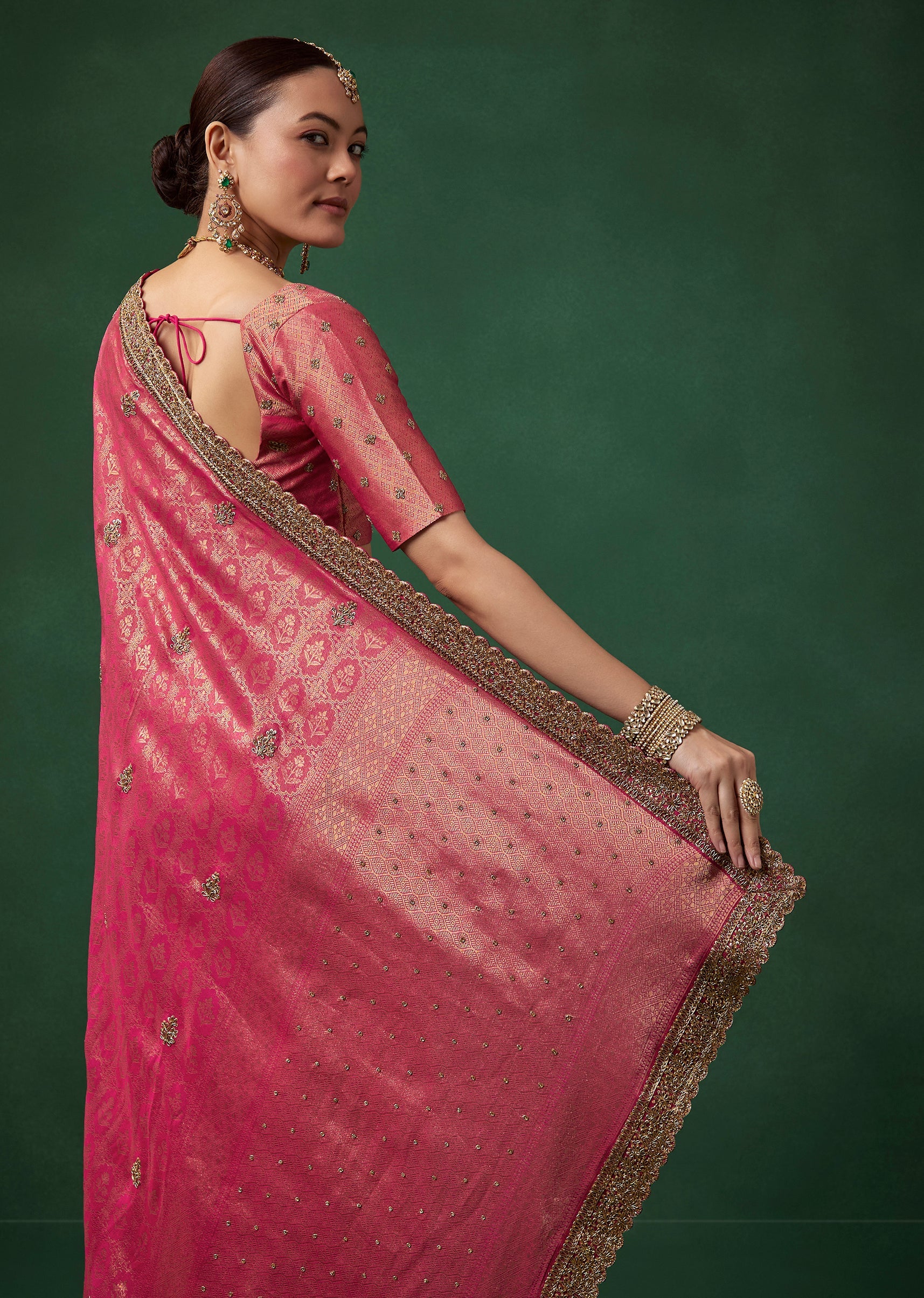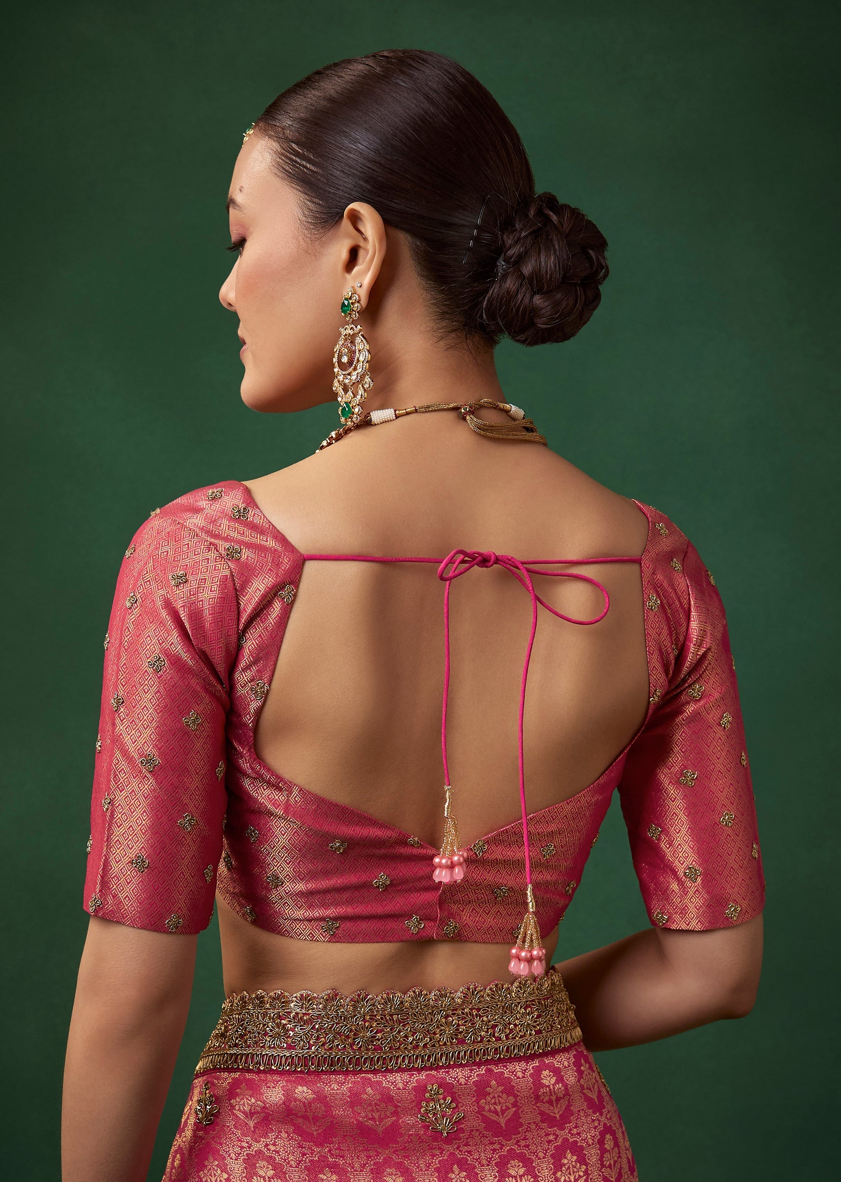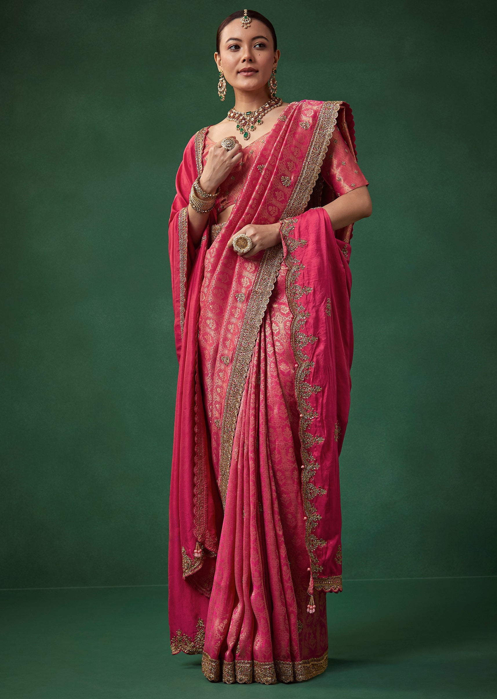 Pair it with antique gold or kundan jewelry, a classic bun, and bold kohl eyes to complement its rich magenta and gold detailing.