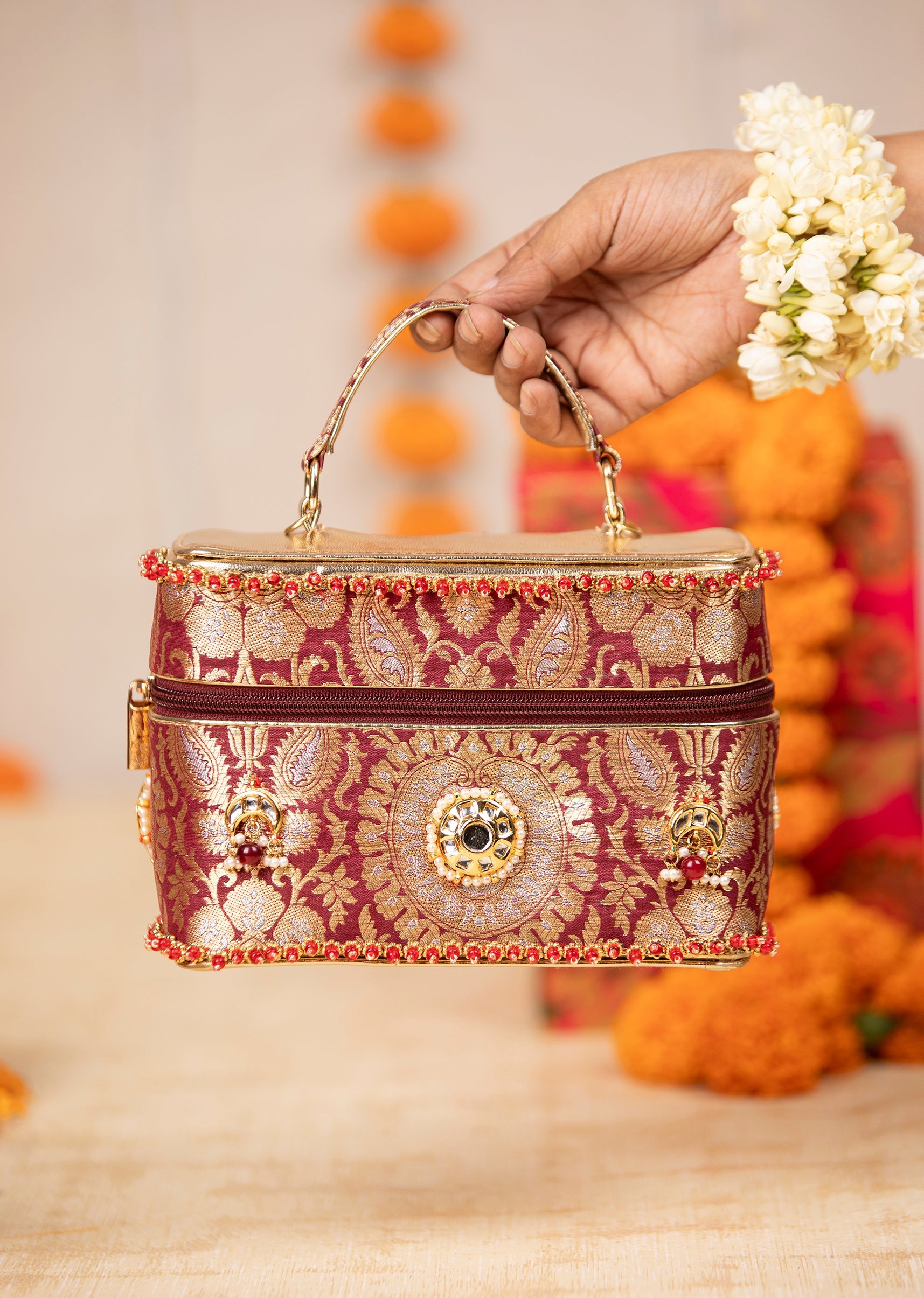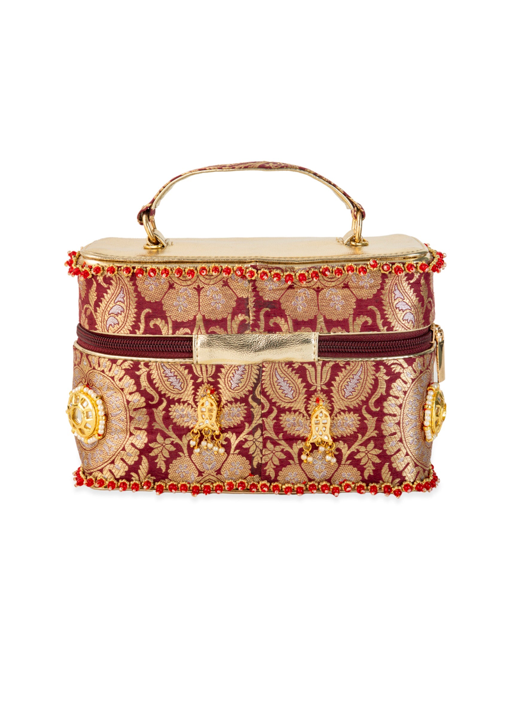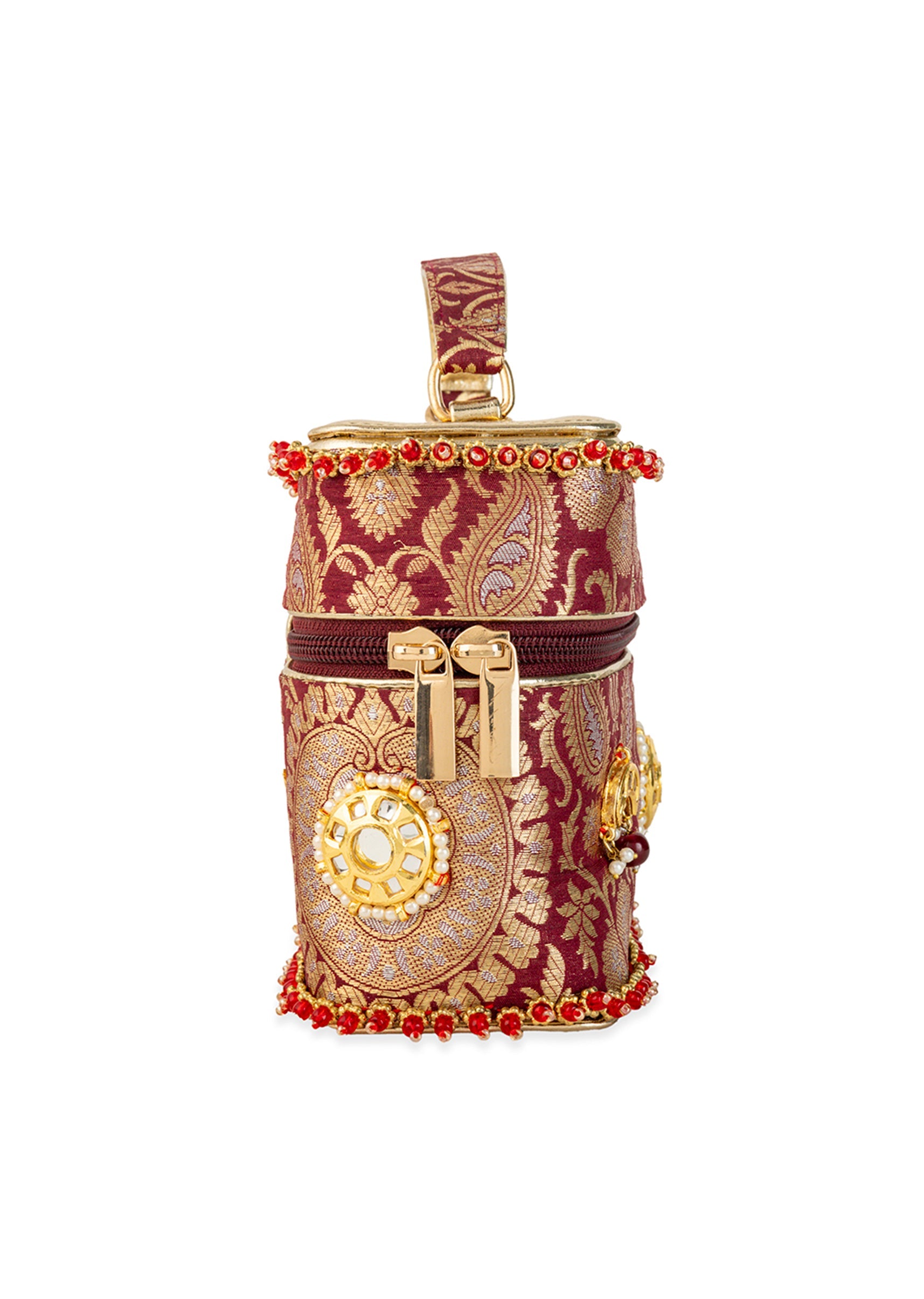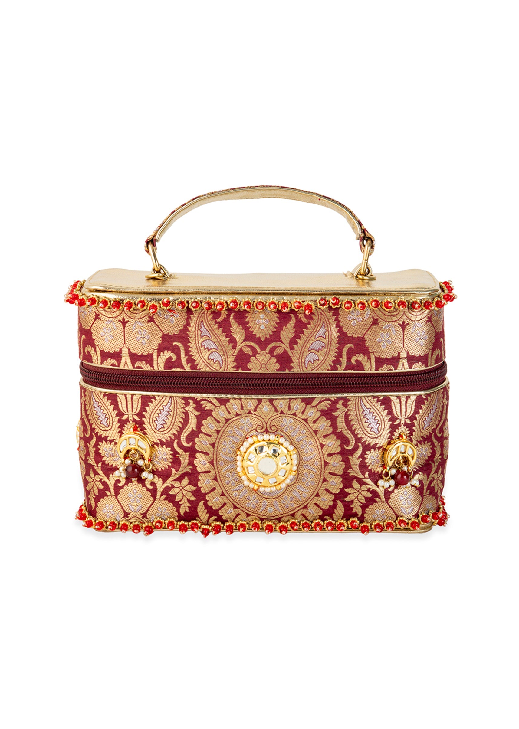 Make a statement at every celebration with this maroon and gold bag, adorned with intricate golden motifs that exude rich traditional elegance. The silk brocade base paired with Kundan embellishments adds a luxurious sparkle perfect for weddings and festive occasions. Compact yet eye catching, it elevates any ethnic ensemble with its regal charm. Awarded as the Most Trusted Brand, we're delivering styles you love, just as promised.