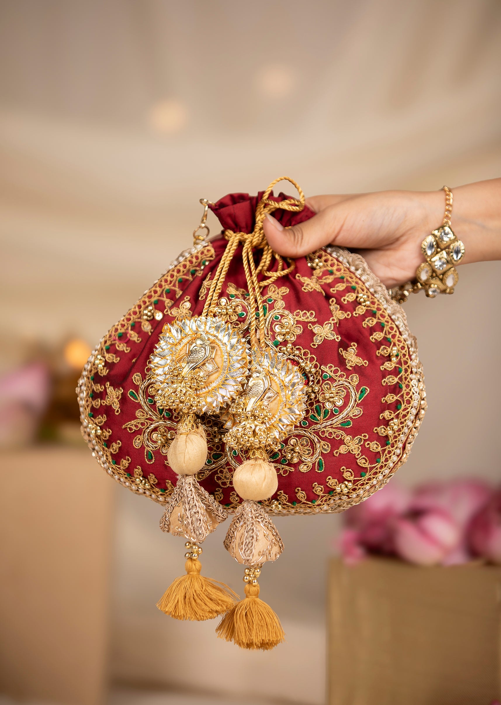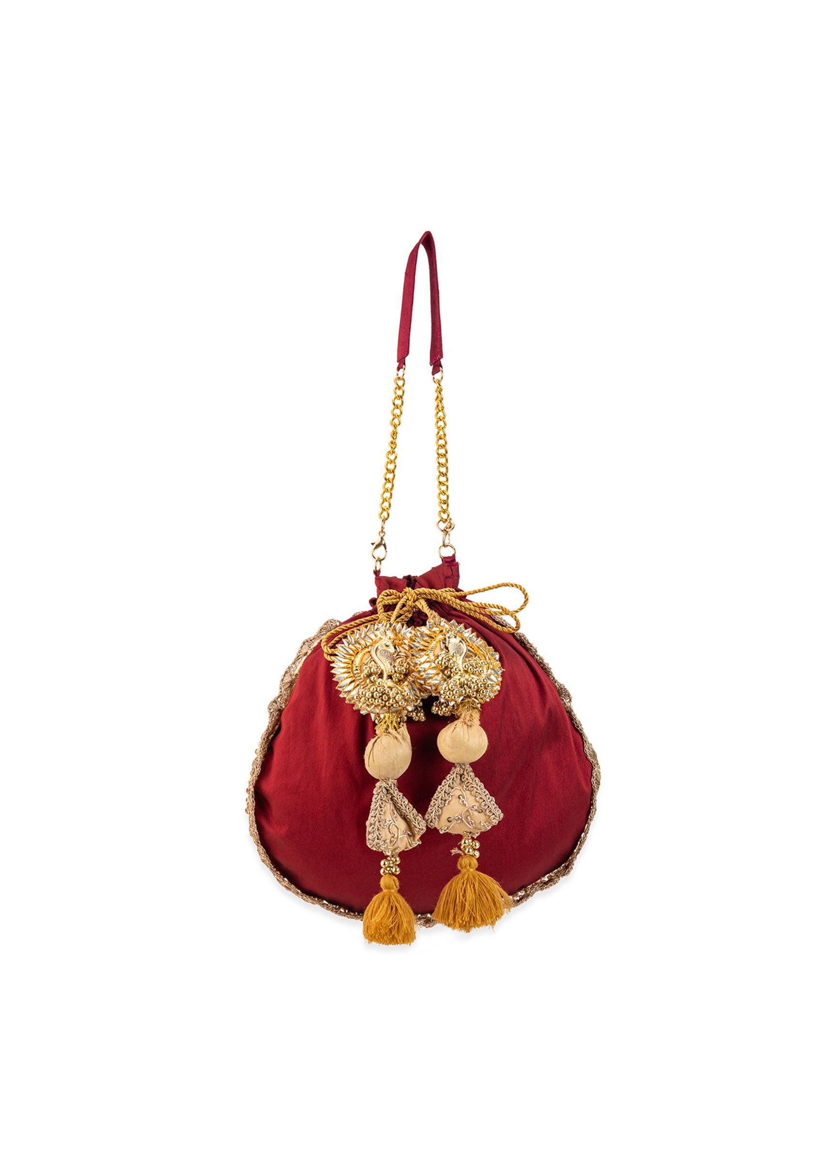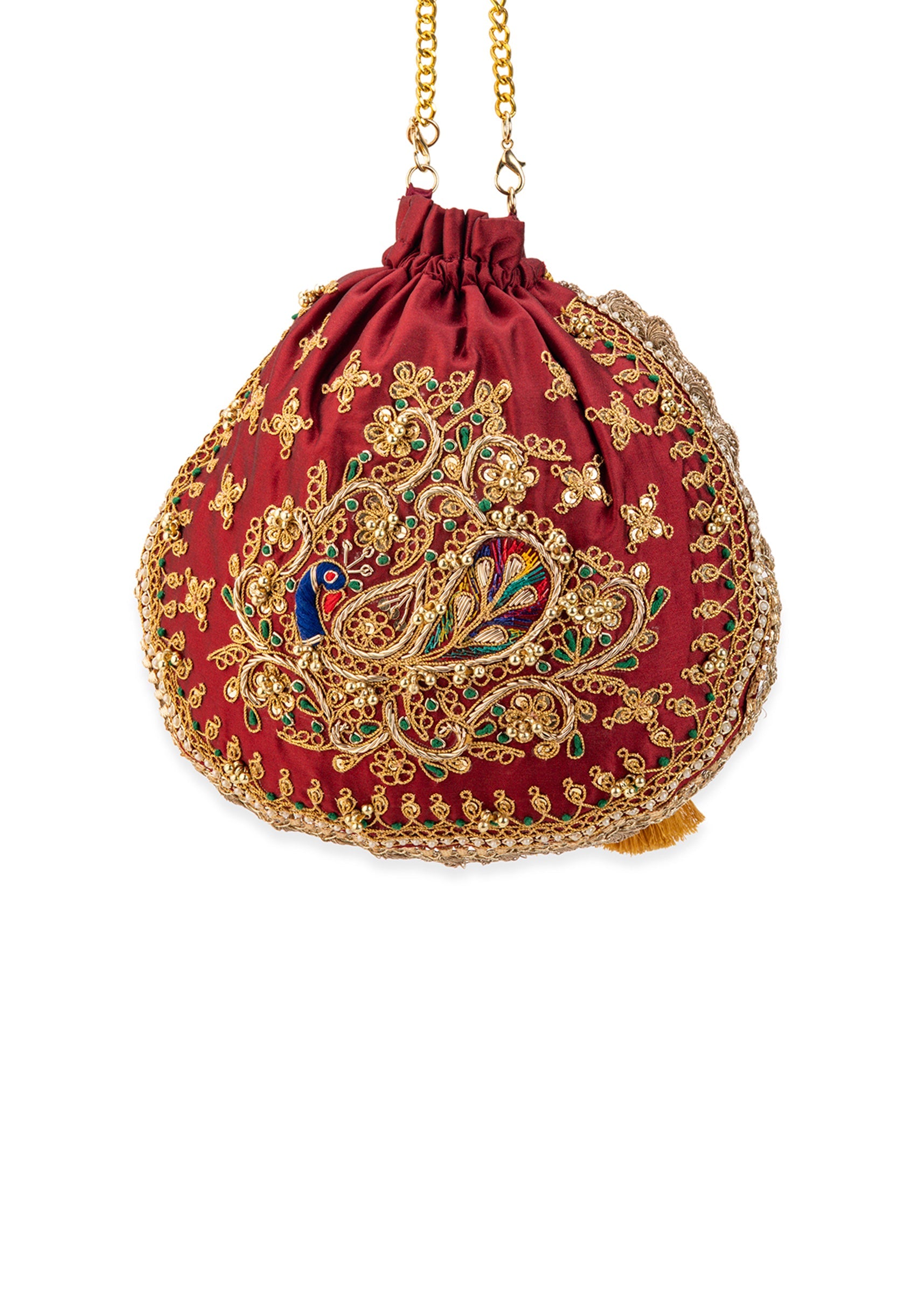 Maroon and Gold Silk Peacock Motif Embroidered Potli Bag