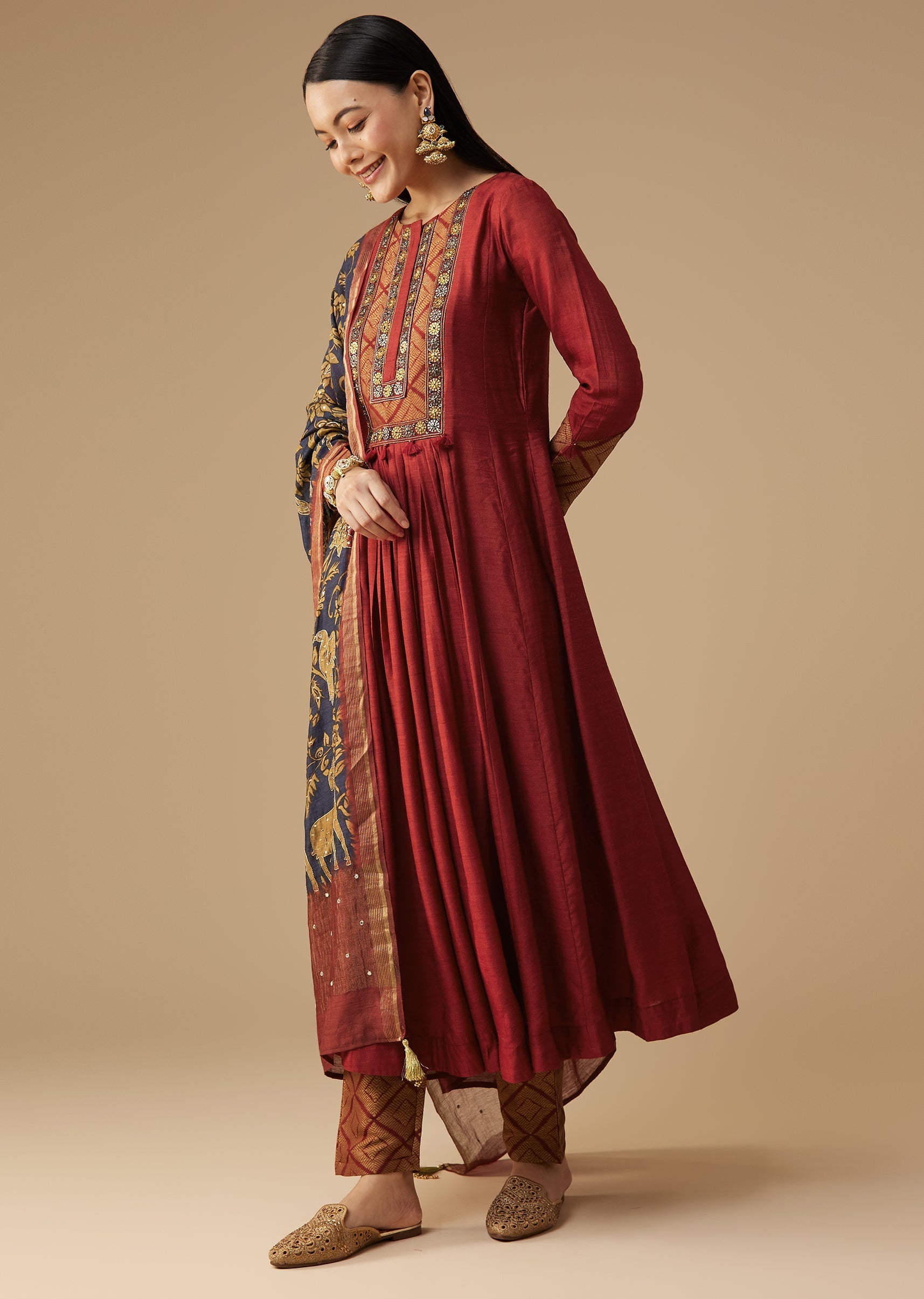 Ensure the anarkali fits smoothly at the shoulders and bust so the flare falls evenly, and choose a comfortable waist fit for the brocade pants to maintain structure.