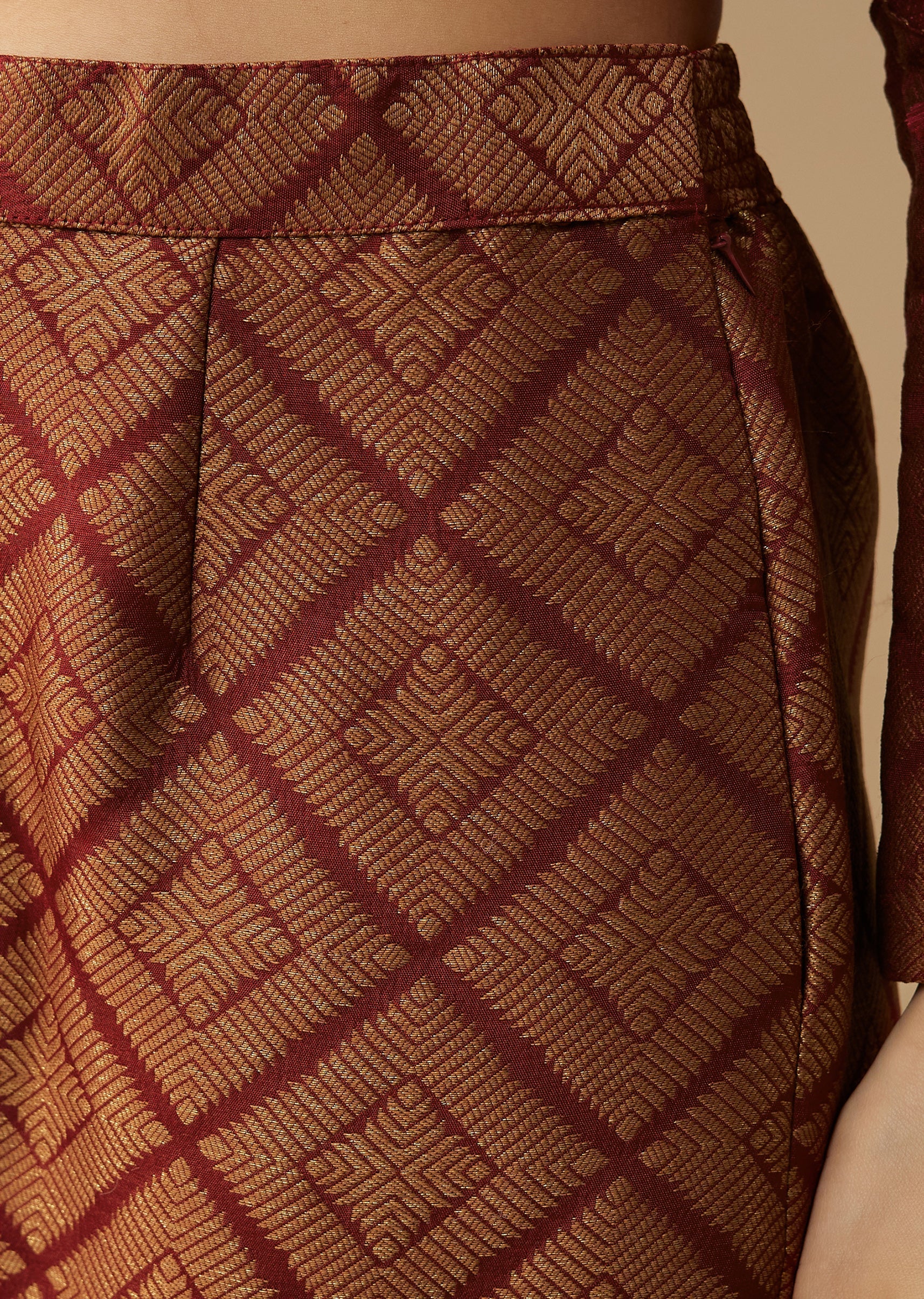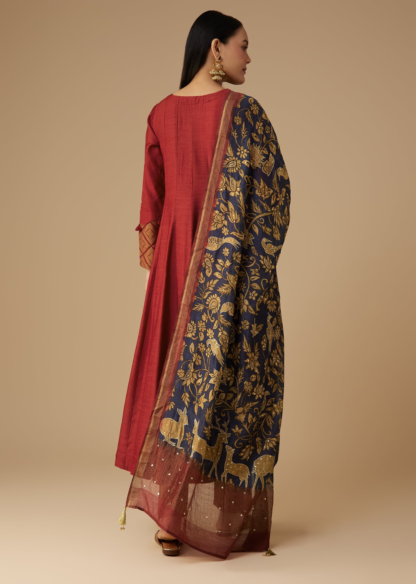 Pair with gold jhumkas and a classic bun to highlight the brocade’s intricate weave.