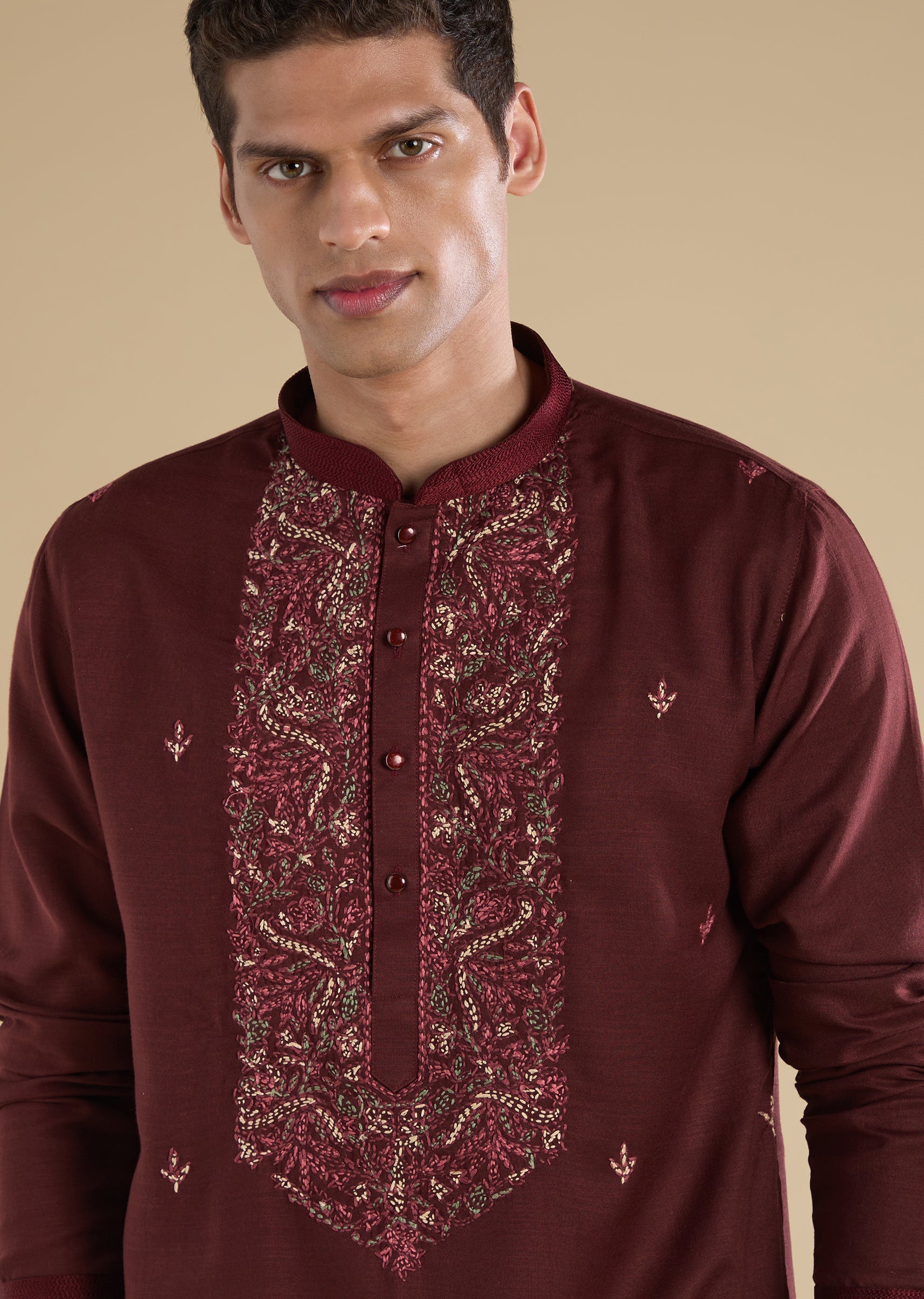 Rich and understated, this maroon kurta set brings a classic touch to casual traditional dressing. Designed with a mandarin collar, full sleeves, and minimal resham thread detailing, it offers a... More Product Details