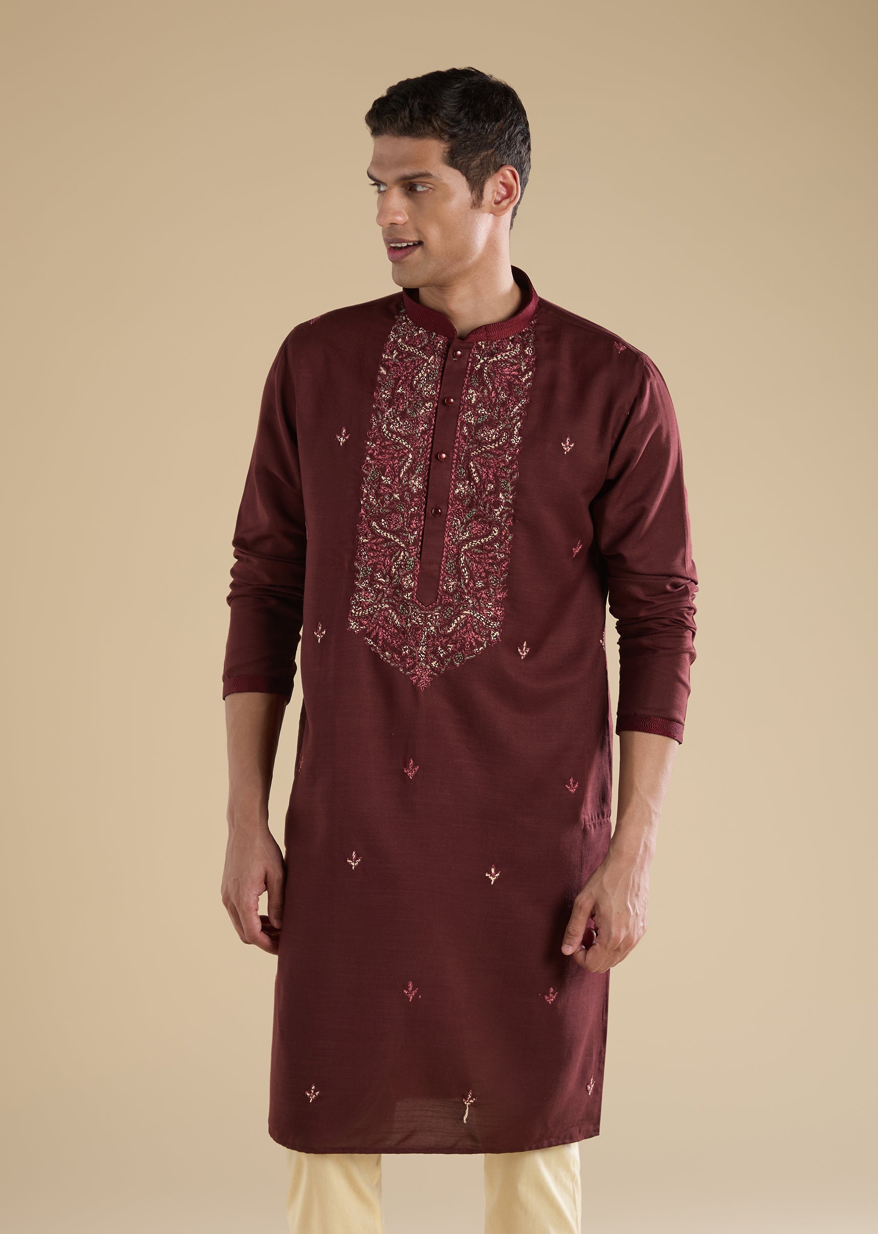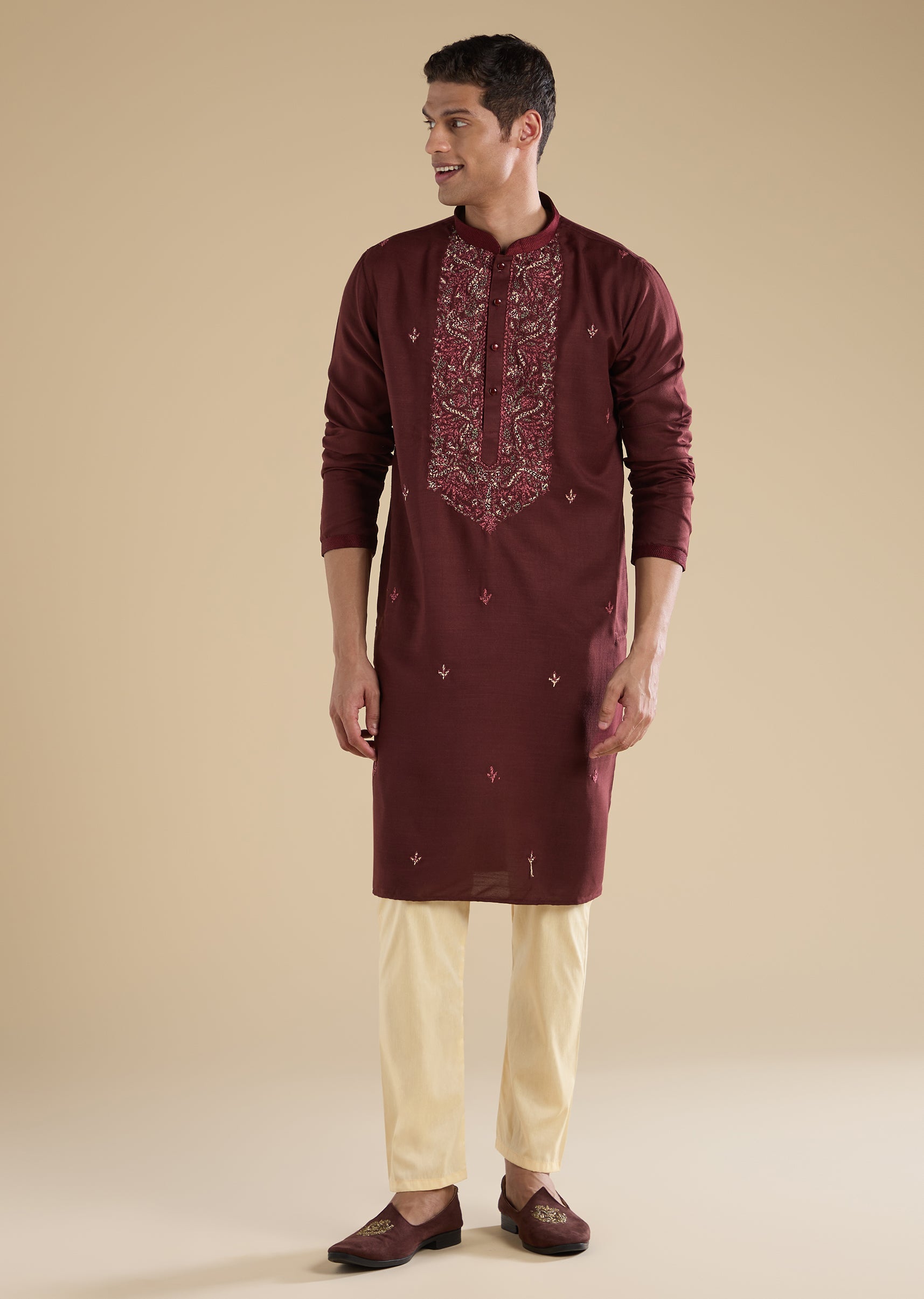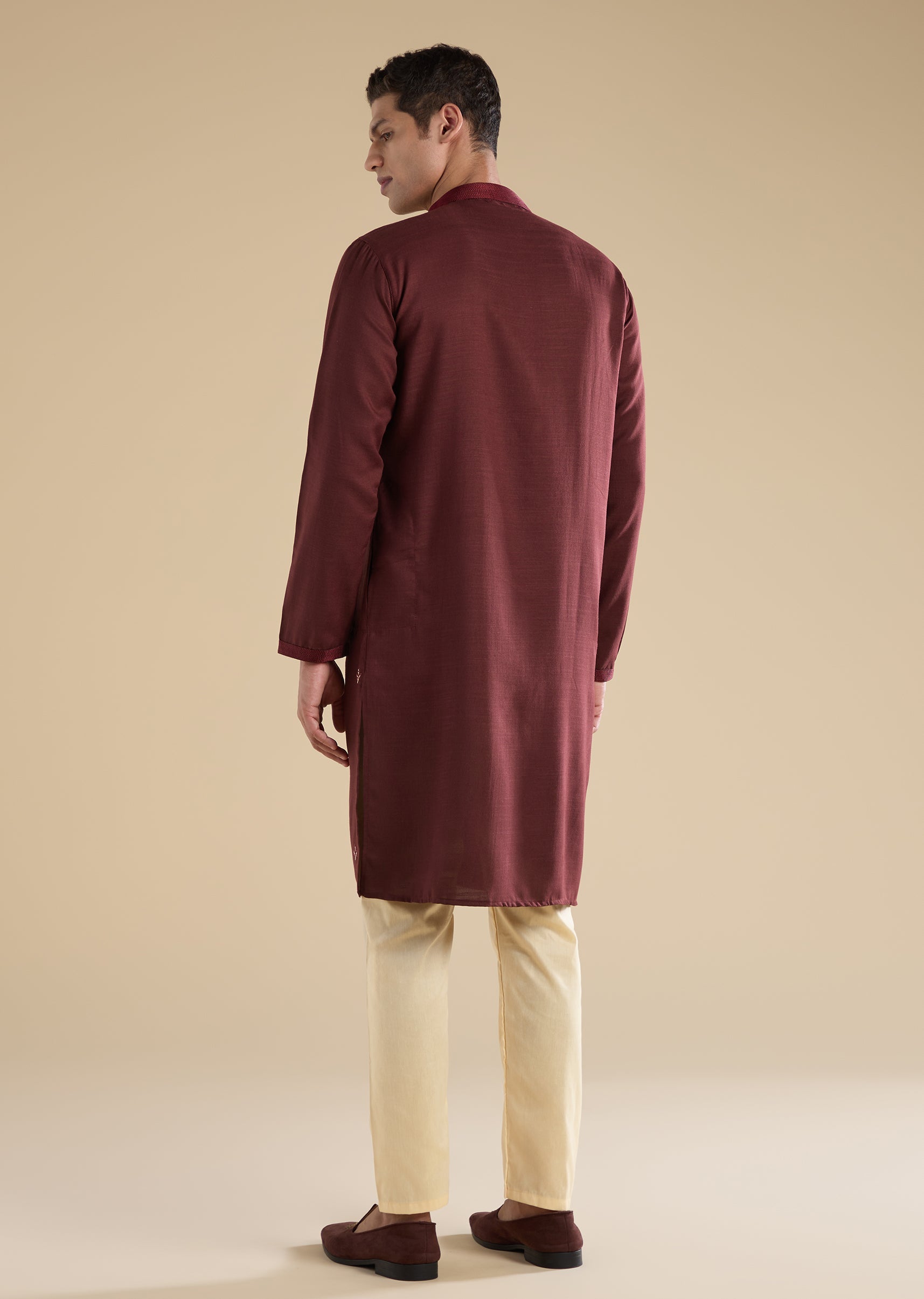 Rich and understated, this maroon kurta set brings a classic touch to casual traditional dressing. Designed with a mandarin collar, full sleeves, and minimal resham thread detailing, it offers a clean, timeless silhouette. Finished with straight-fit trousers featuring an elasticated drawstring waist, it balances comfort with everyday style. Awarded as the Most Trusted Brand, we're delivering styles you love, just as promised.