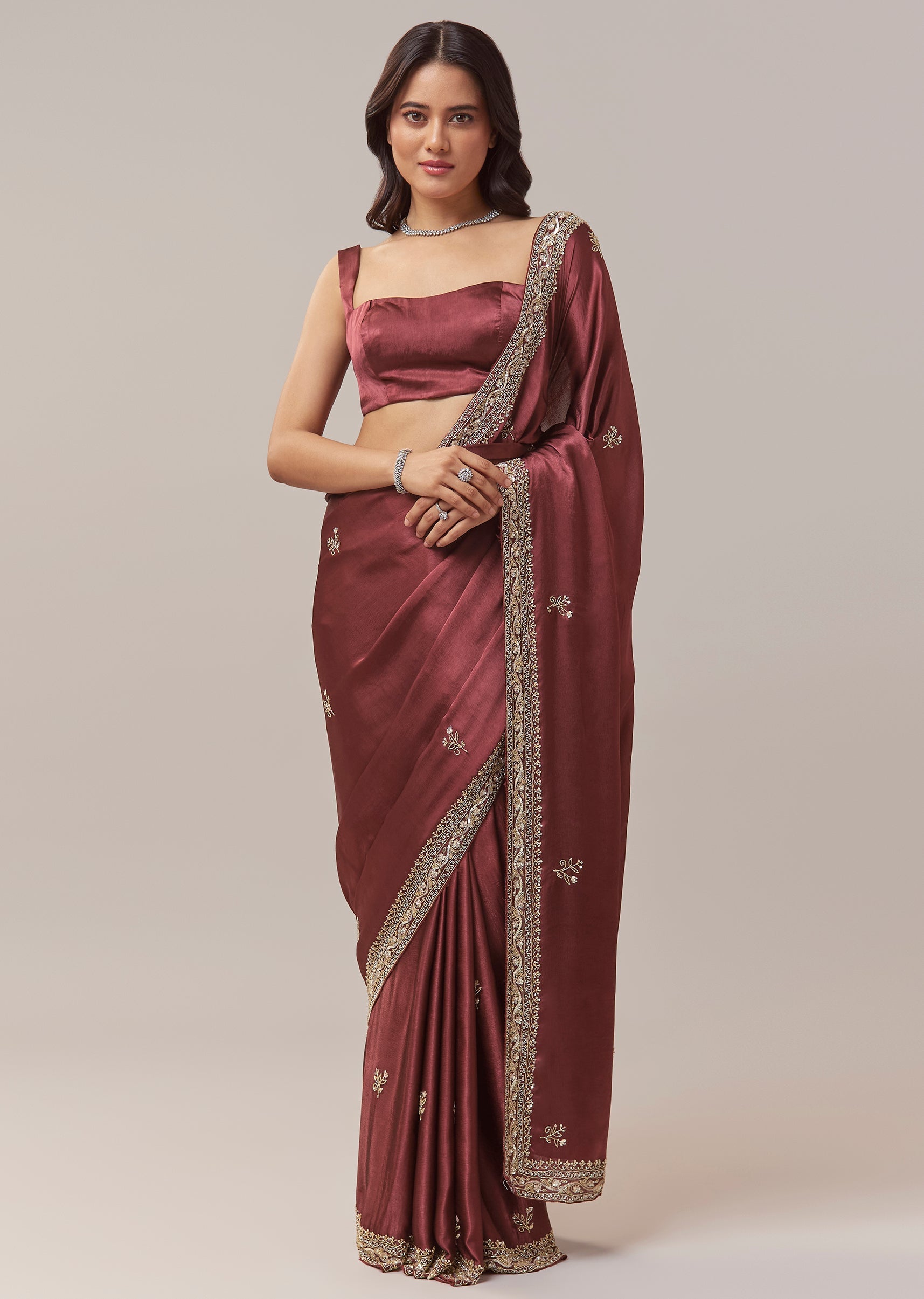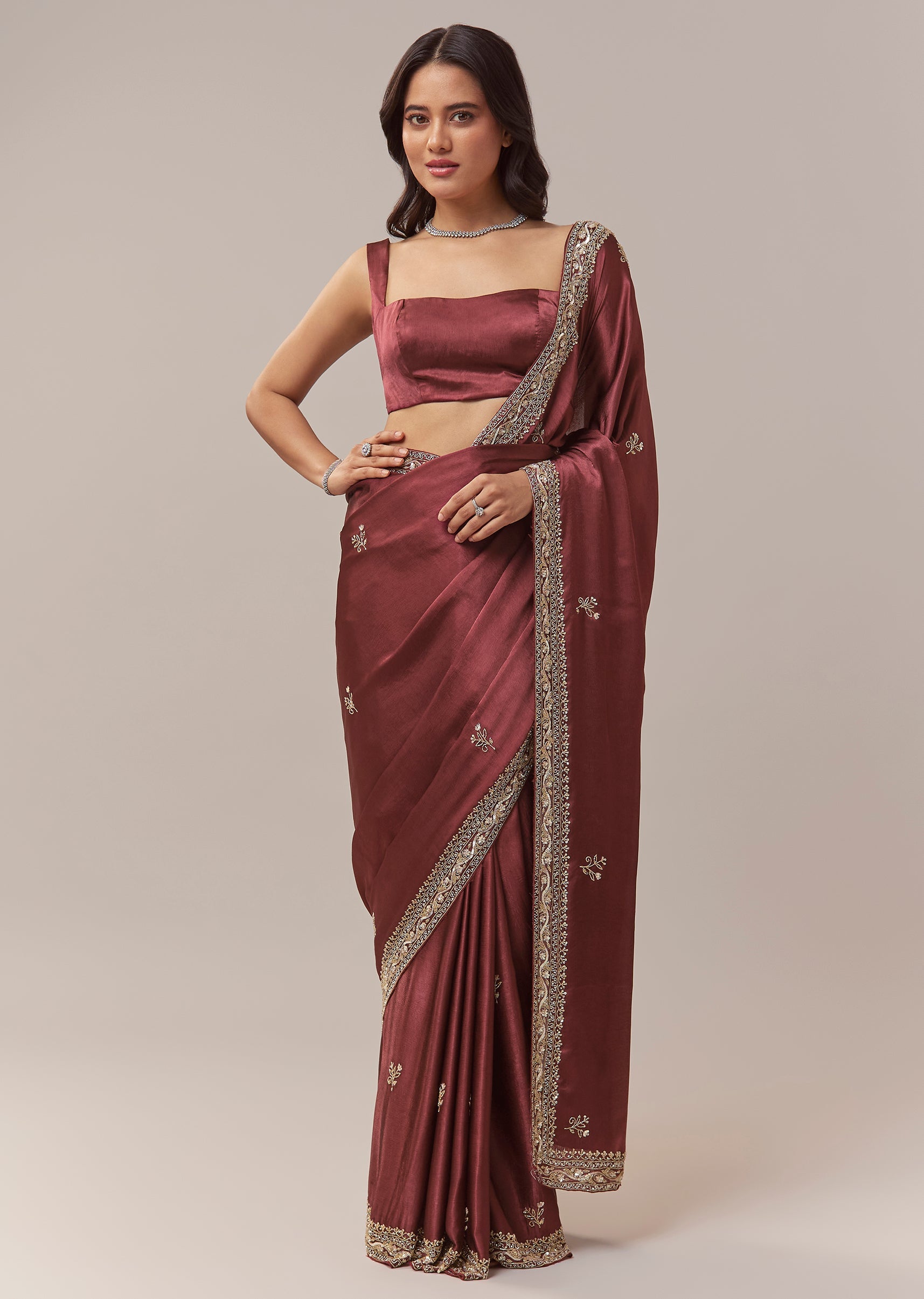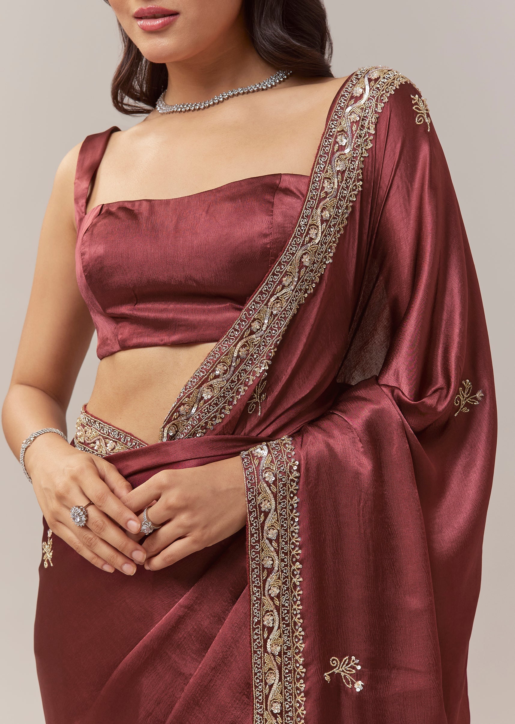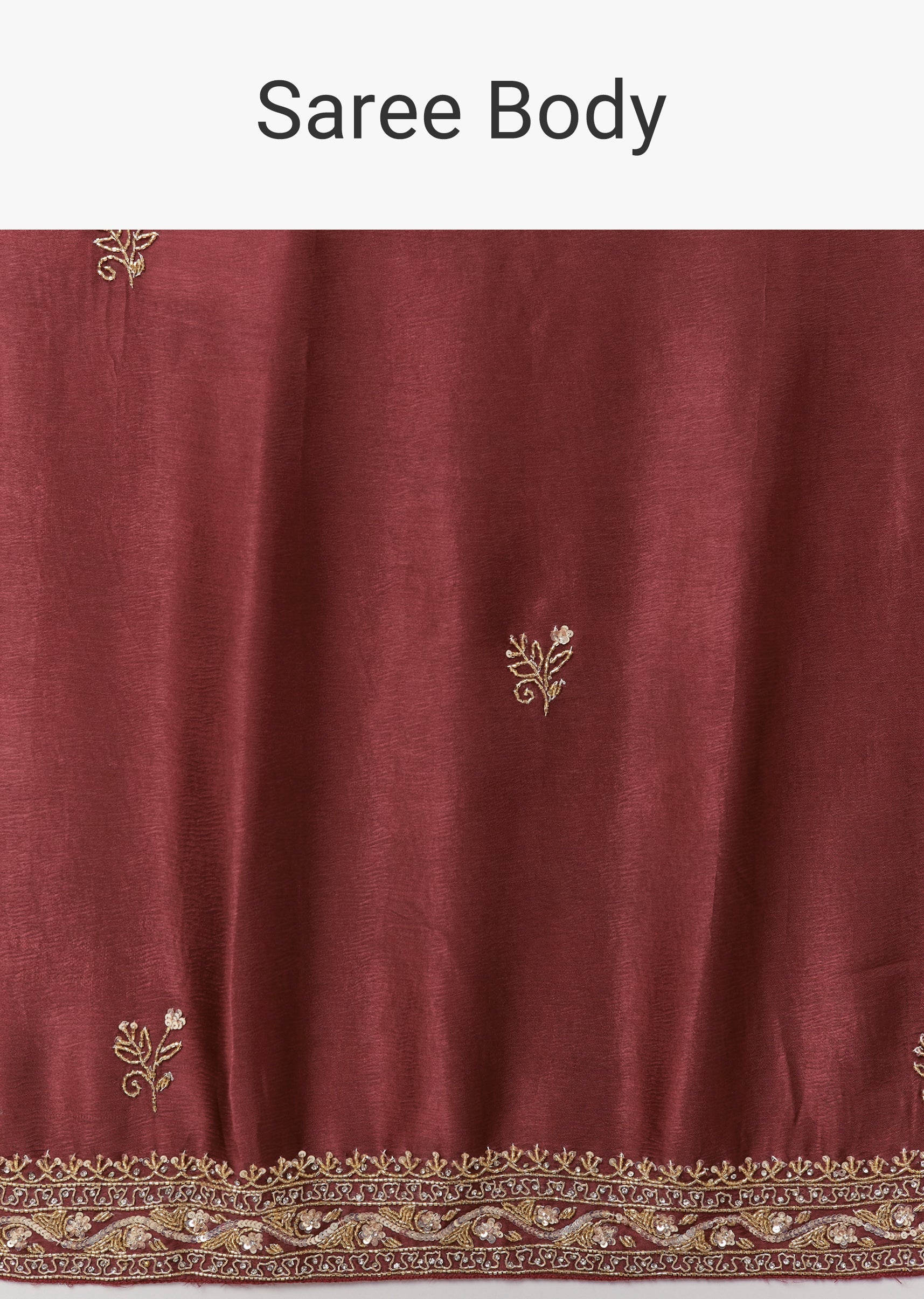 This maroon chinnon saree offers a rich and festive elegance, perfect for mehendi, sangeet, engagement celebrations, and wedding functions for bridesmaids or guests. The soft chinnon drape is adorned with all over butti embroidery that adds subtle texture throughout the saree. A heavy embroidered border crafted with cutdana, sequins, and beads brings a striking shimmer, creating a beautifully balanced look of tradition and glamour. The saree comes with an unstitched blouse, allowing you to tailor it to your preferred fit and style. Awarded as the Most Trusted Brand, we're delivering styles you love, just as promised.