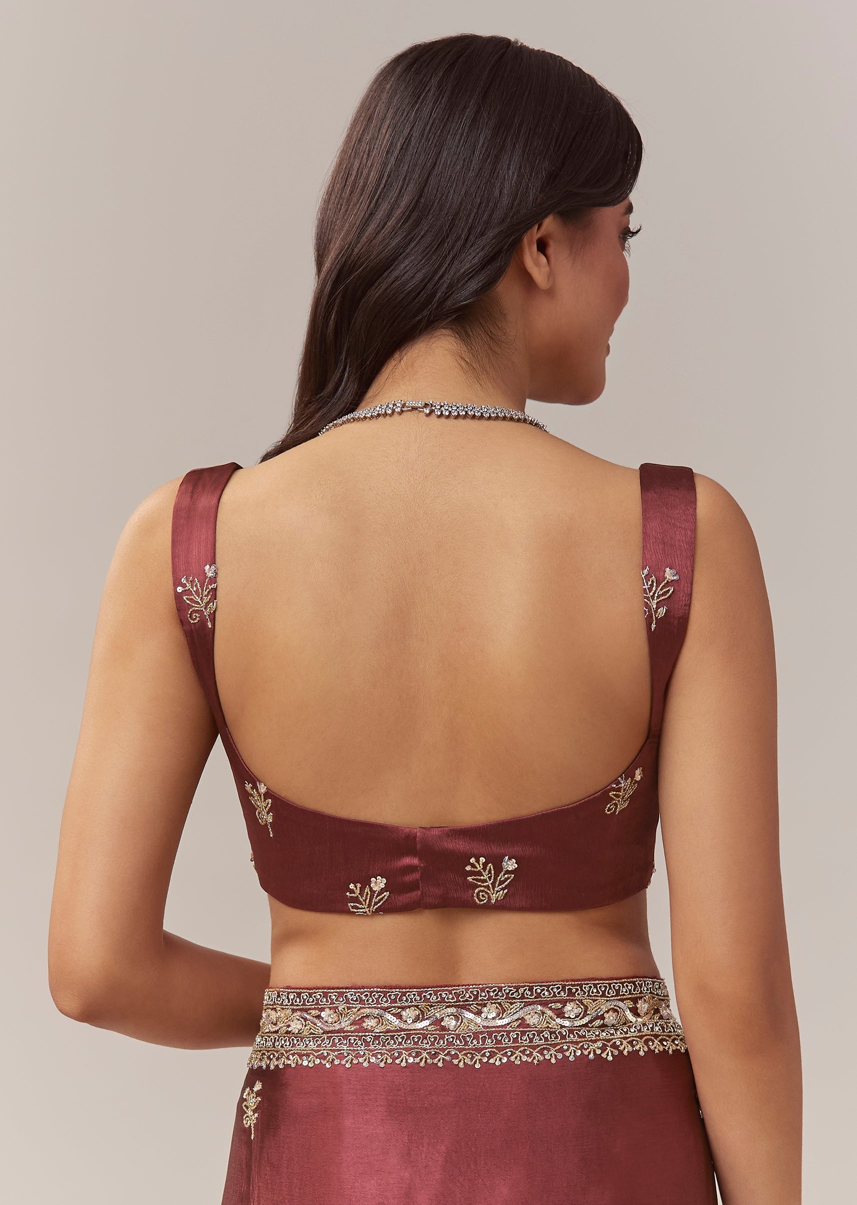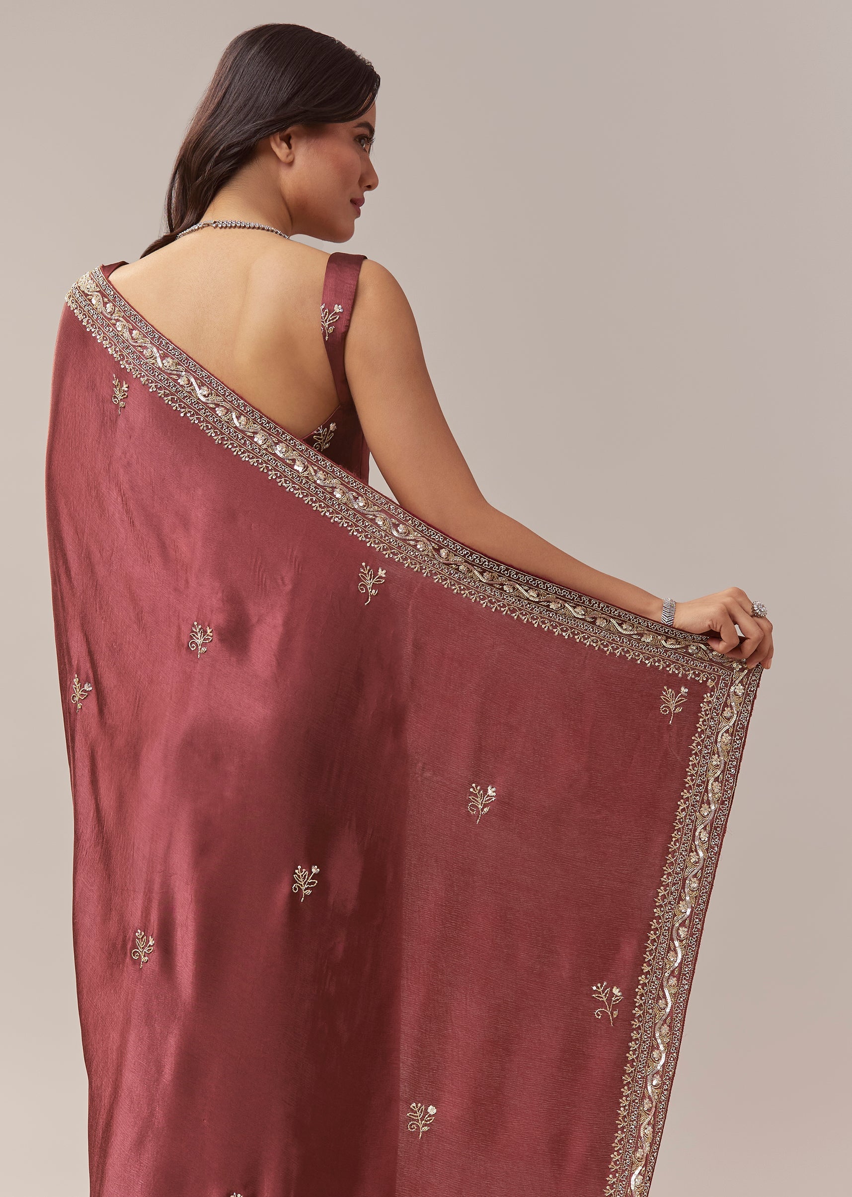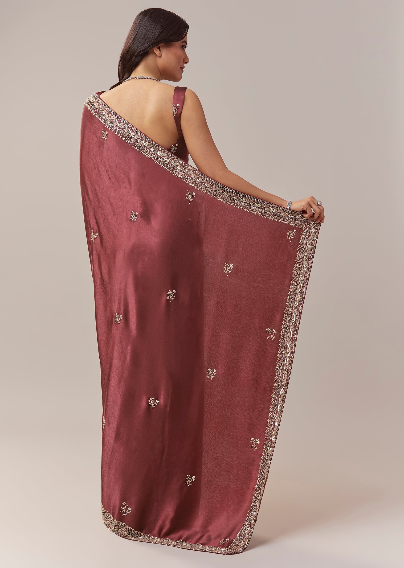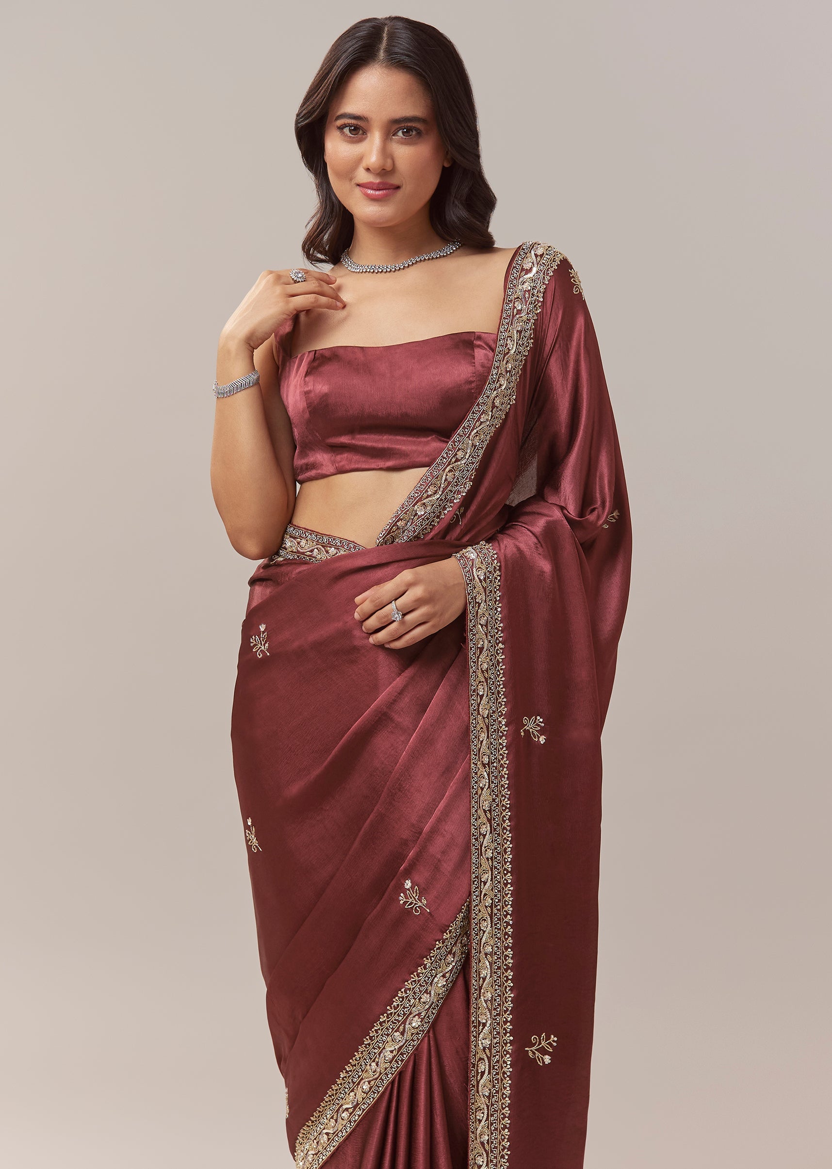 This maroon chinnon saree offers a rich and festive elegance, perfect for mehendi, sangeet, engagement celebrations, and wedding functions for bridesmaids or guests. The soft chinnon drape is adorned with all over butti embroidery that adds subtle texture throughout the saree. A heavy embroidered border crafted with cutdana, sequins, and beads brings a striking shimmer, creating a beautifully balanced look of tradition and glamour. The saree comes with an unstitched blouse, allowing you to tailor it to your preferred fit and style. Awarded as the Most Trusted Brand, we're delivering styles you love, just as promised.