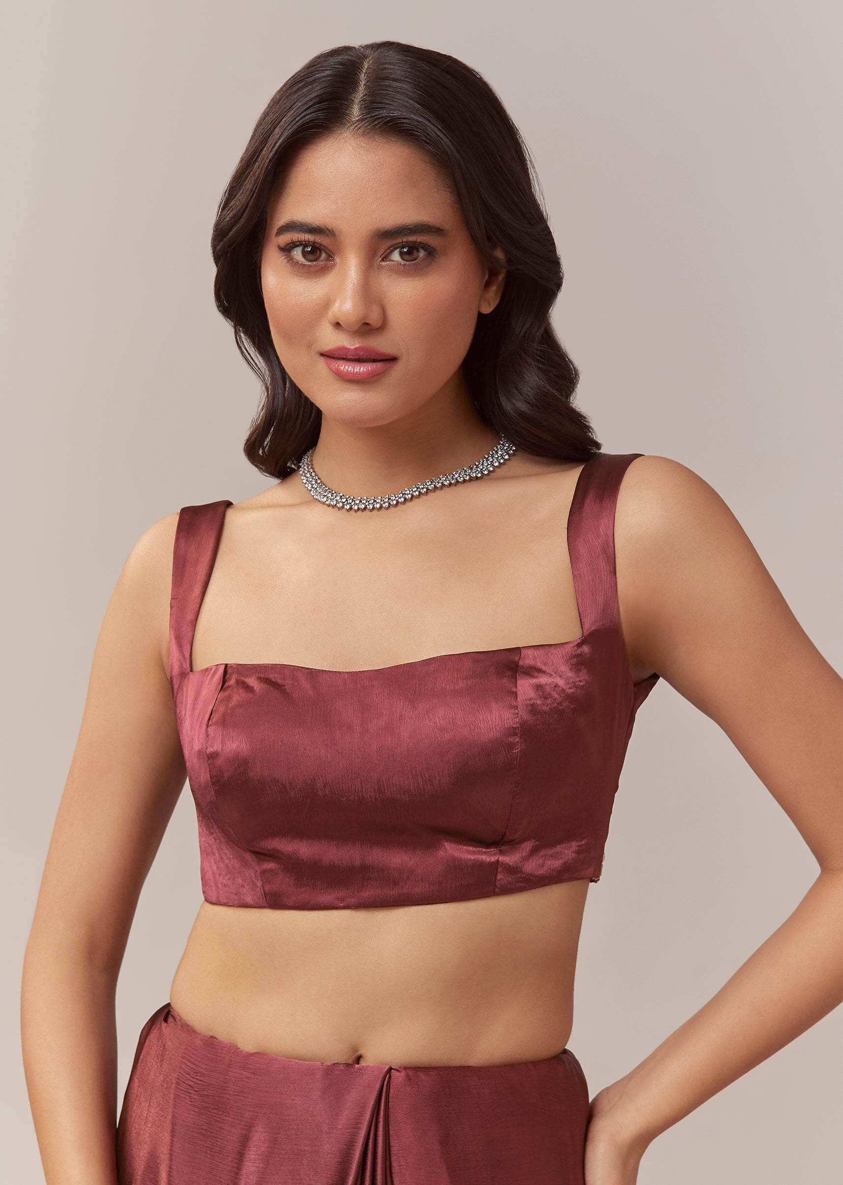 This maroon chinnon saree offers a rich and festive elegance, perfect for mehendi, sangeet, engagement celebrations, and wedding functions for bridesmaids or guests. The soft chinnon drape is adorned with... More Product Details