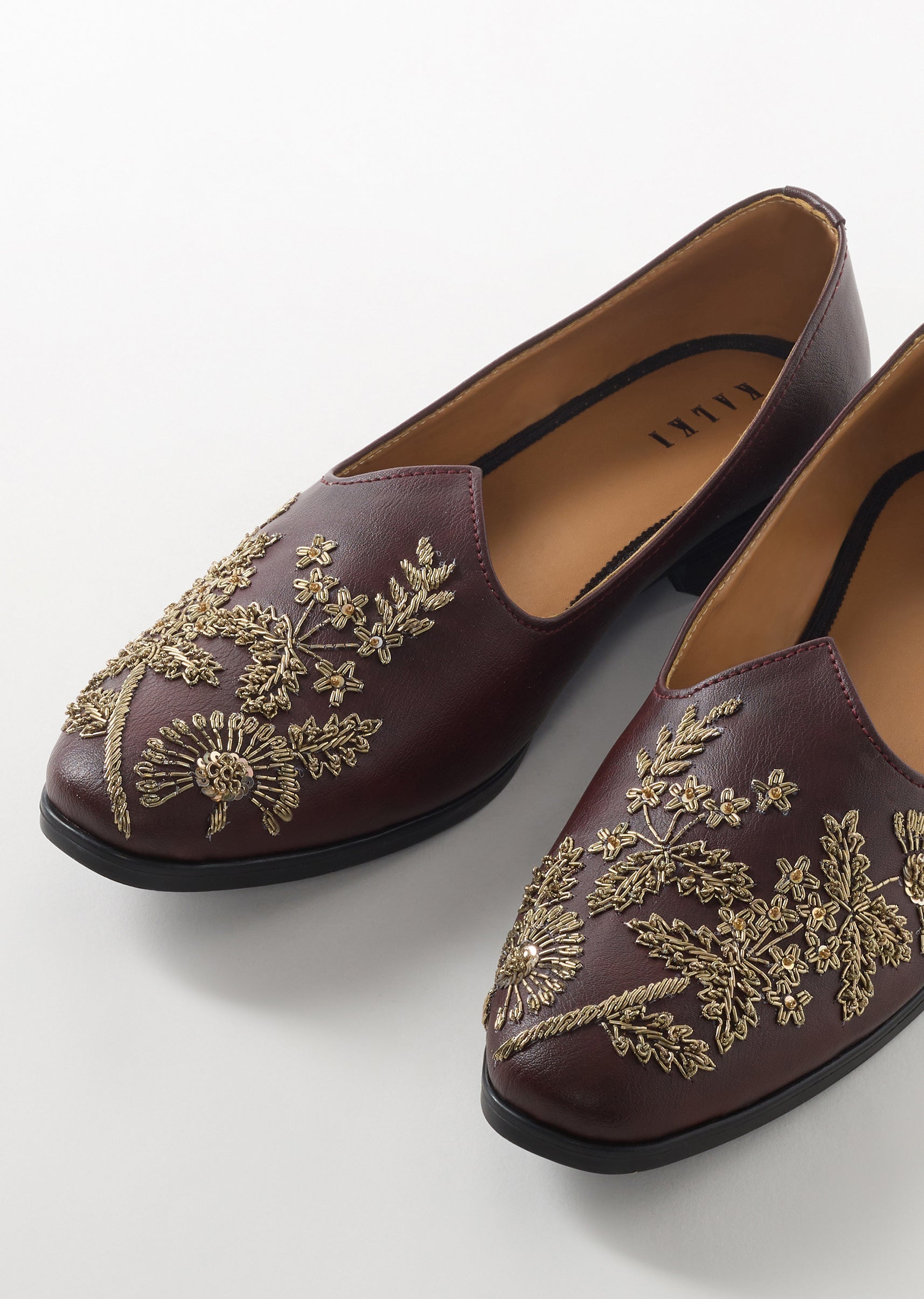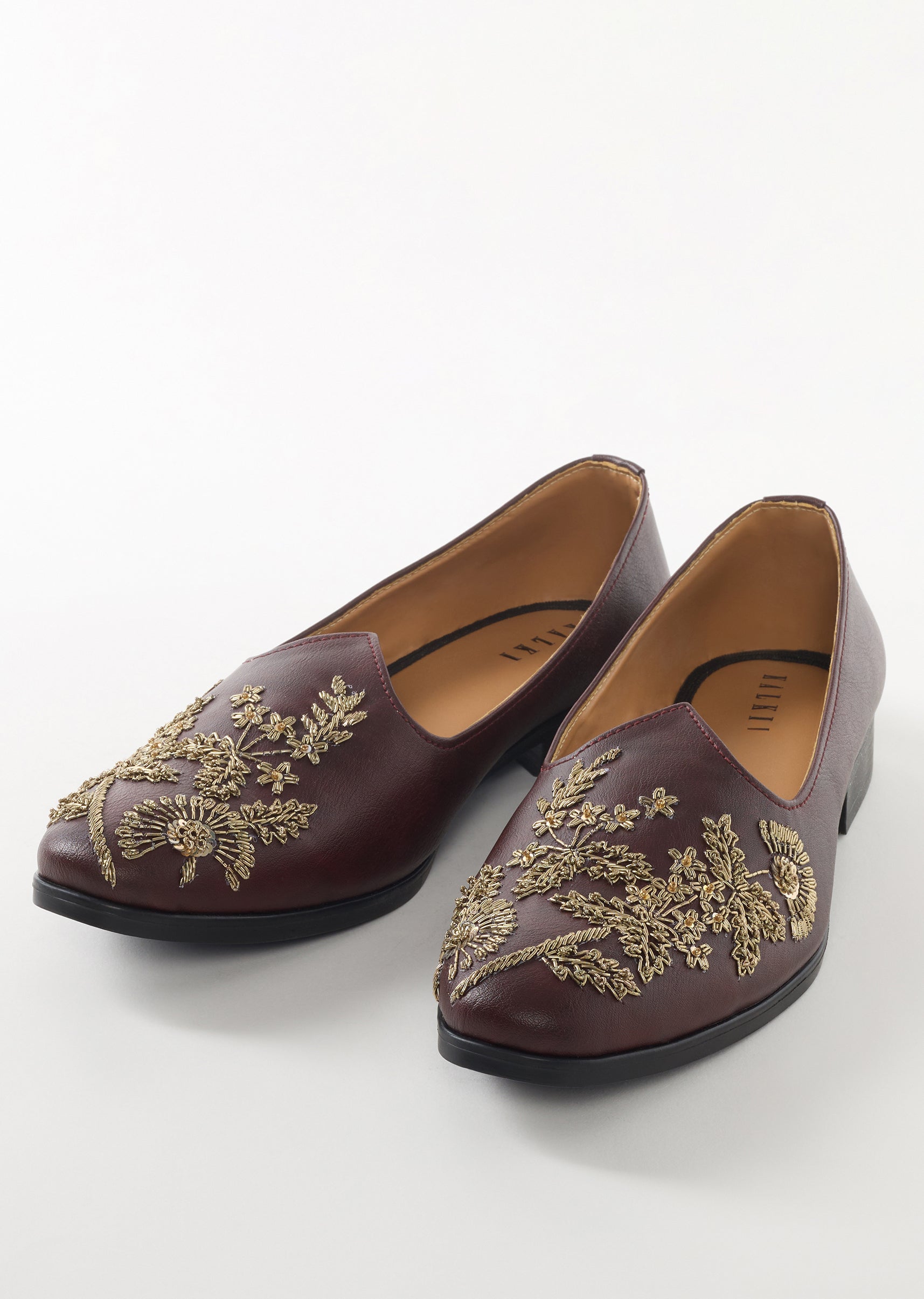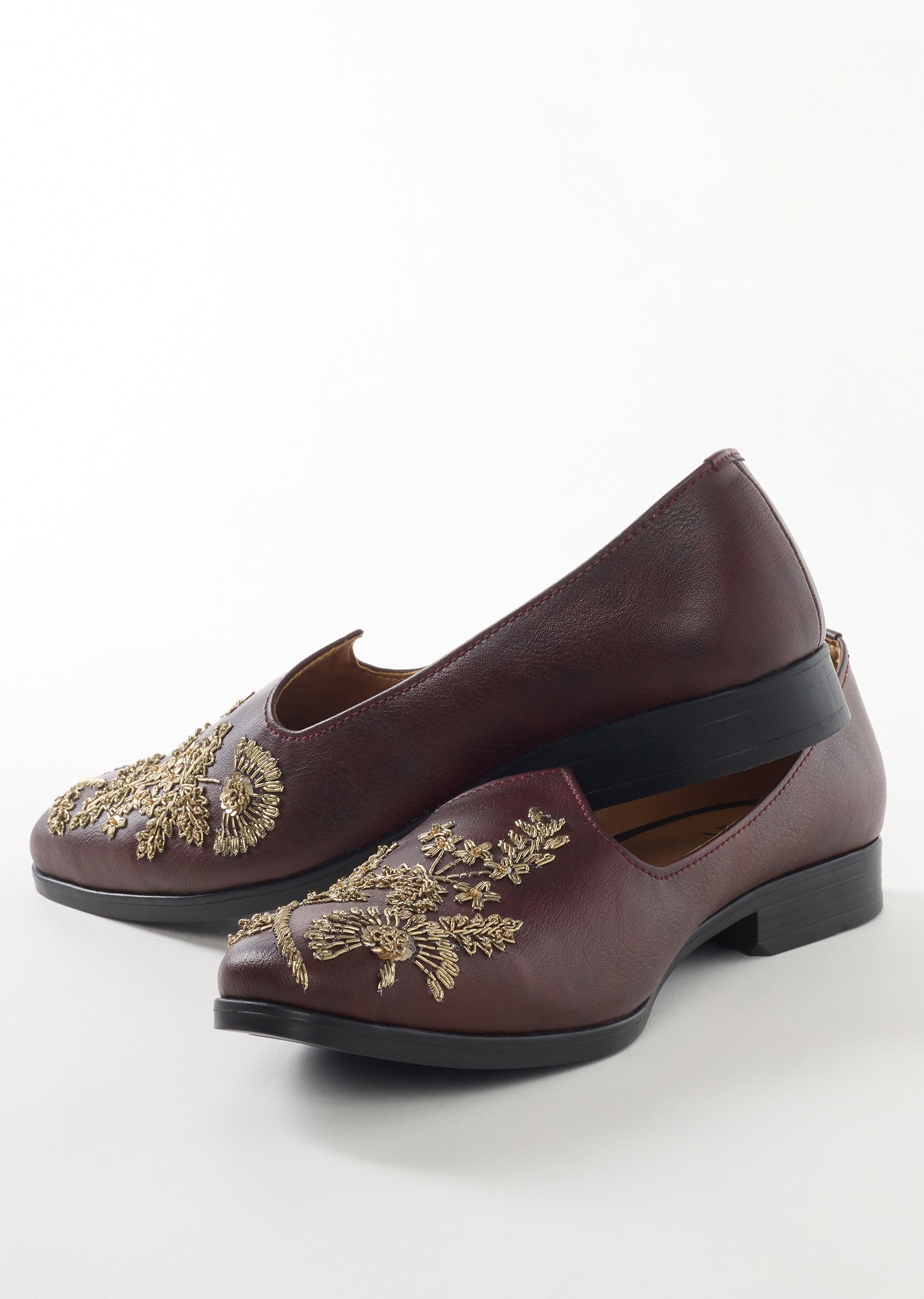 These maroon ethnic juttis feature intricate golden embroidery that creates a rich and festive look. The faux leather base with embroidery detailing adds elegance while ensuring comfort and durability. Perfect... More Product Details