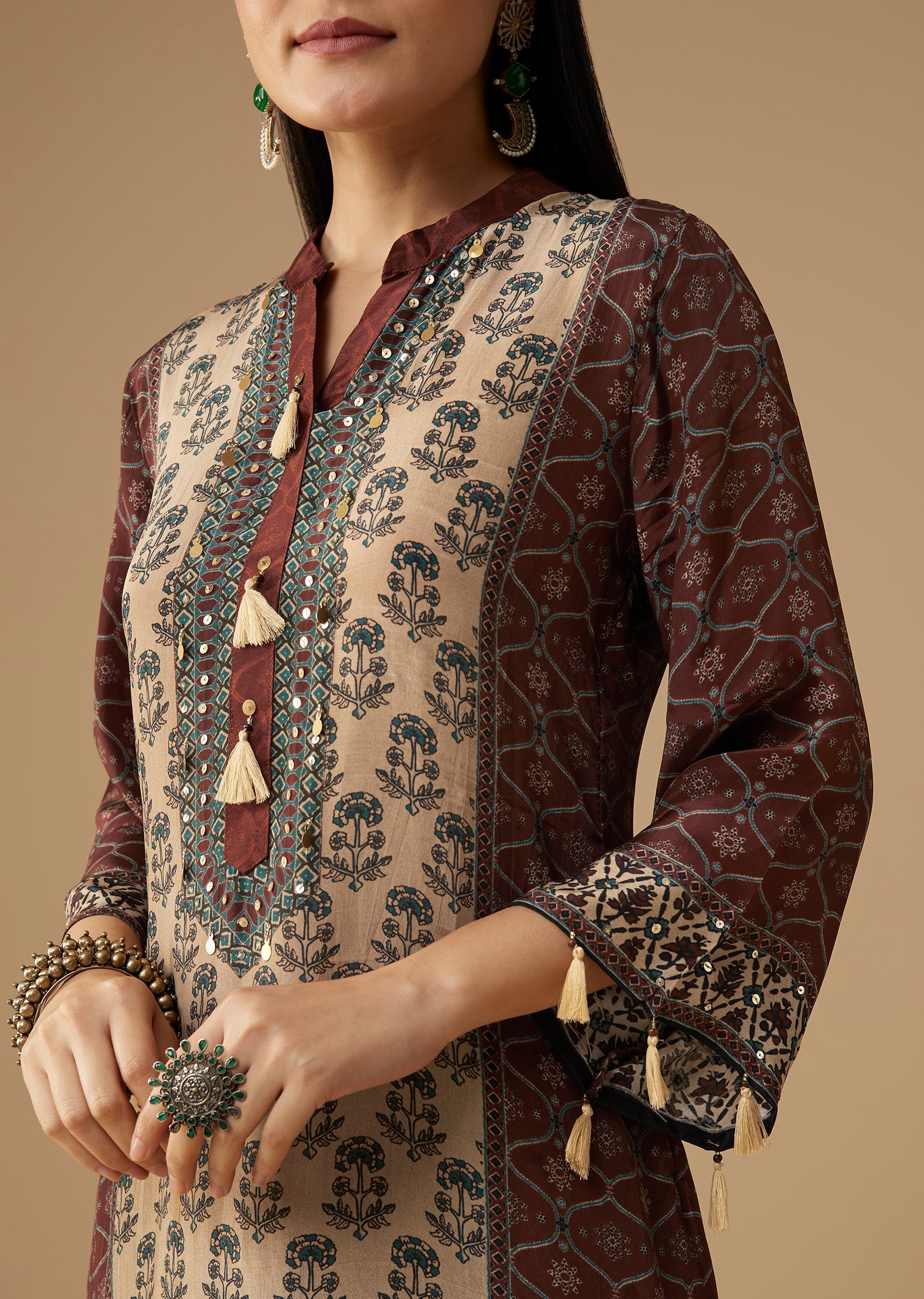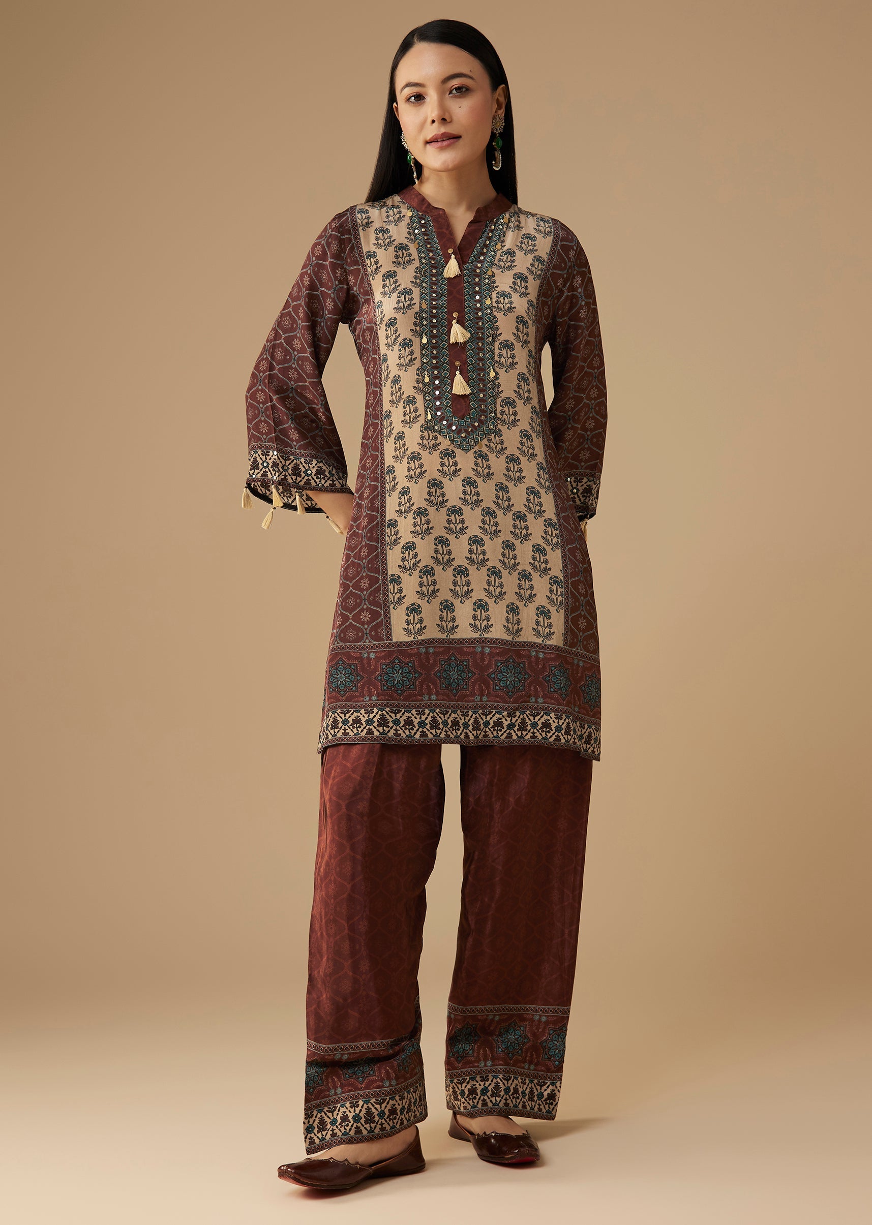 Infuse your everyday ethnic style with this maroon crepe kurta set, showcasing indie-inspired prints highlighted by subtle sequin work for a touch of sparkle. The soft crepe fabric drapes beautifully, offering both comfort and refined appeal, while the coordinated pants complete the look with effortless ease. Perfect for festive lunches, casual gatherings, or semi-formal events, this set brings together artistry and modern simplicity. Awarded as the Most Trusted Brand, we're delivering styles you love, just as promised.