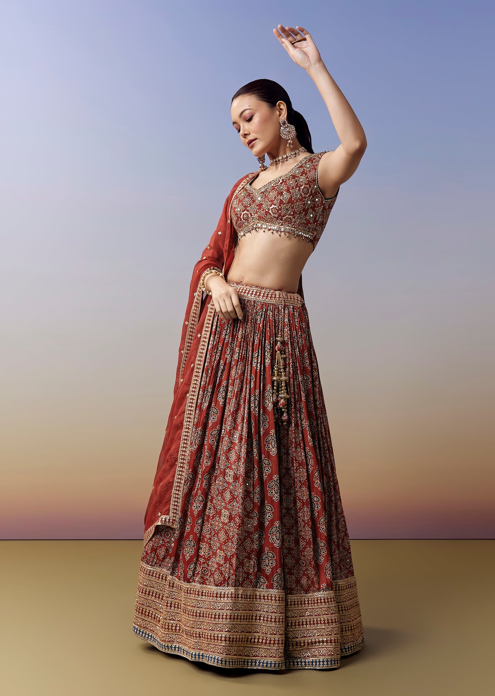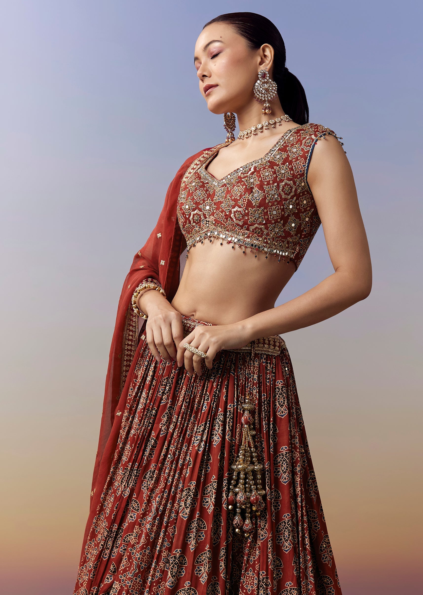 Maroon Lehenga With Ajrakh Print And Mirror Cut Dana Sequins Work
