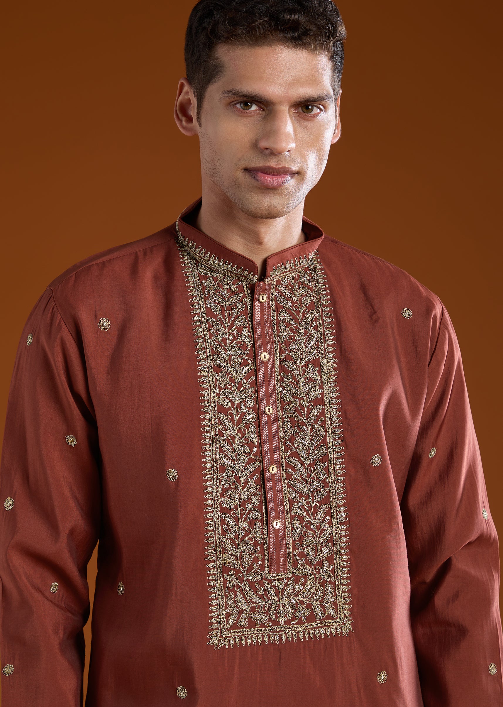 Rich and vibrant, this maroon red men’s kurta set in a color pop tone is perfect for pooja and festive occasions. Crafted in smooth silk fabric, it features detailed thread work that adds texture and traditional charm. The mandarin collar and full sleeves create a structured silhouette, making it ideal for festive gatherings and celebrations. Designed for comfort and style, this kurta set ensures a polished and standout presence during special occasions. Awarded as the Most Trusted Brand, we're delivering styles you love, just as promised.