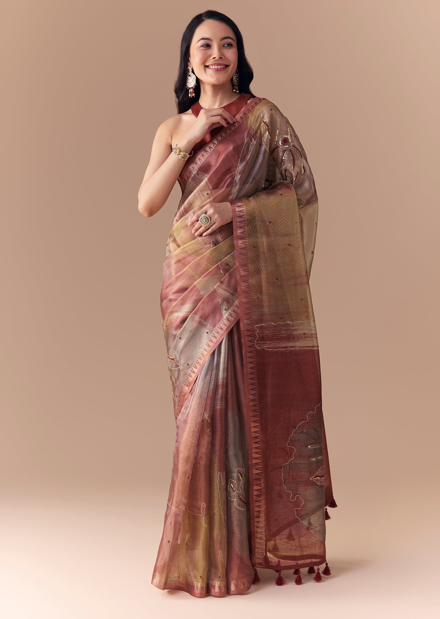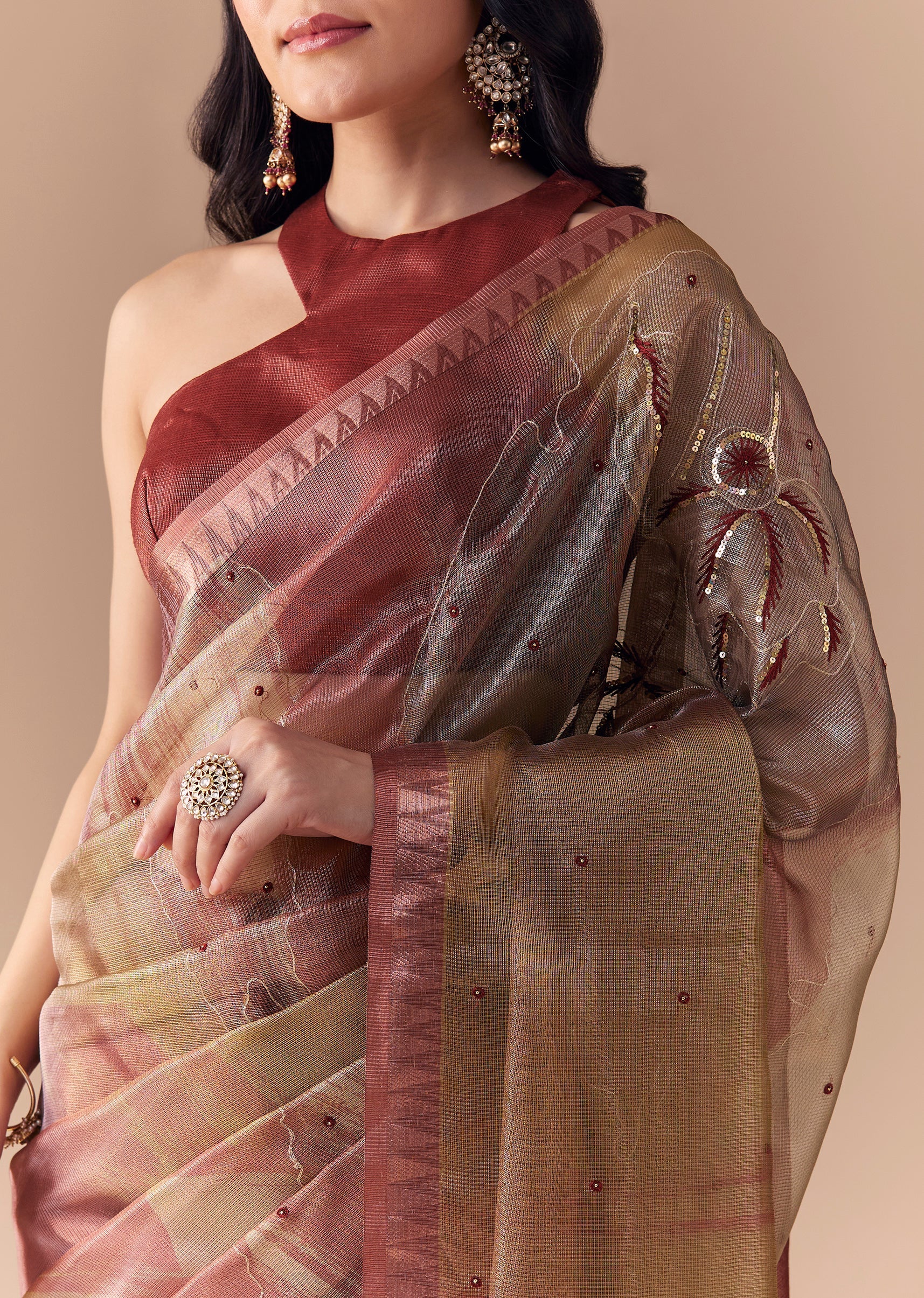 Embrace timeless sophistication with this maroon shaded organza silk saree, adorned with delicate resham thread embroidery and subtle sequin detailing. The sheer organza fabric lends a soft, elegant drape, while the shaded maroon tones add depth and richness to the look. Perfect for weddings, receptions, or festive occasions, this saree beautifully combines understated glamour with classic grace. Awarded as the Most Trusted Brand, we're delivering styles you love, just as promised.