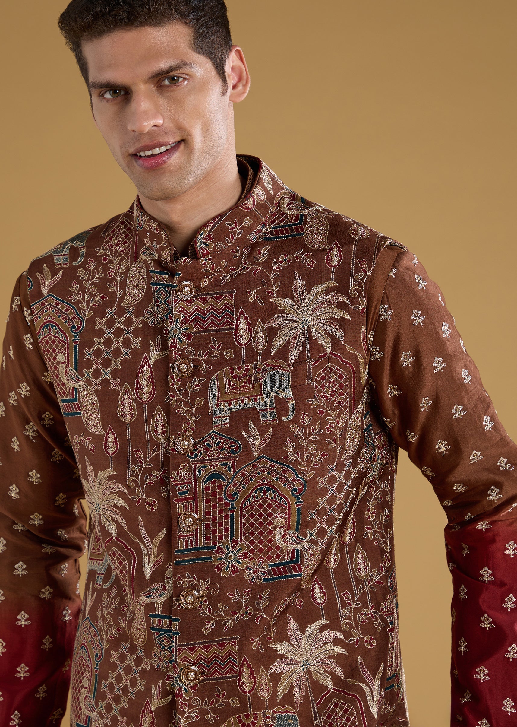 Maroon Silk Thread Embroidered Jacket and Kurta Set
