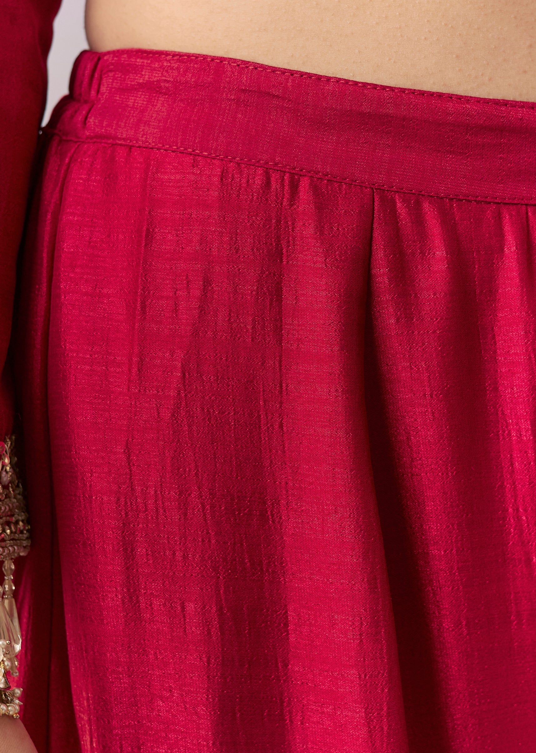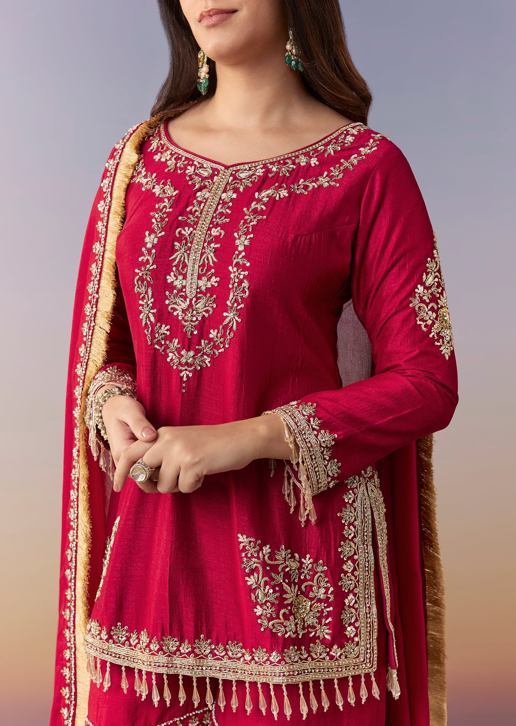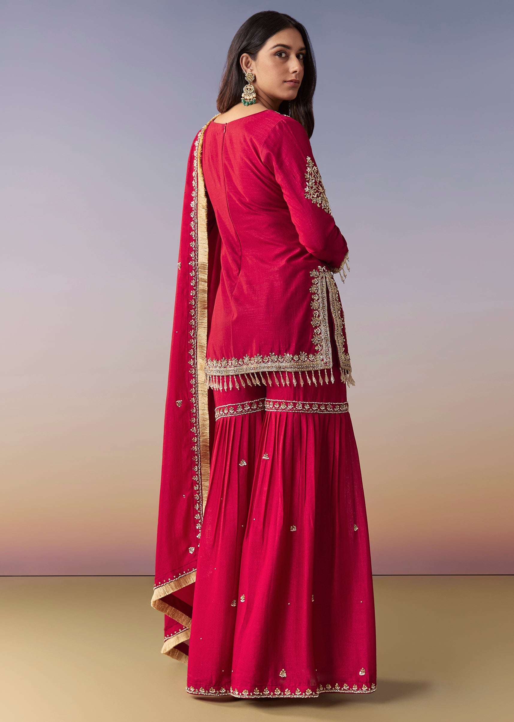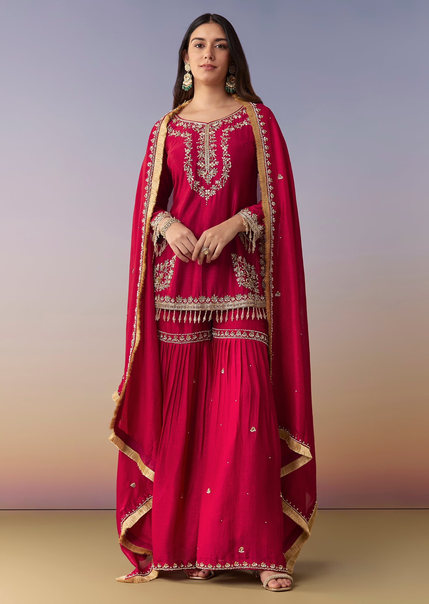 Crafted in pure silk, this maroon straight-fit kurta is richly finished with zardosi embroidery and a flattering V-neckline. Styled with a flared sharara (mid-waist, partially elasticated) and a matching dupatta... More Product Details