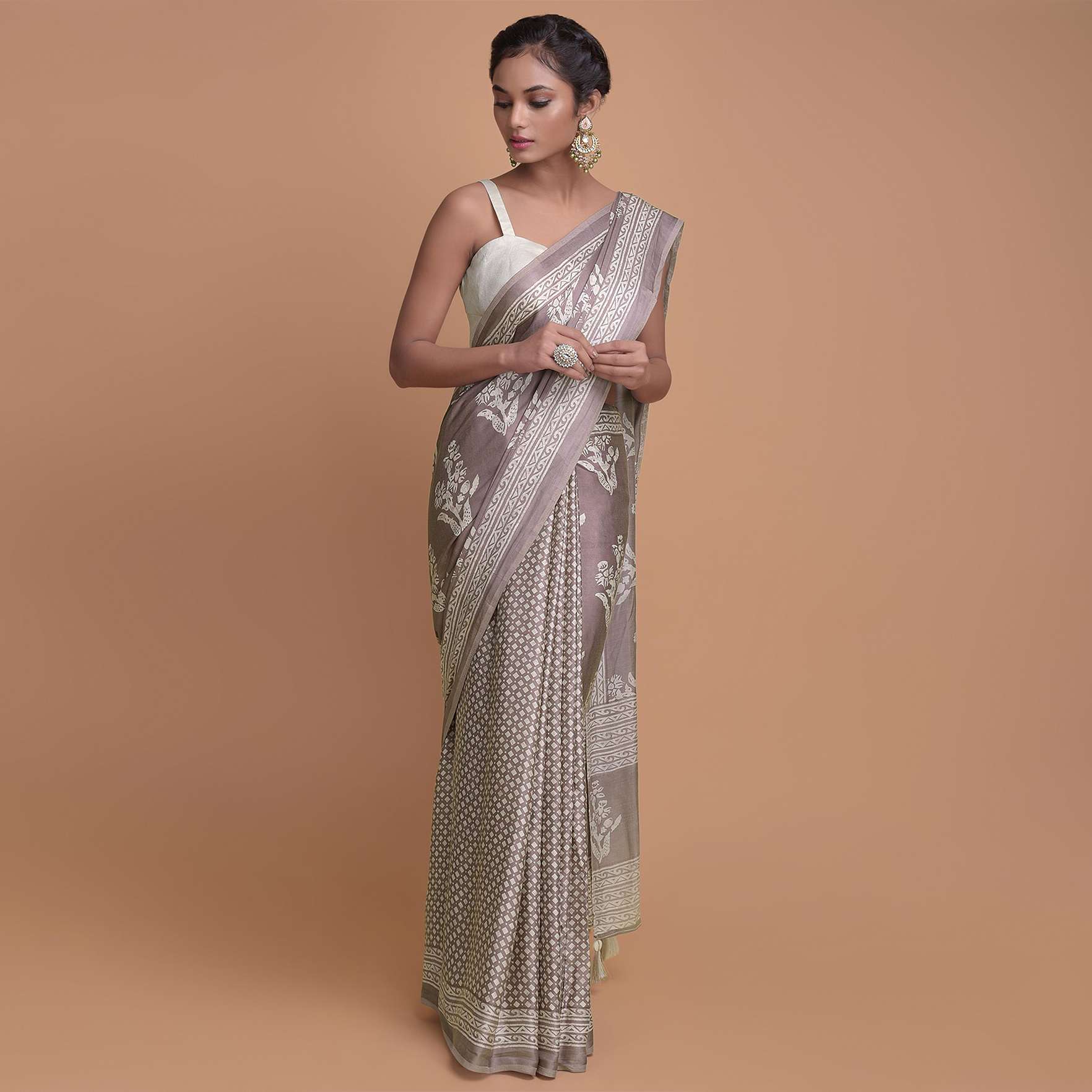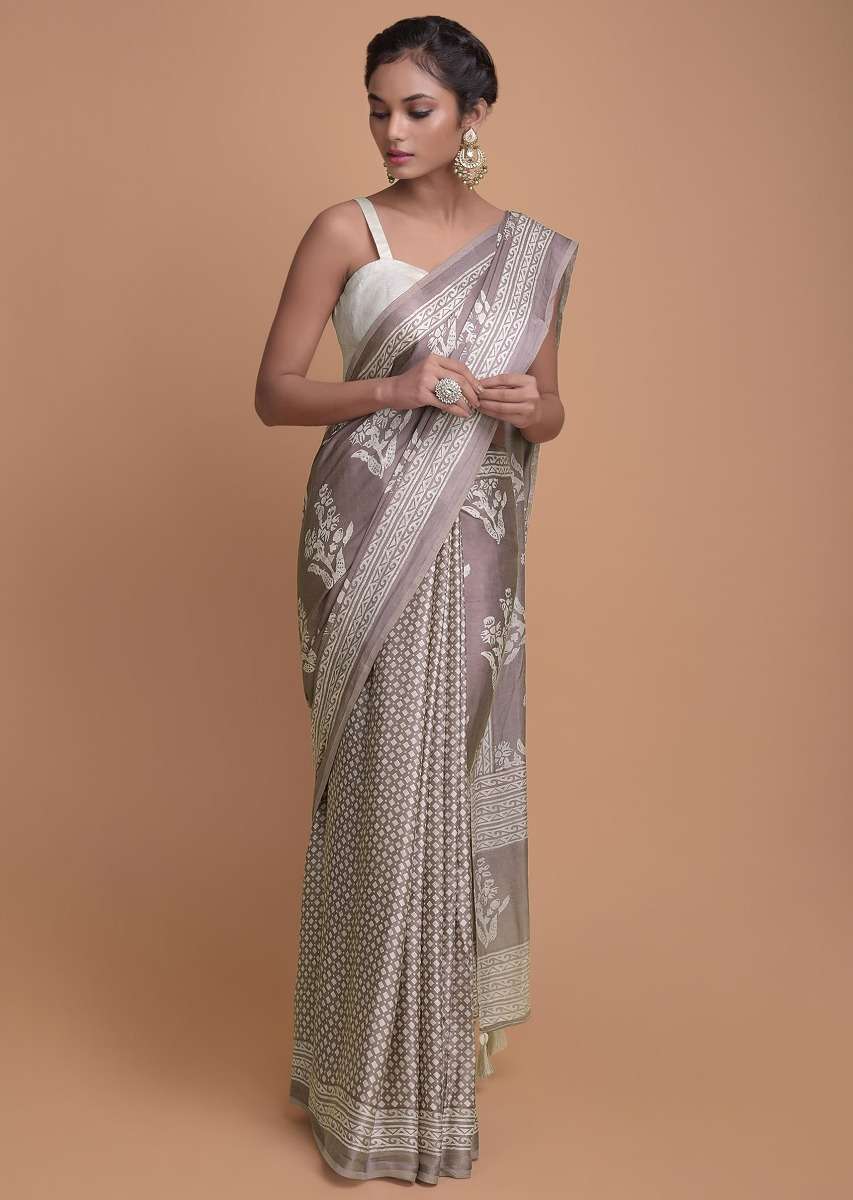 Mauve Half And Half Saree In Satin Silk Adorned With Geometric And Floral Print Online - Kalki Fashion