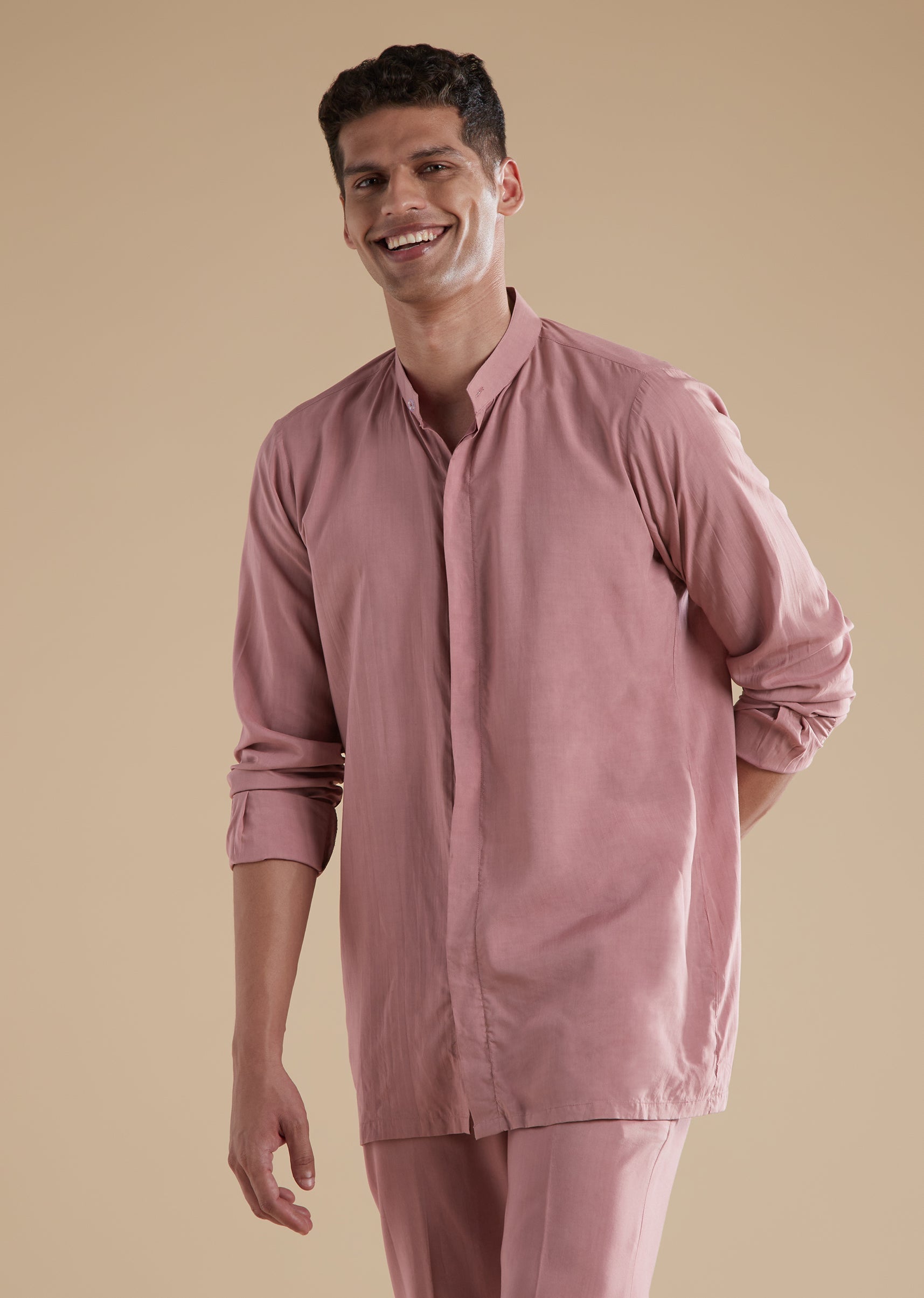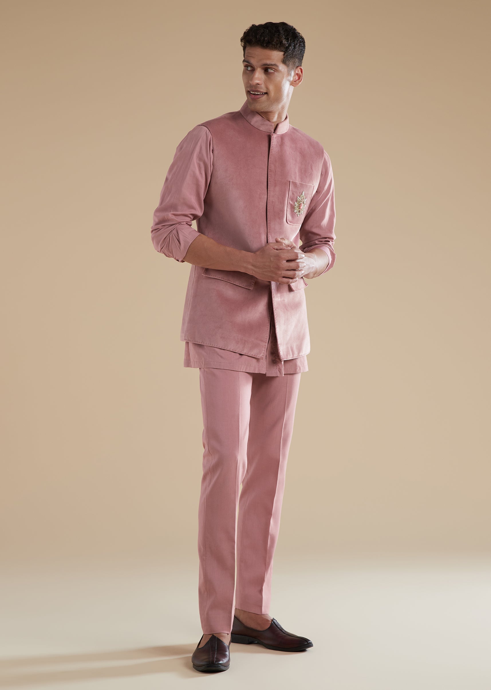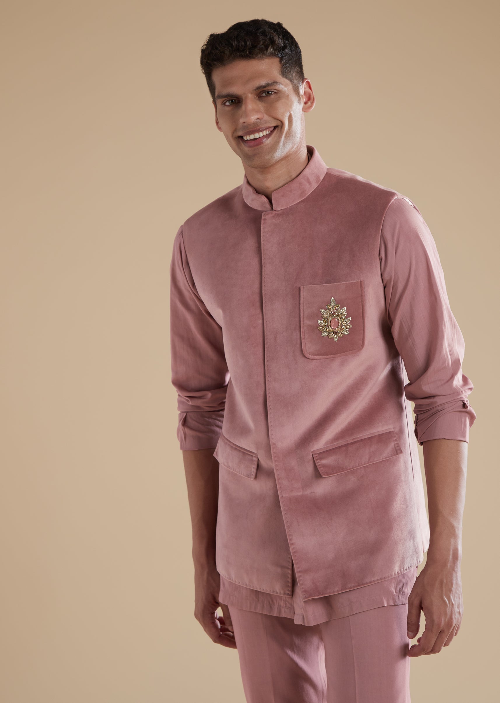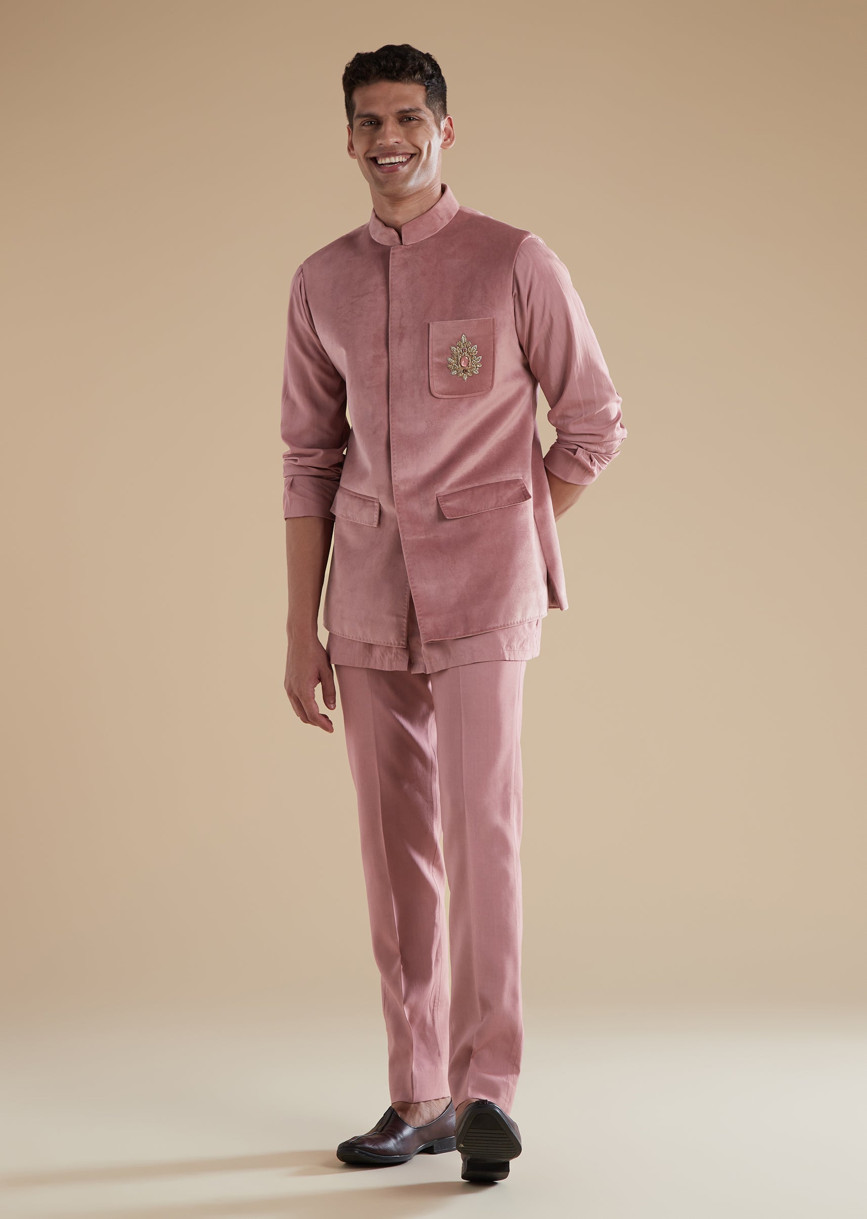 Understated yet regal, this mauve Jodhpuri set is crafted in soft suede fabric, creating a refined pastel look ideal for sangeet, engagement, and reception celebrations. Suitable for both groomsmen and... More Product Details