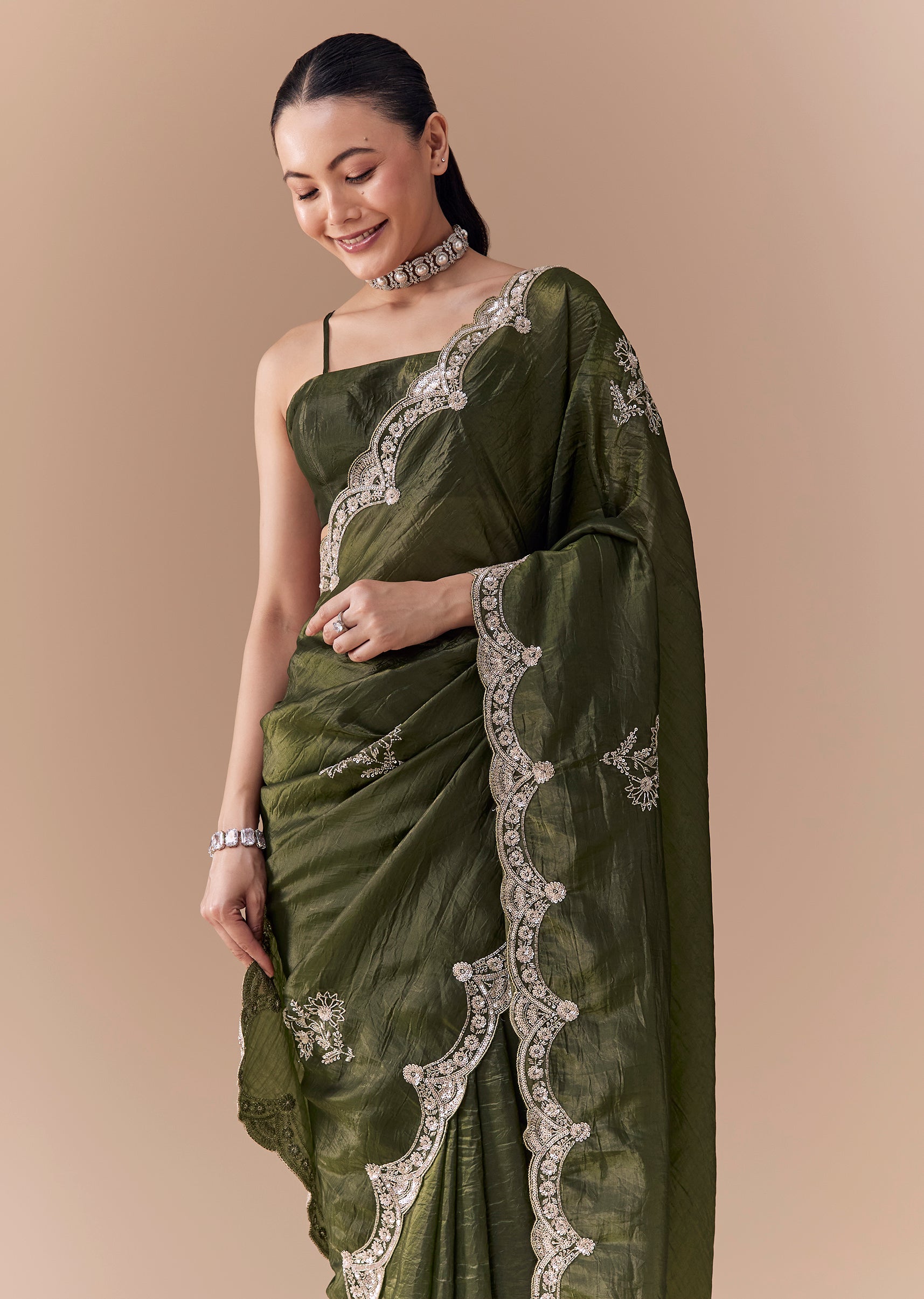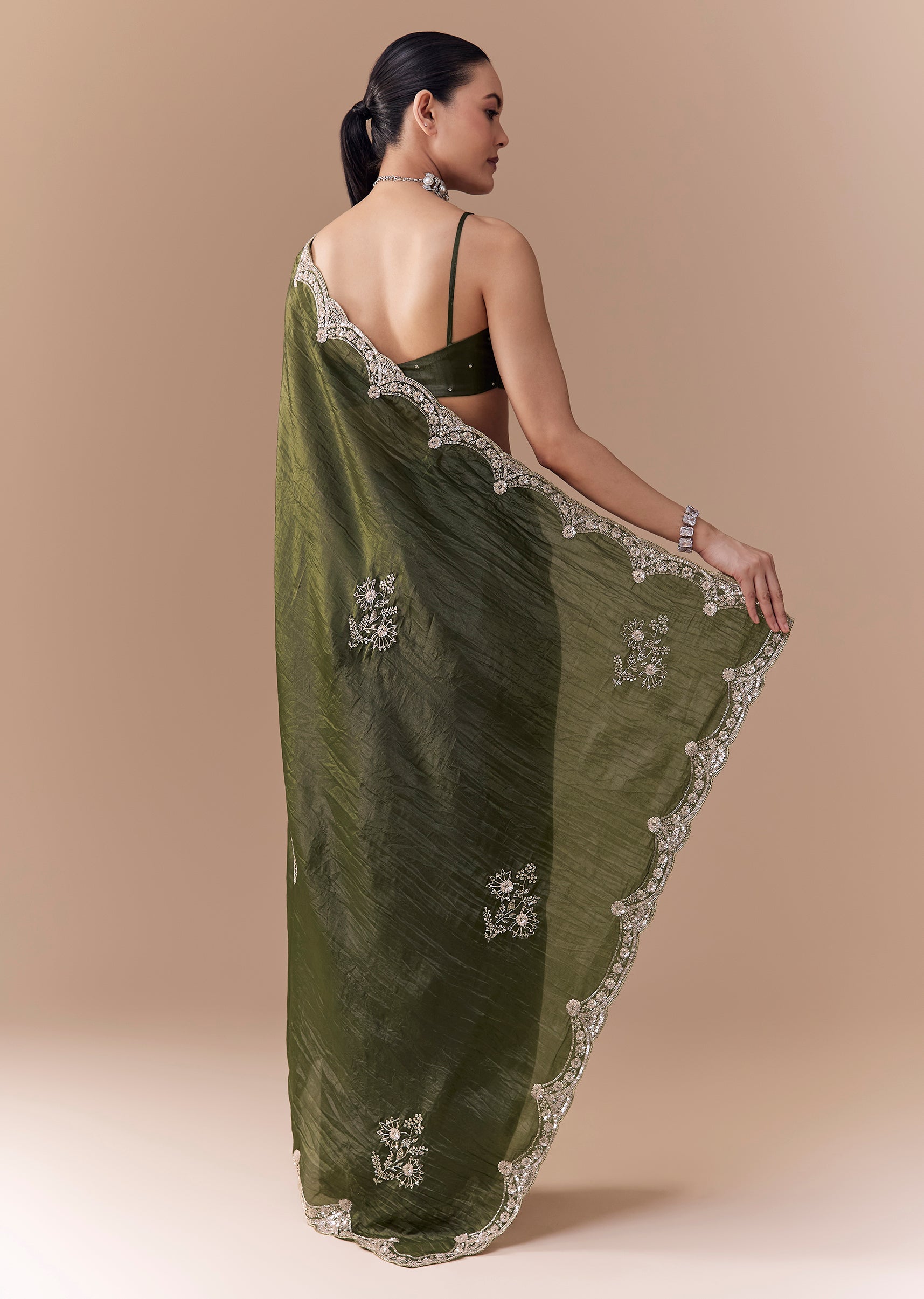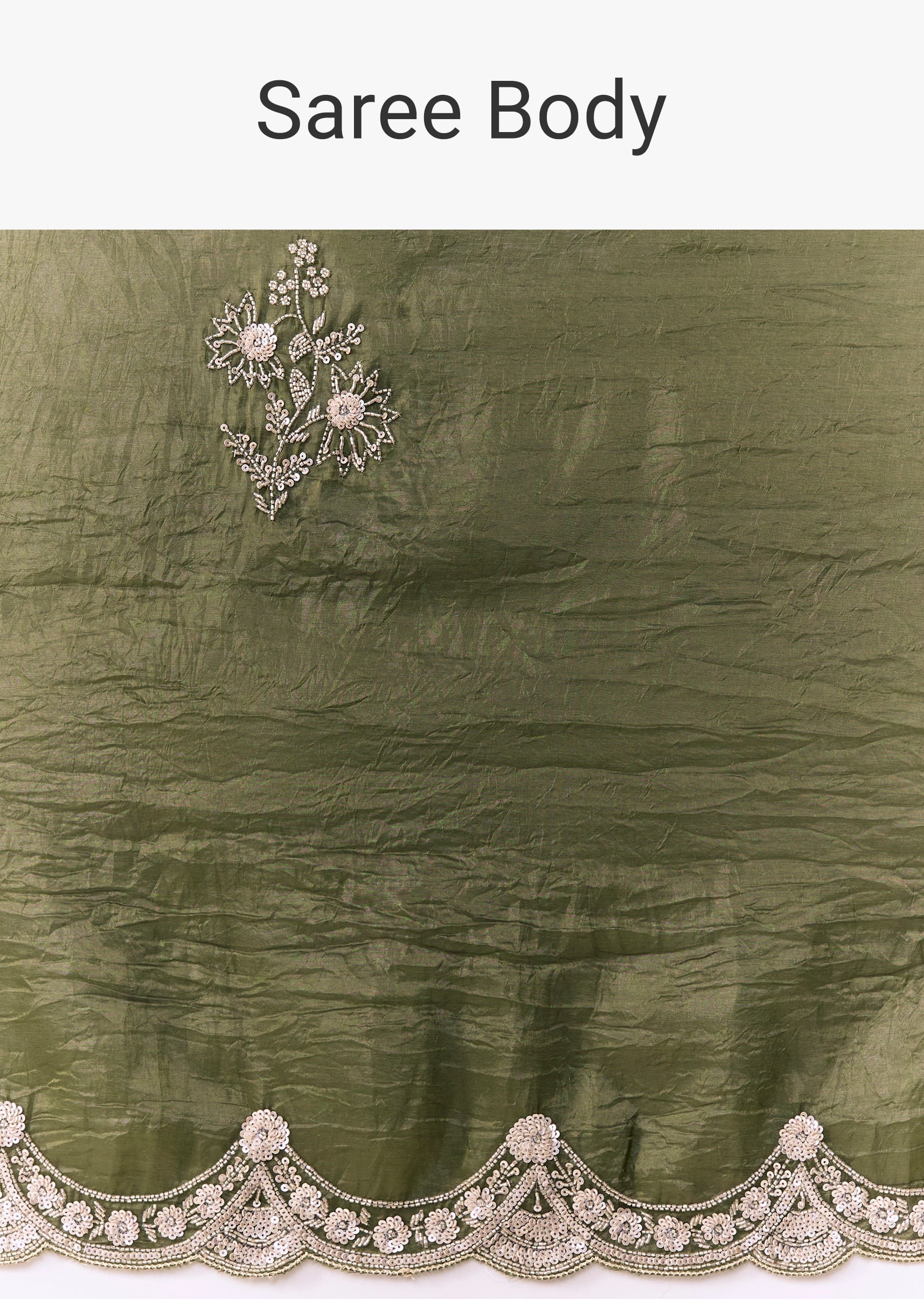 Mehendi Green Crush Tissue Embellished Saree with Blouse Fabric