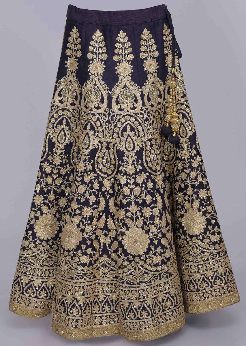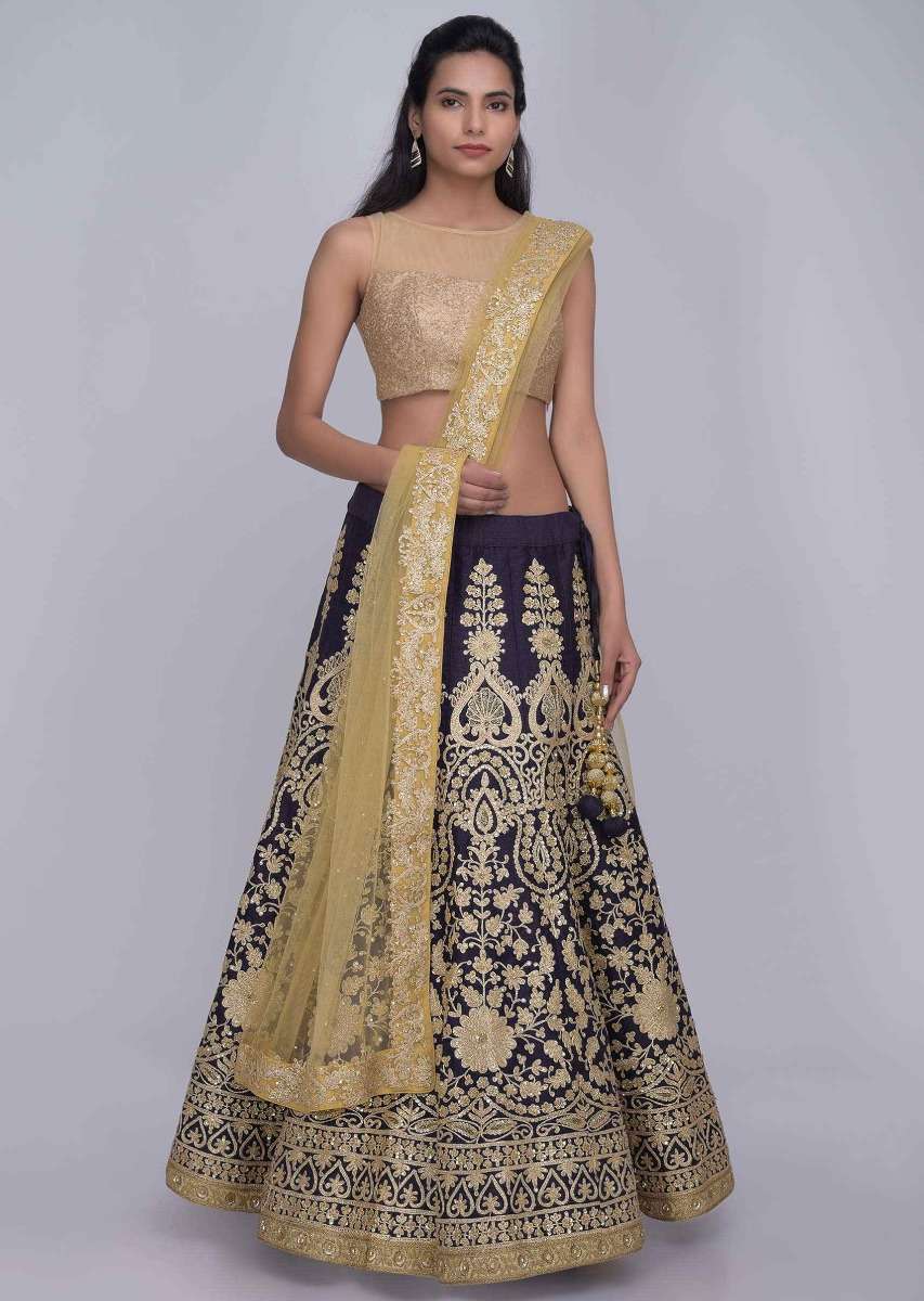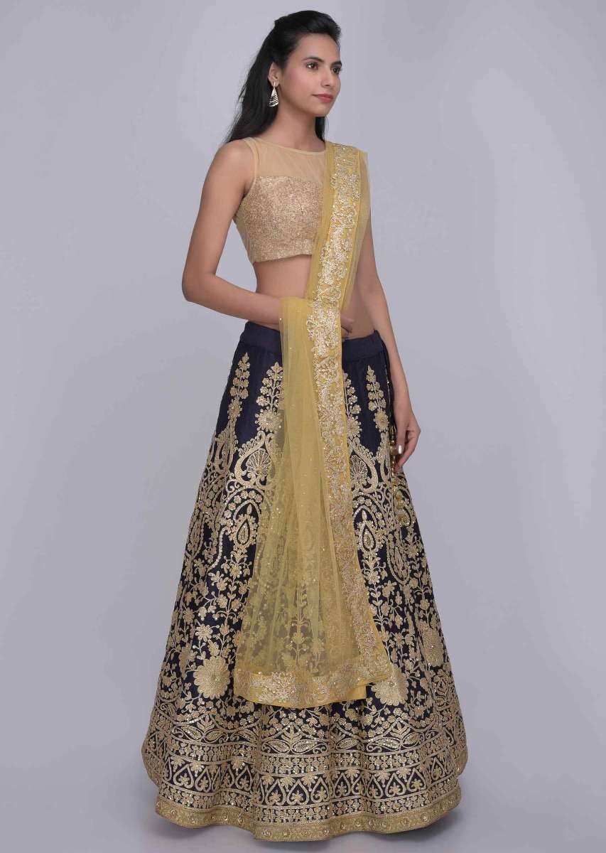 Midnight Blue Lehenga In Raw Silk With Gold Net Dupatta Online - Kalki Fashion