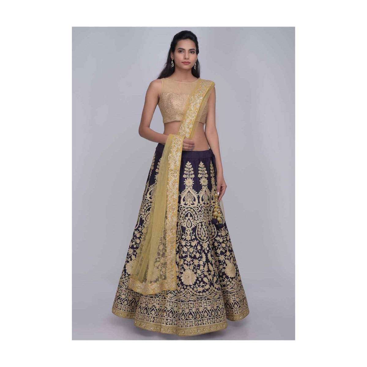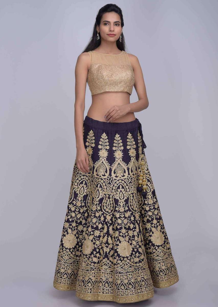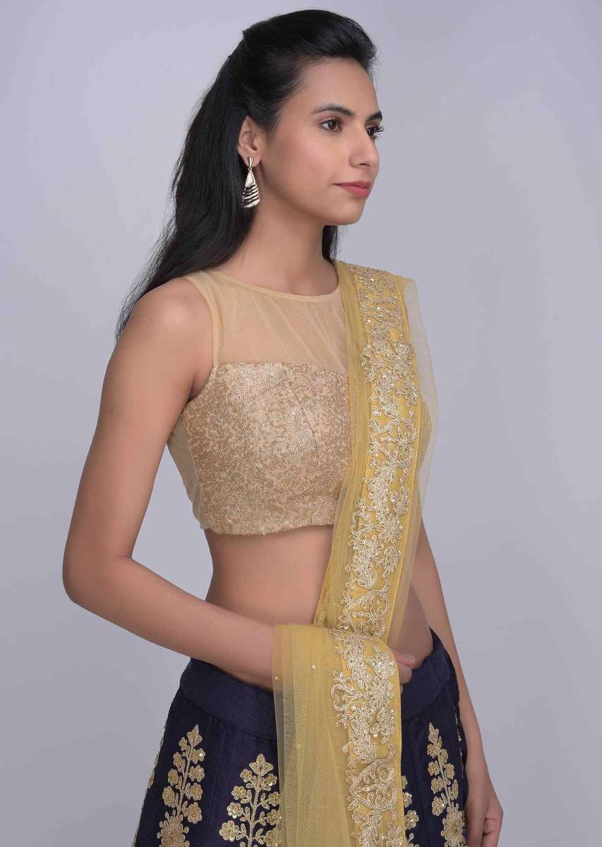 Midnight Blue Lehenga In Raw Silk With Gold Net Dupatta Online - Kalki Fashion