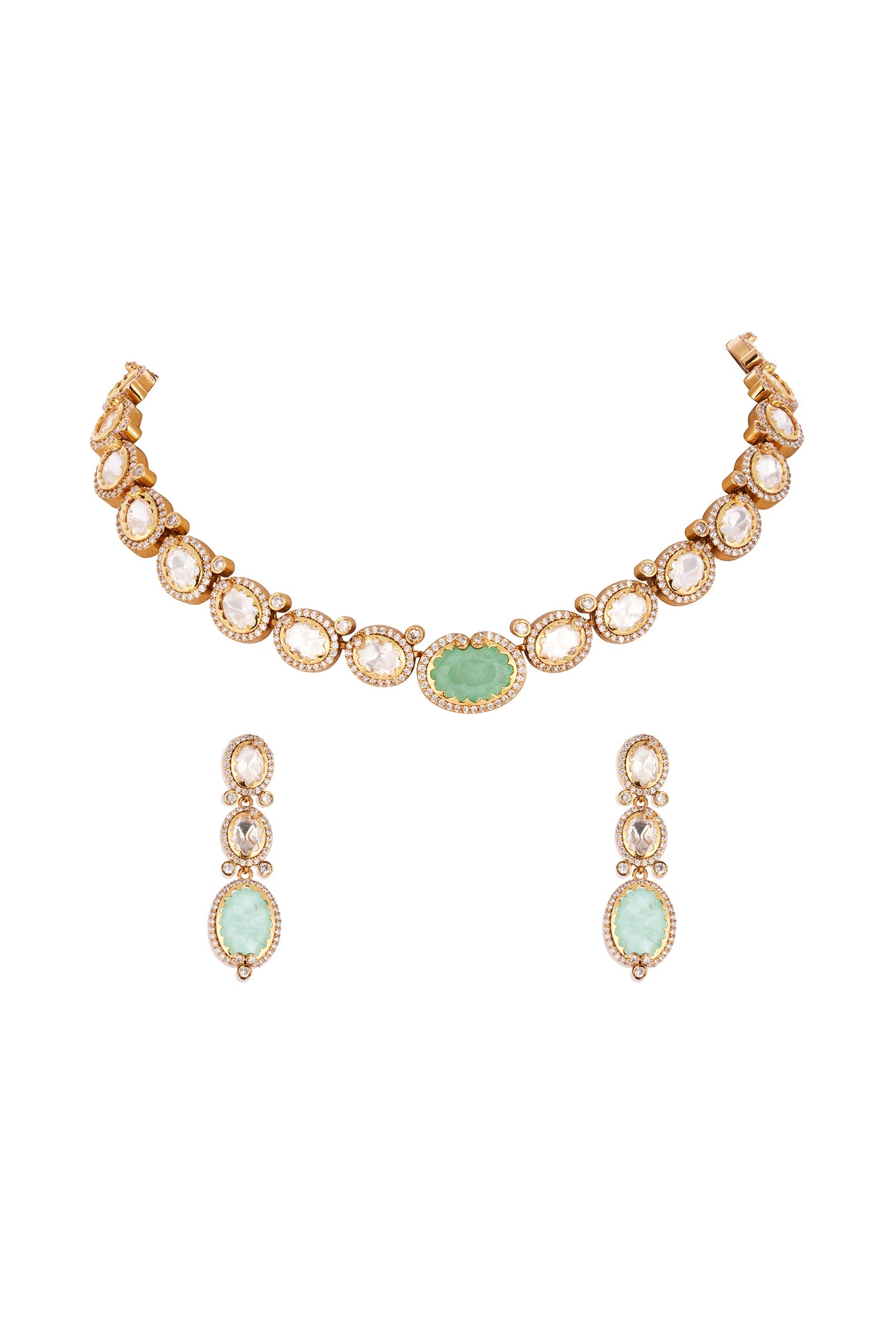 Mint Green and Gold Finish Jewellery Set In Kundan Polki
