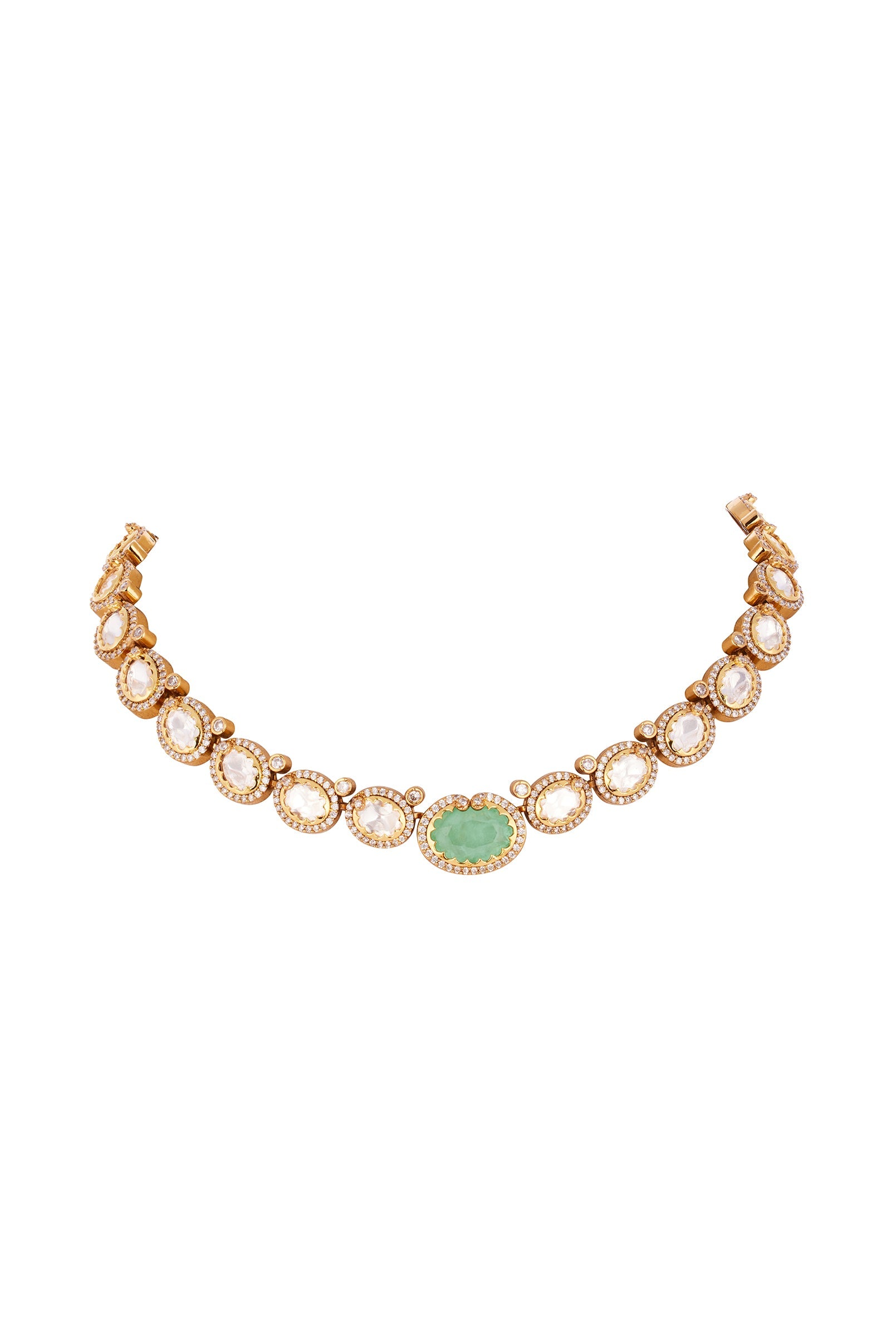 A refined Polki necklace set crafted using the traditional Kundan Jadau technique and highlighted with semi precious emerald accents. The handcrafted design is finished with intricate detailing that brings together... More Product Details