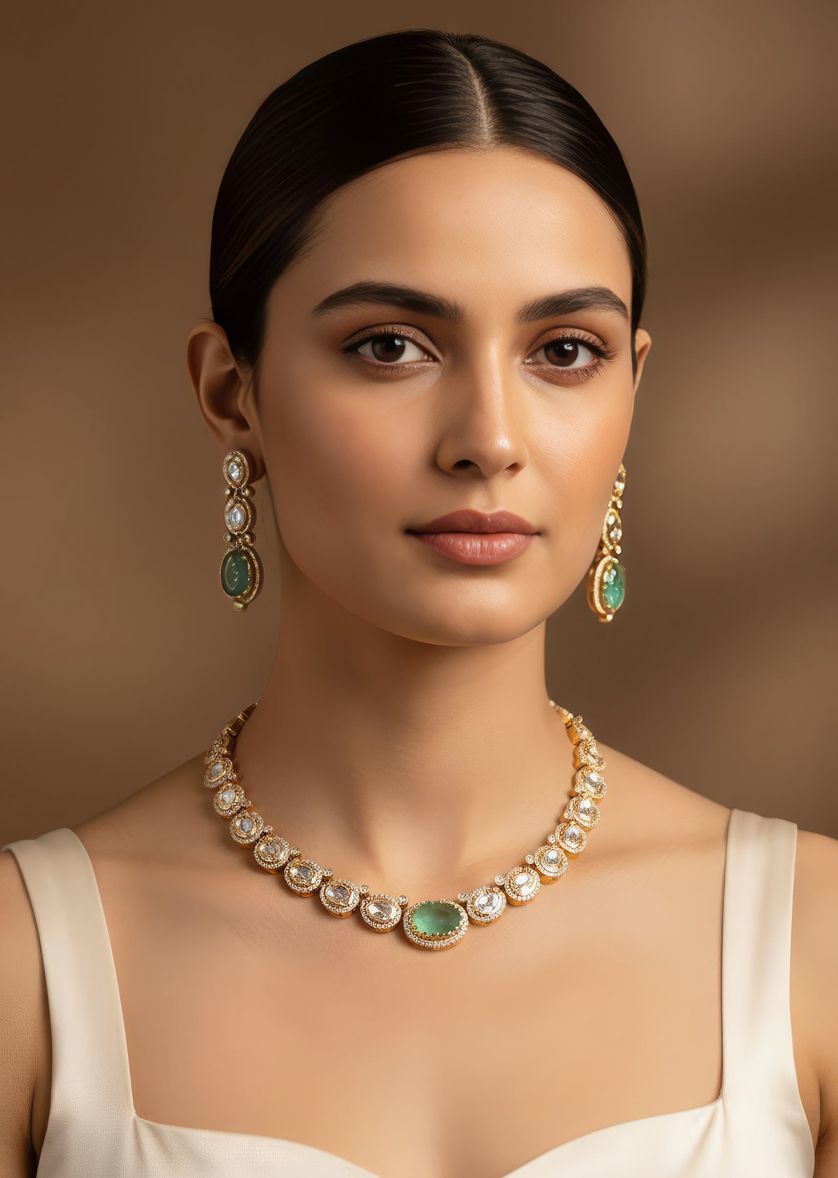 A refined Polki necklace set crafted using the traditional Kundan Jadau technique and highlighted with semi precious emerald accents. The handcrafted design is finished with intricate detailing that brings together classic artistry and festive elegance. Awarded as the Most Trusted Brand, we're delivering styles you love, just as promised.