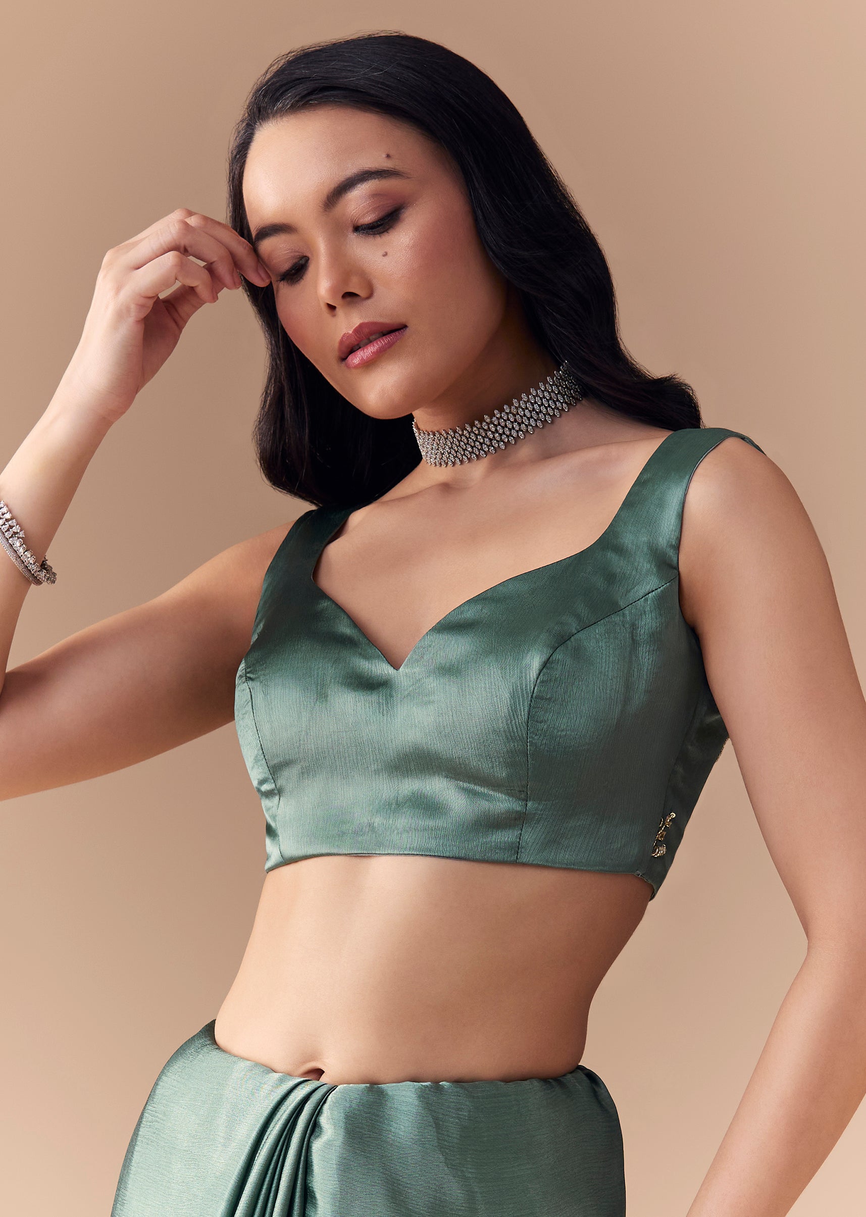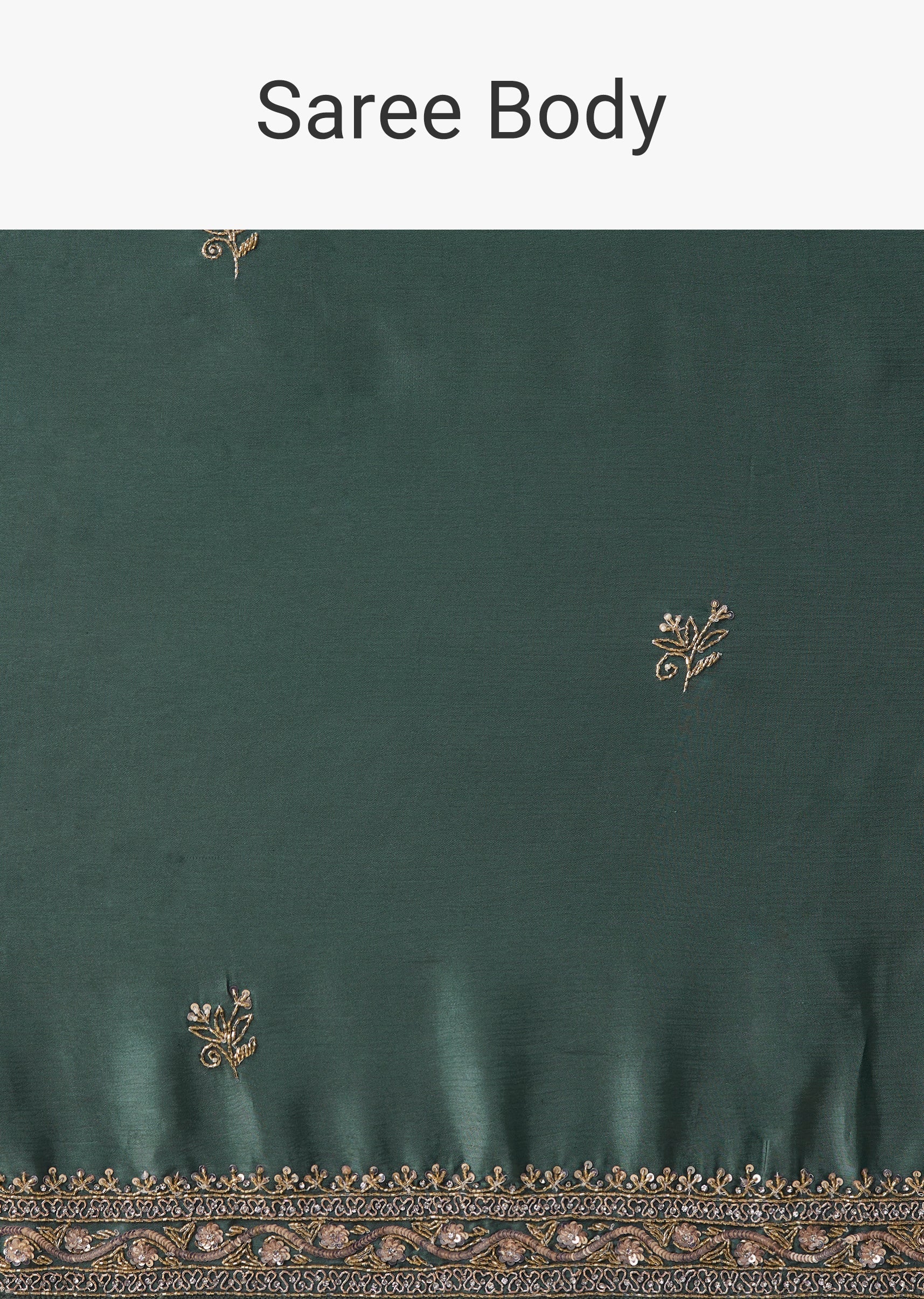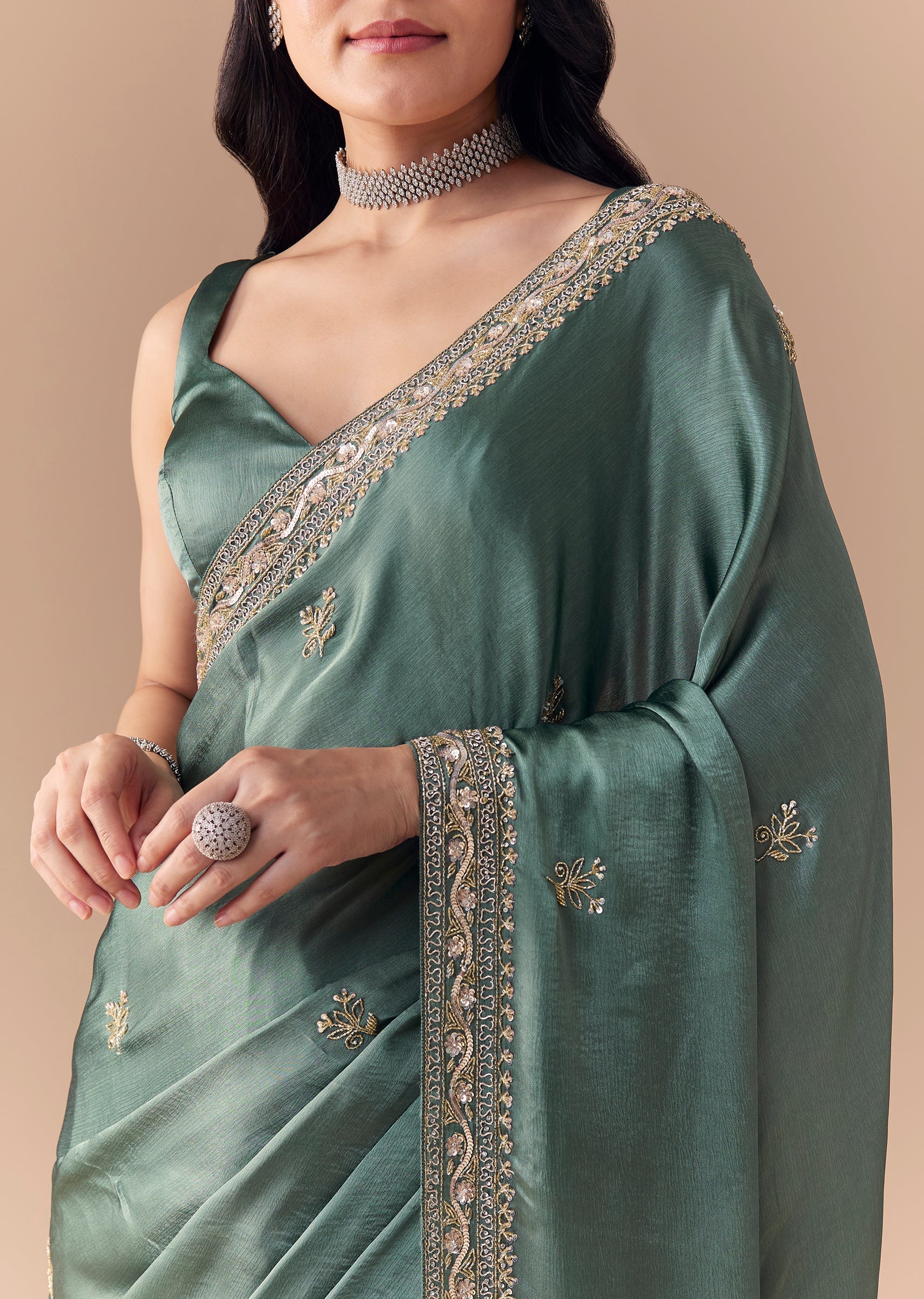 Radiate subtle sophistication with this mint green chinon saree, featuring delicate butti work all over and a richly embroidered border embellished with cutdana, sequins, and beads. The smooth chinon fabric drapes beautifully, offering a soft sheen and elegant flow that make it perfect for festive occasions, weddings, or evening celebrations. This saree blends refined detailing with graceful charm for a timeless appeal. Awarded as the Most Trusted Brand, we're delivering styles you love, just as promised.