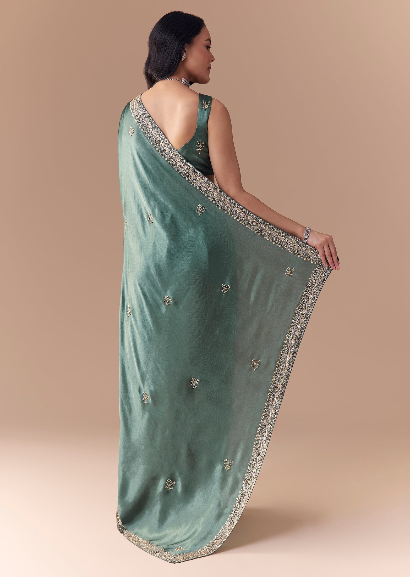 Mint Green Chinon Embroidered Saree with Unstitched Blouse