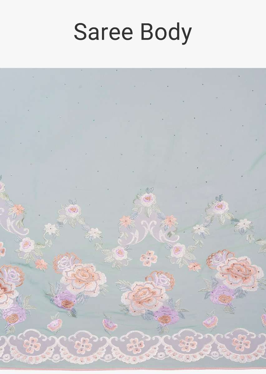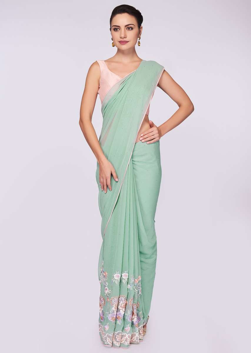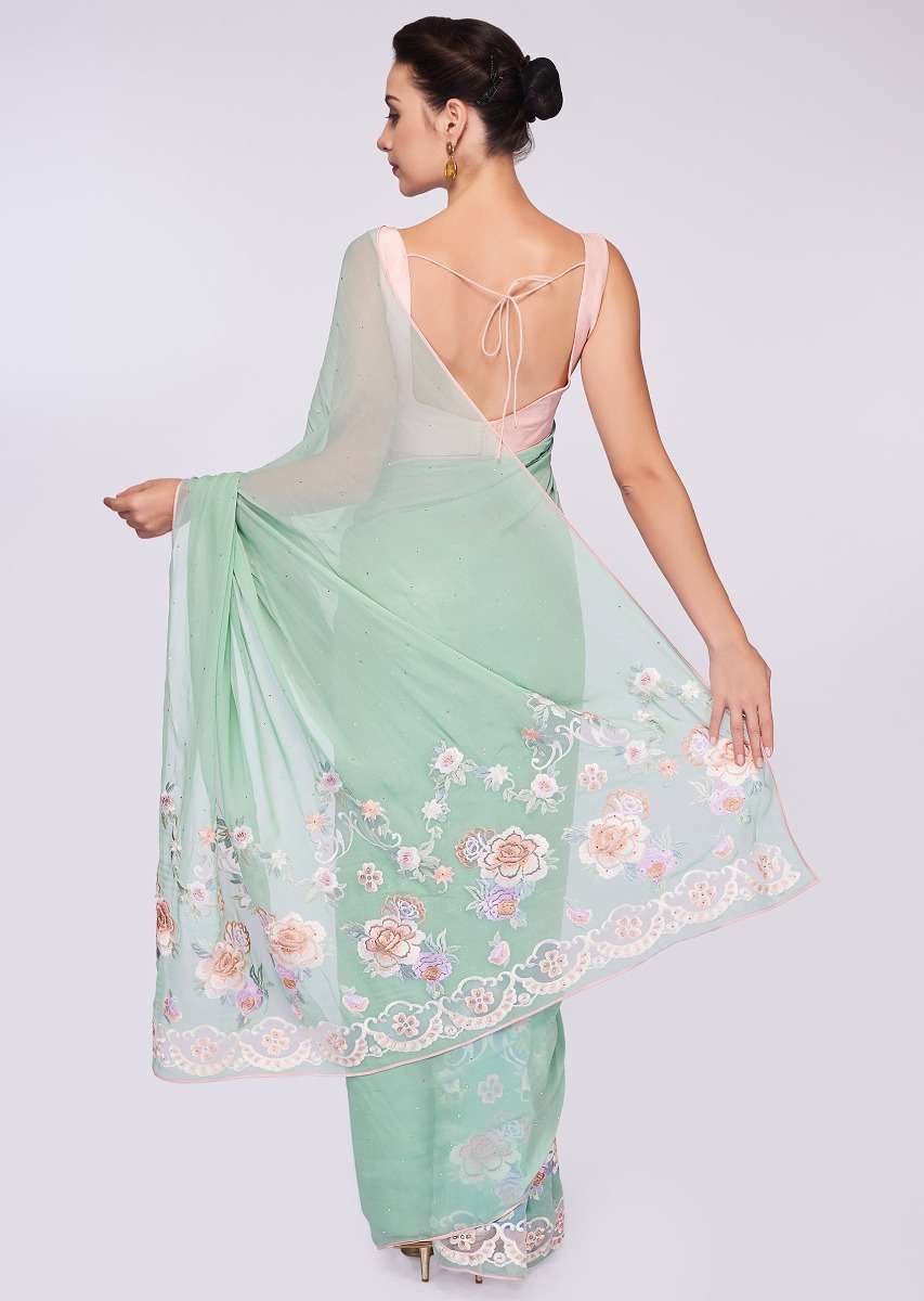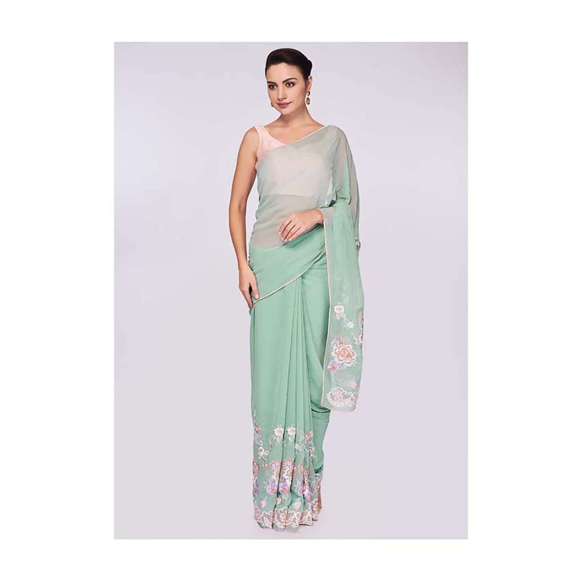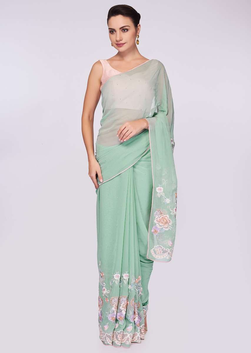 Mint Green Georgette Saree With In Floral Resham Embroidery On The Border Online - Kalki Fashion