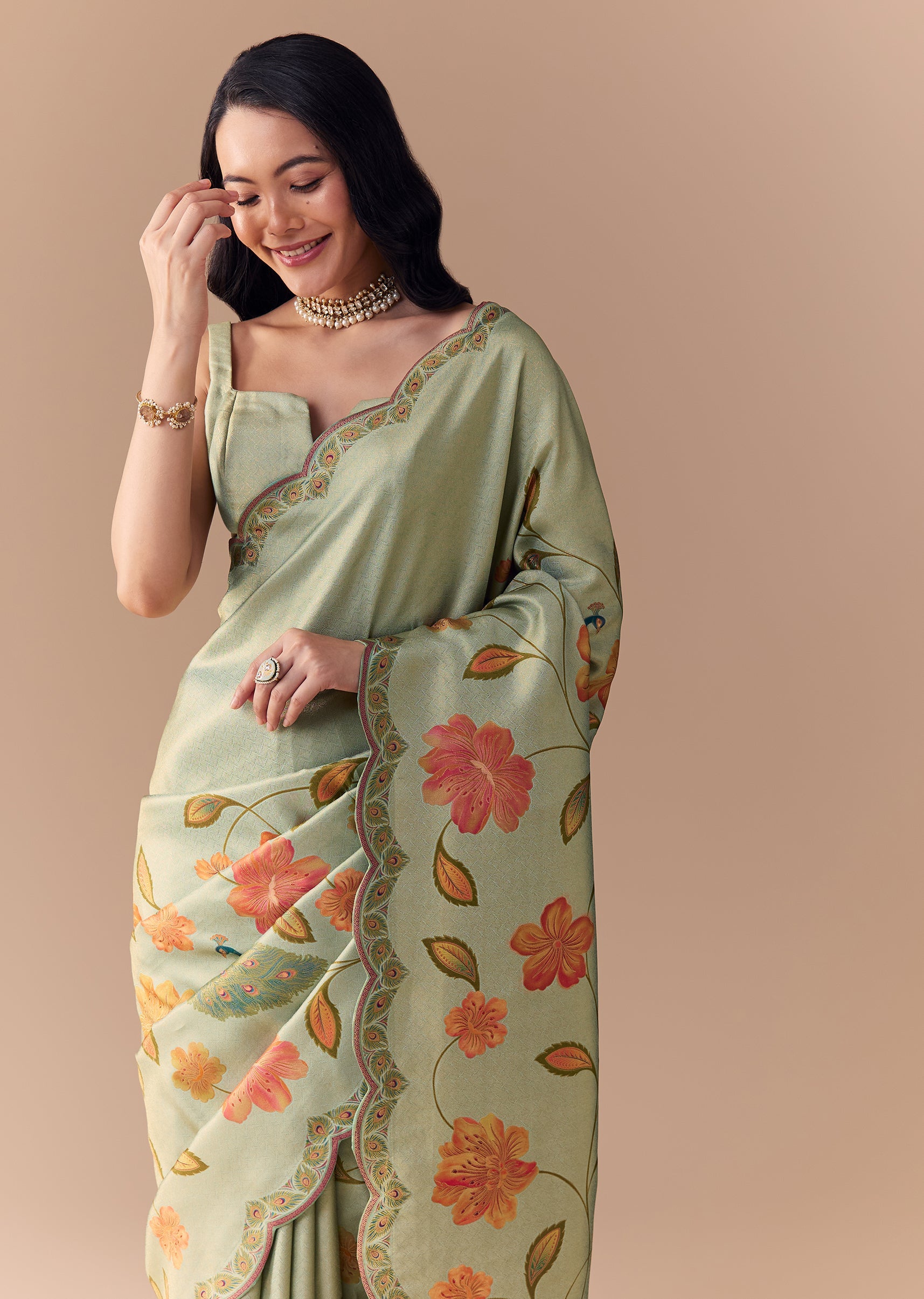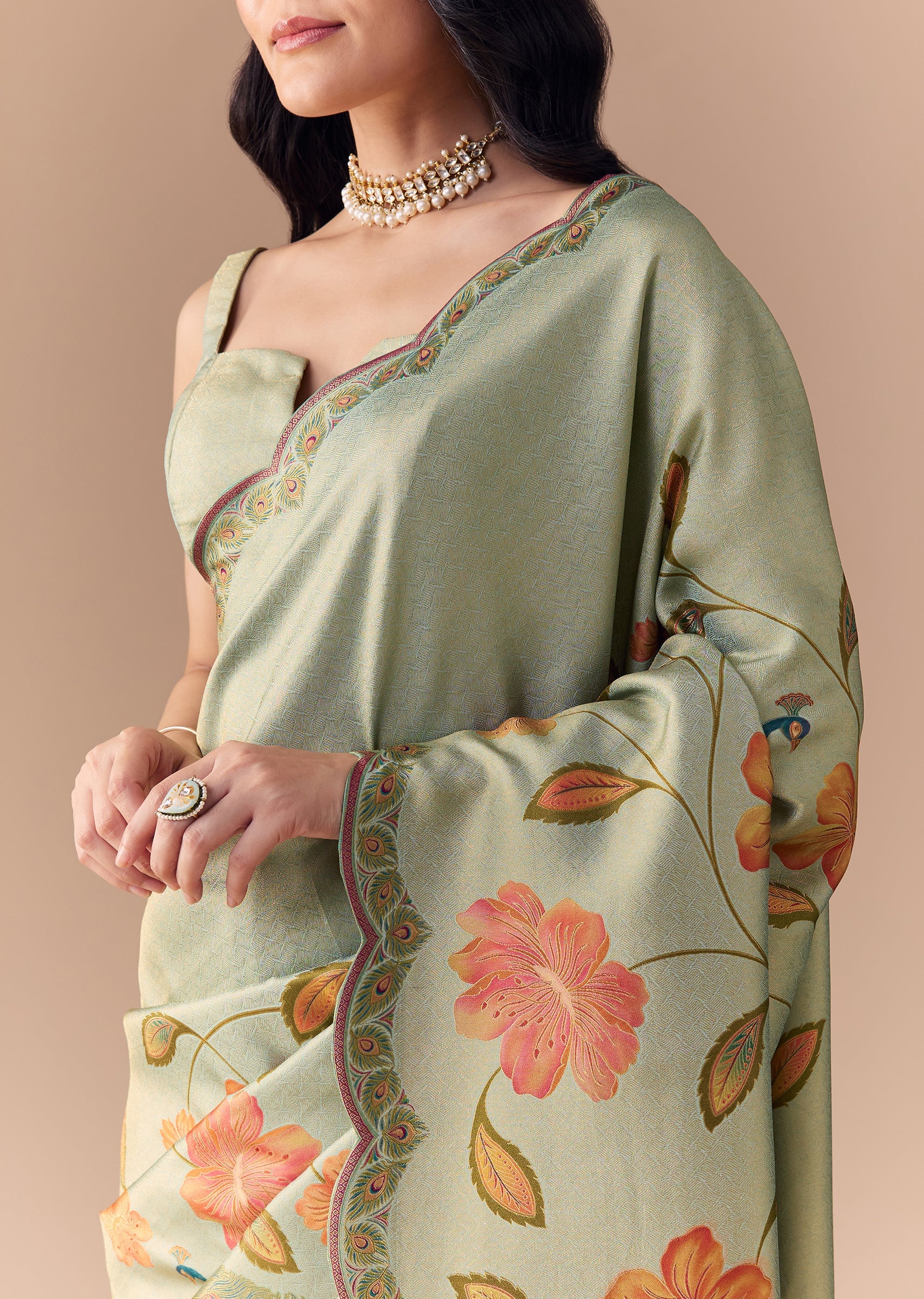 Mint Green Jacquard Silk Floral Woven Saree with Unstitched Blouse