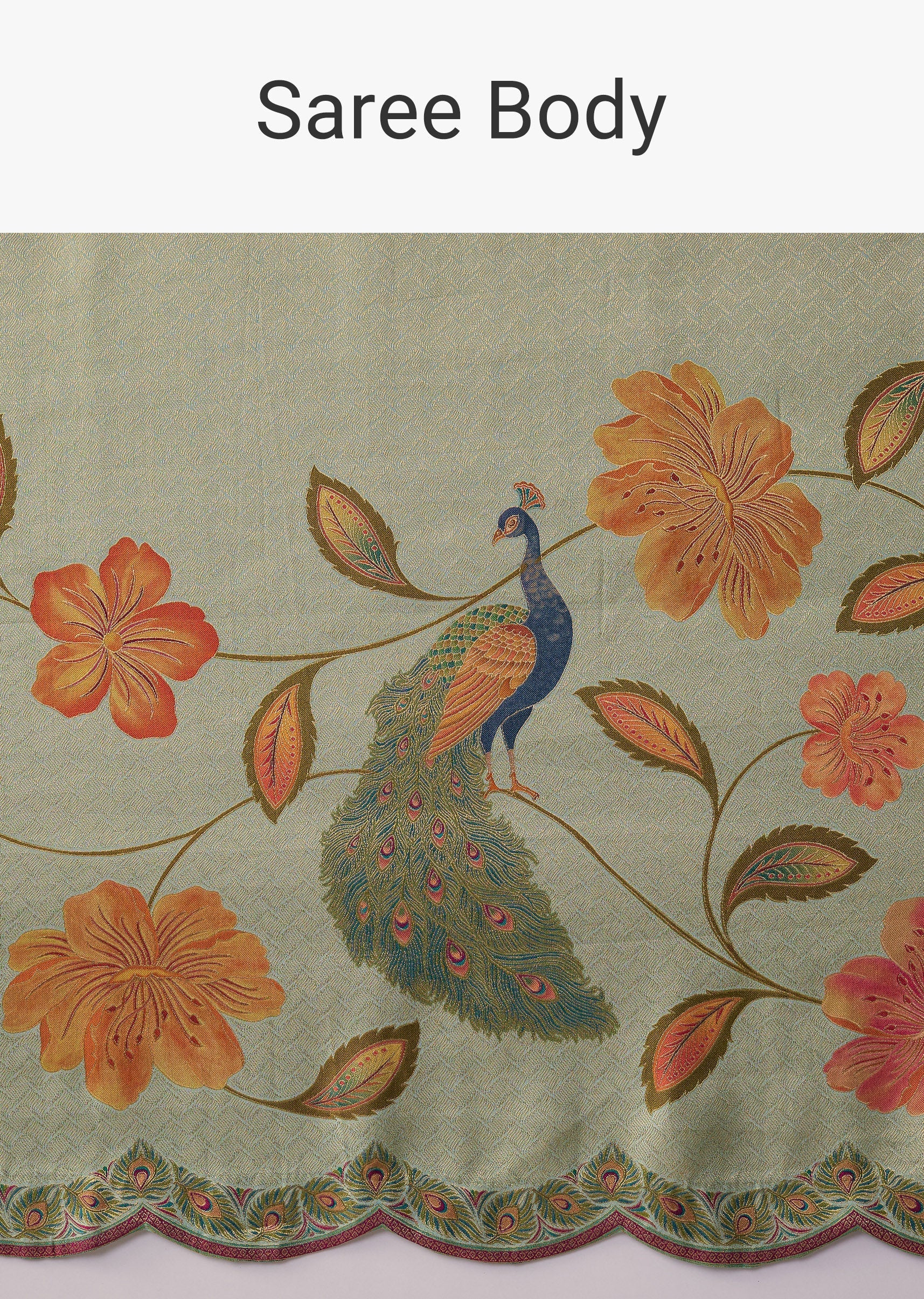 Radiate graceful charm with this mint green jacquard silk saree, featuring intricately woven floral and peacock motifs all over. The elegant scallop border enhances its traditional appeal, while the rich... More Product Details