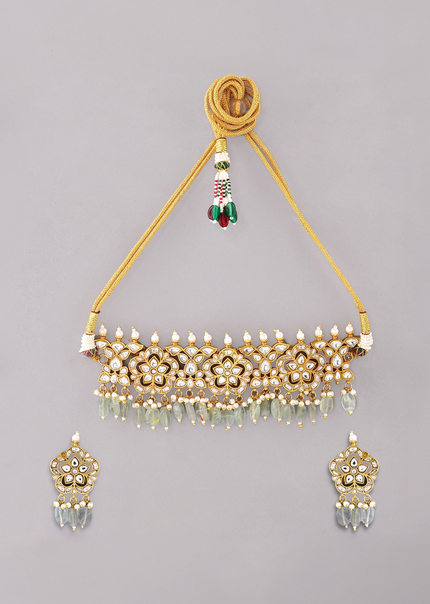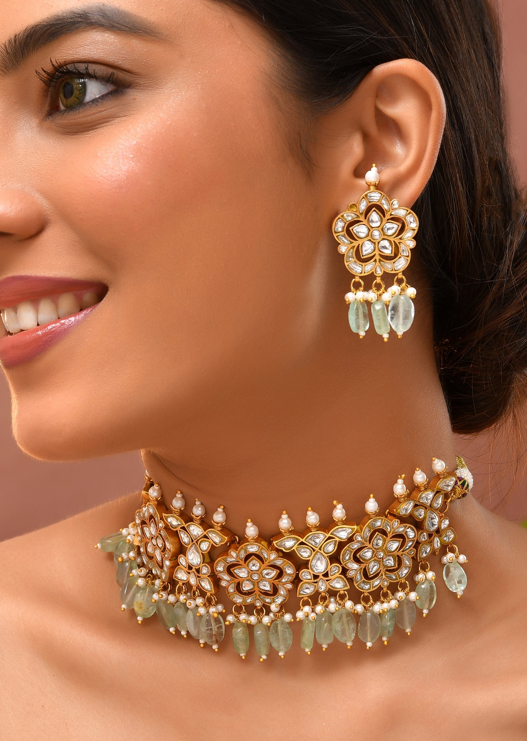 Mint Green Kundan Floral Motif Necklace and Earrings Set