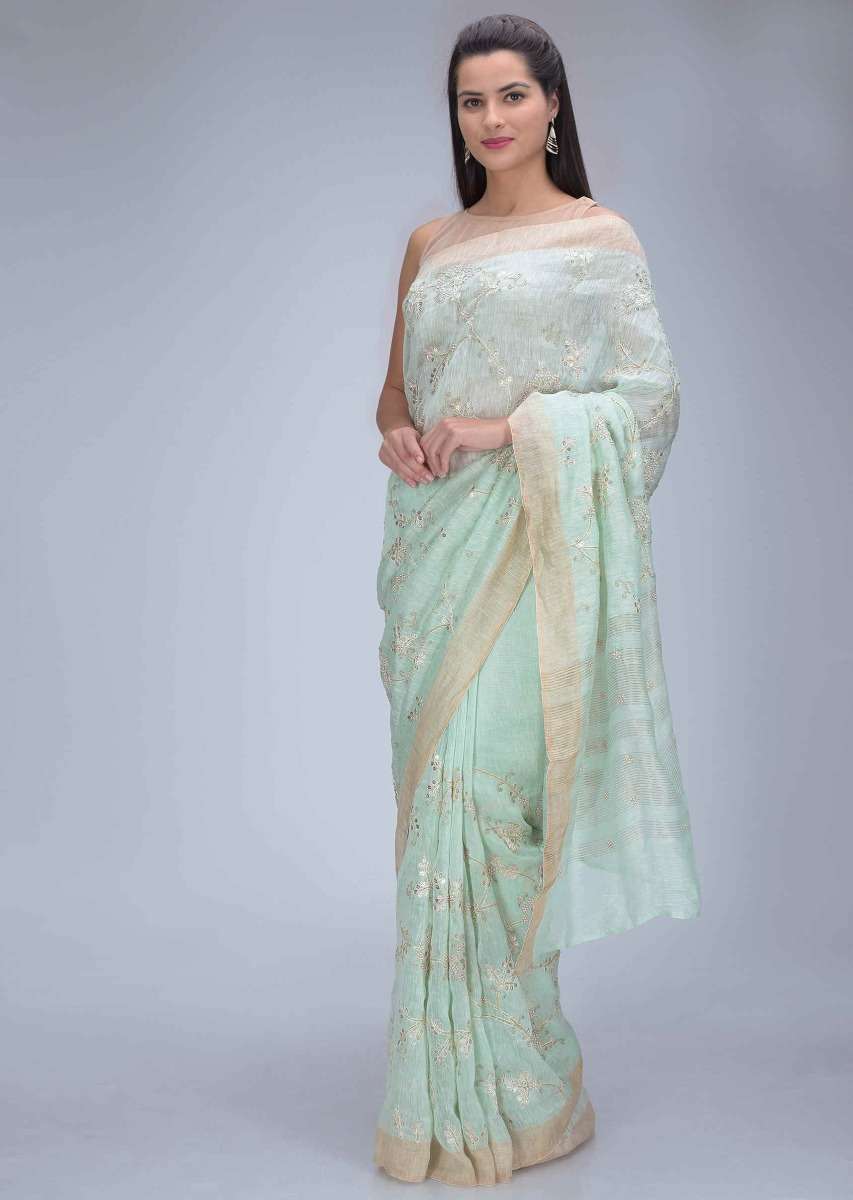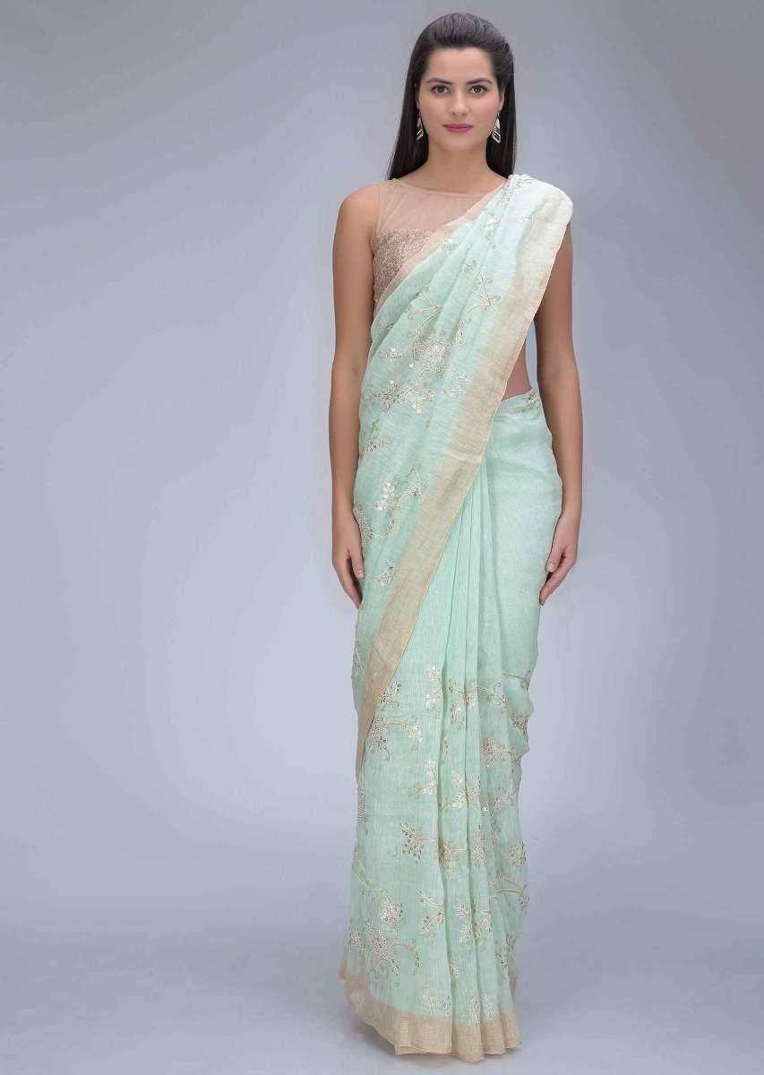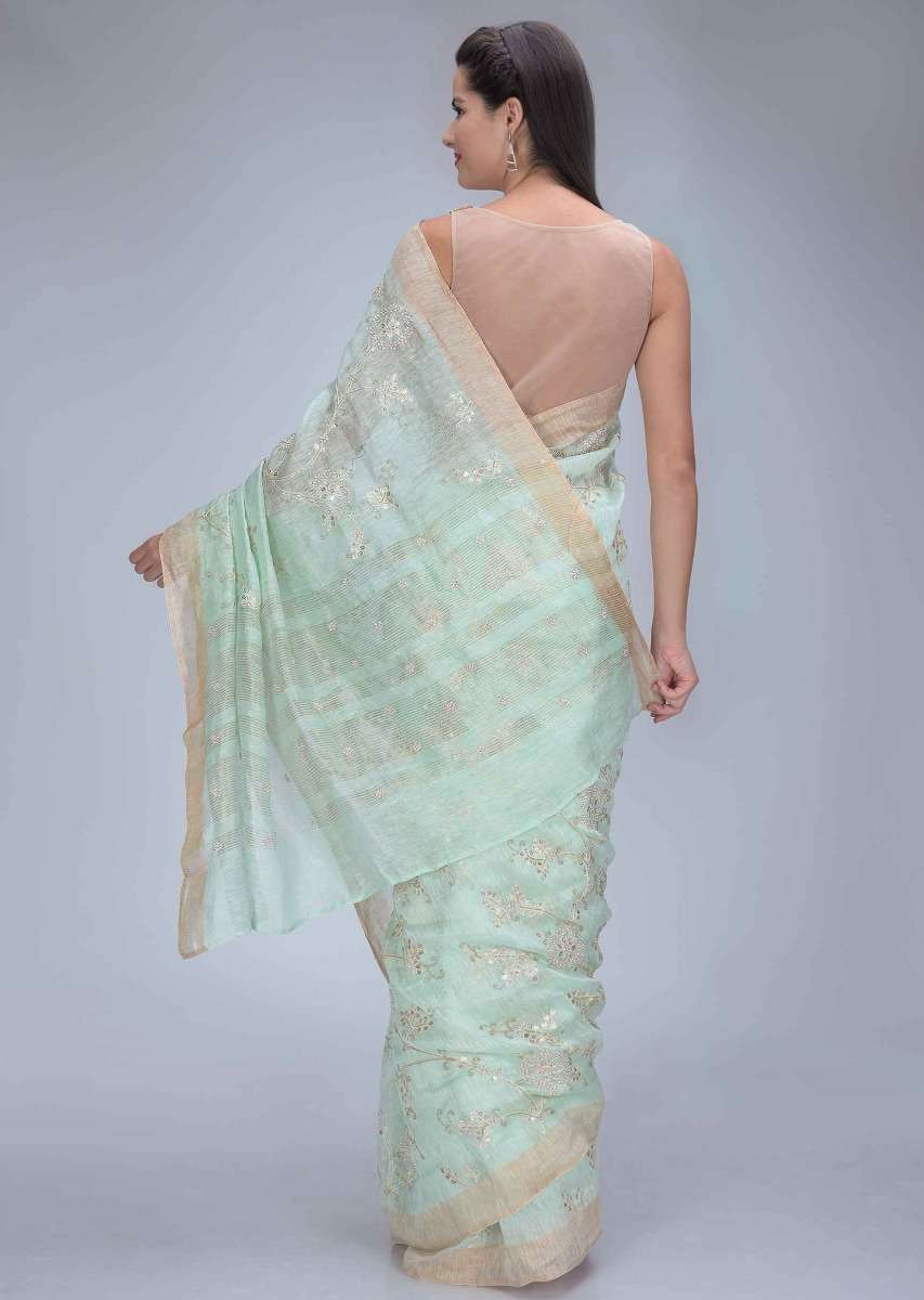 Mint Green Saree In Cotton Silk With Gotta Patch Floral Embroidery Work Online - Kalki Fashion