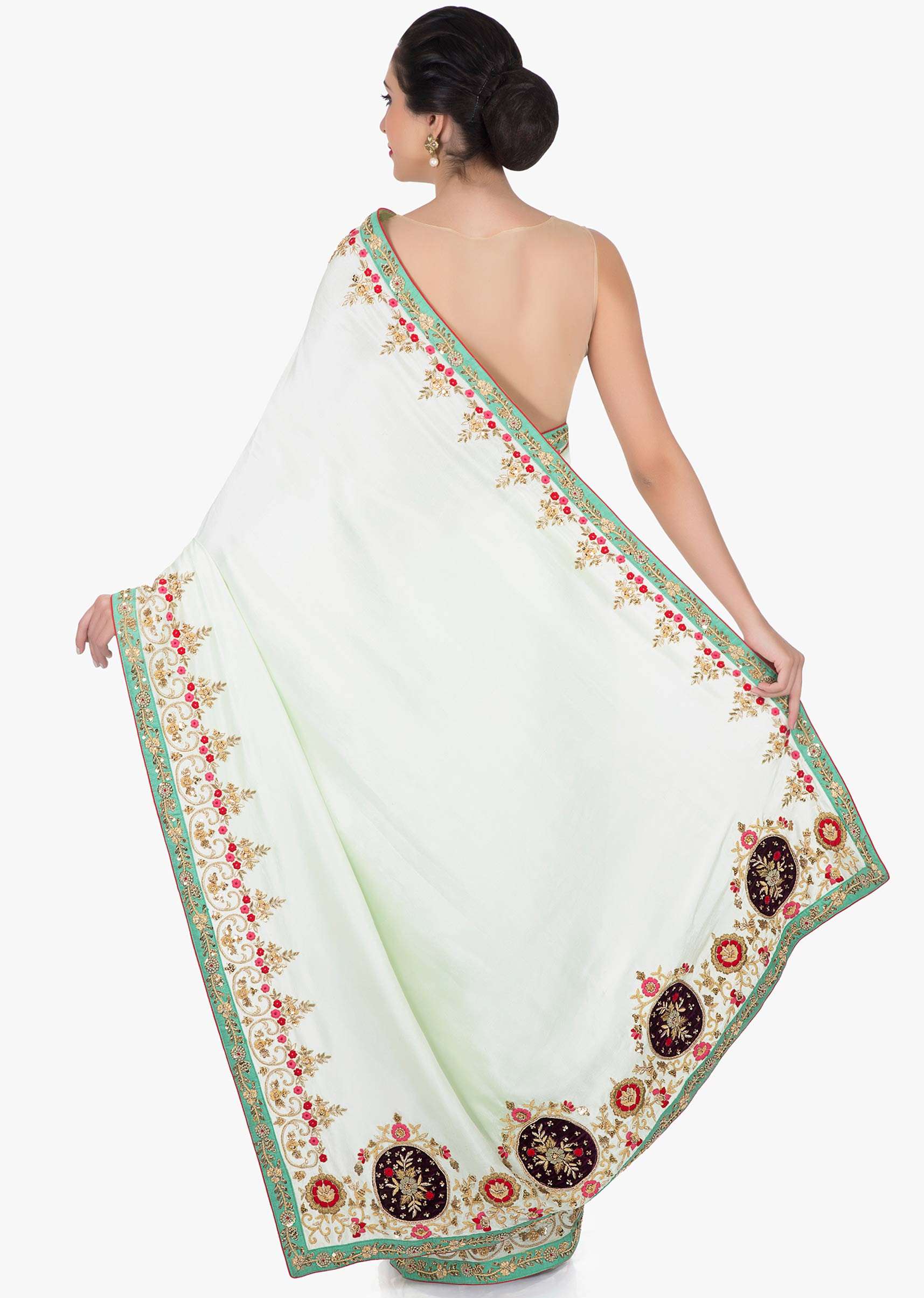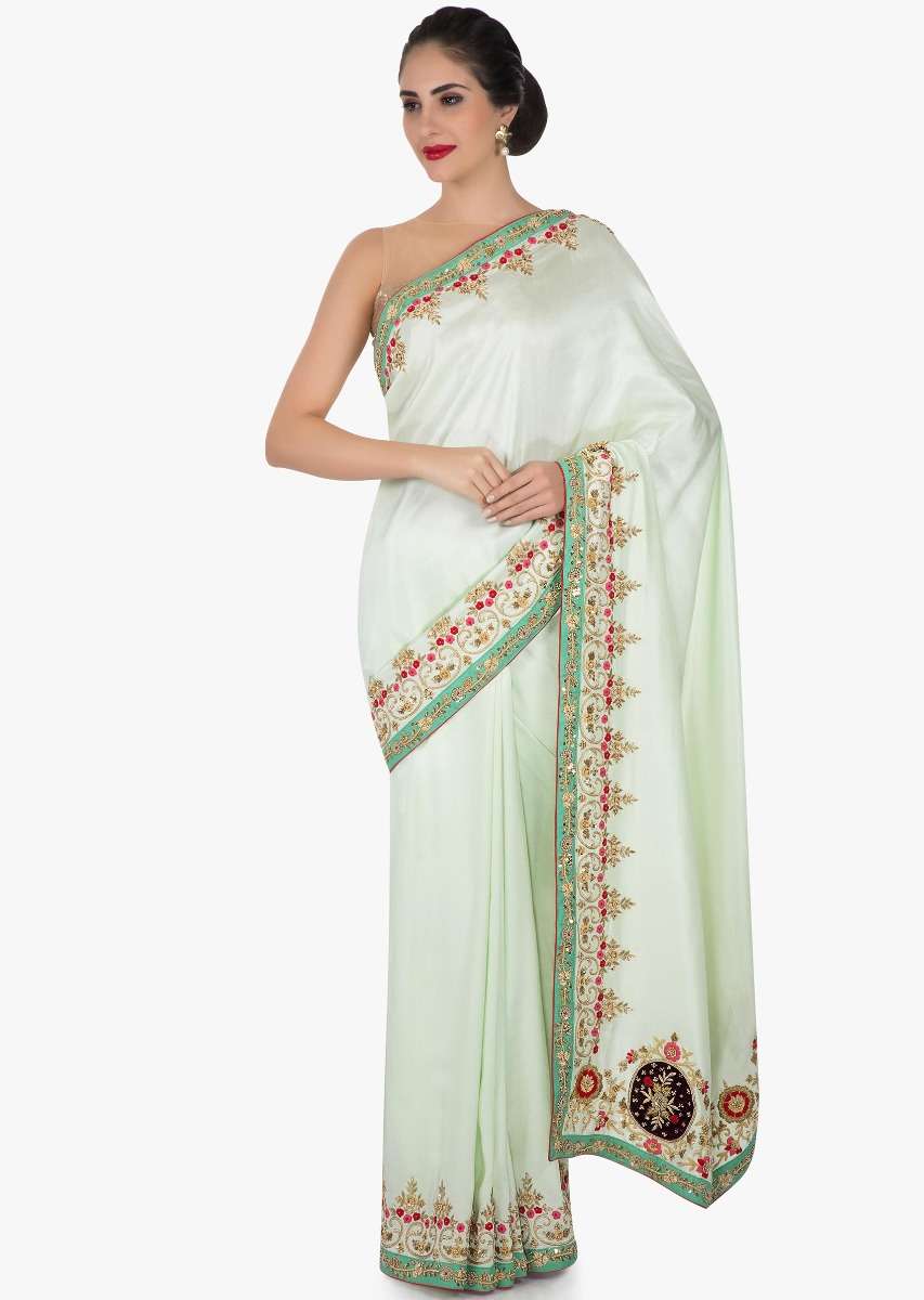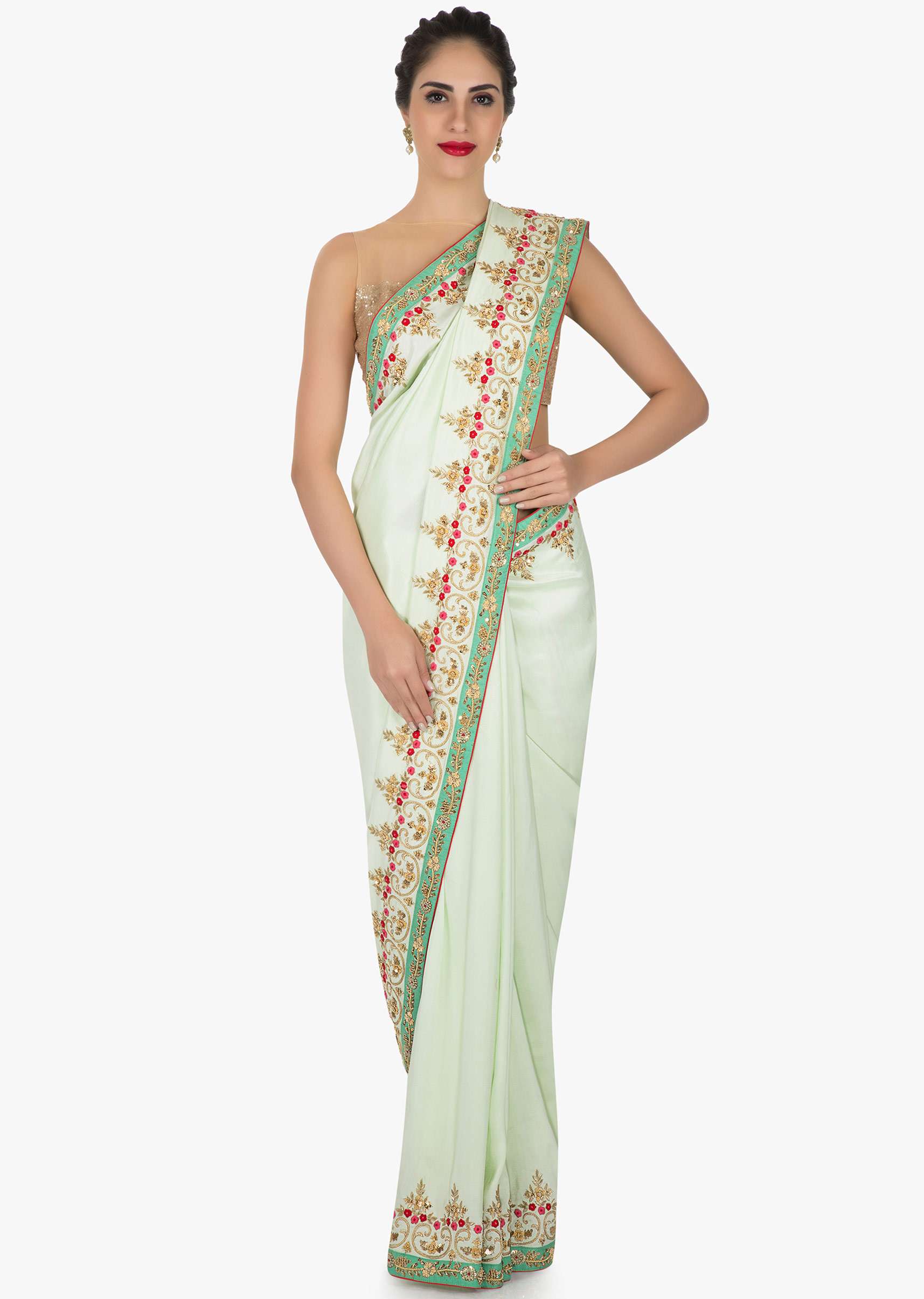 Mint Green Saree In Cotton Silk With Velvet Patch Work And Zardosi Online - Kalki Fashion