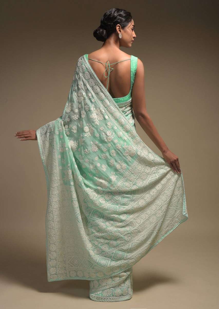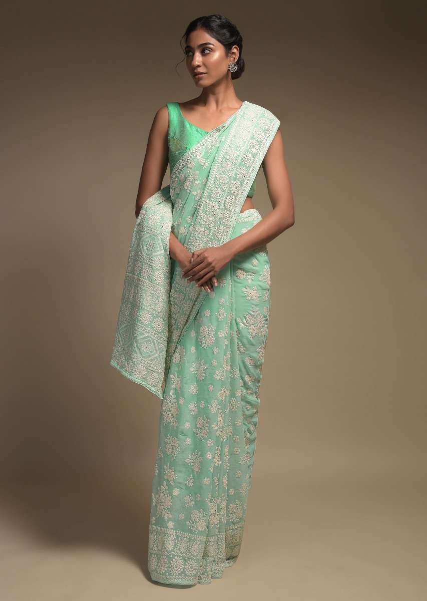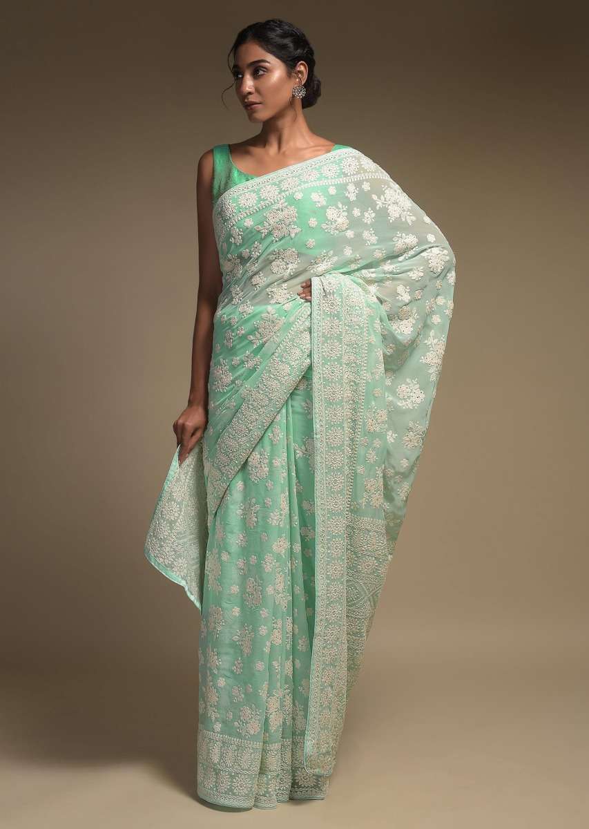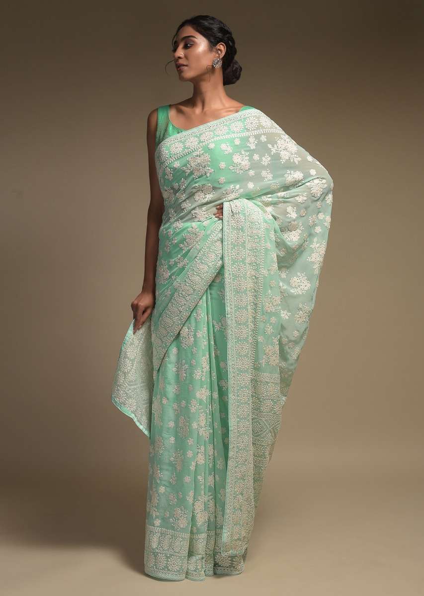Mint Green Saree In Georgette Adorned With Lucknowi Thread Embroidery In Floral Pattern Online - Kalki Fashion