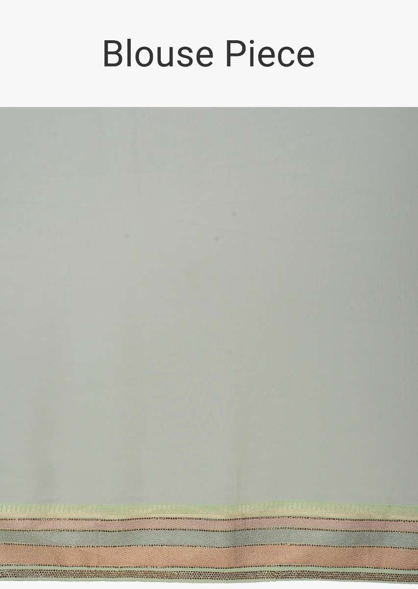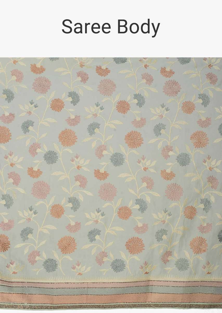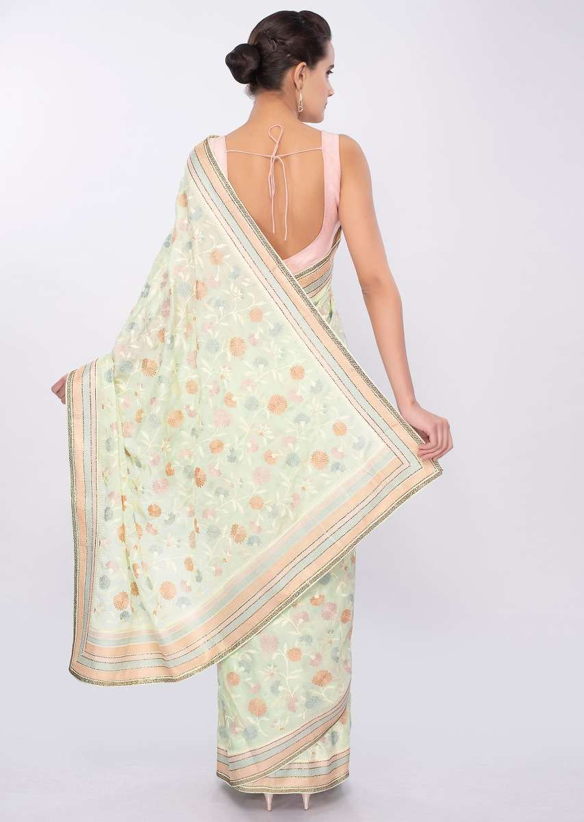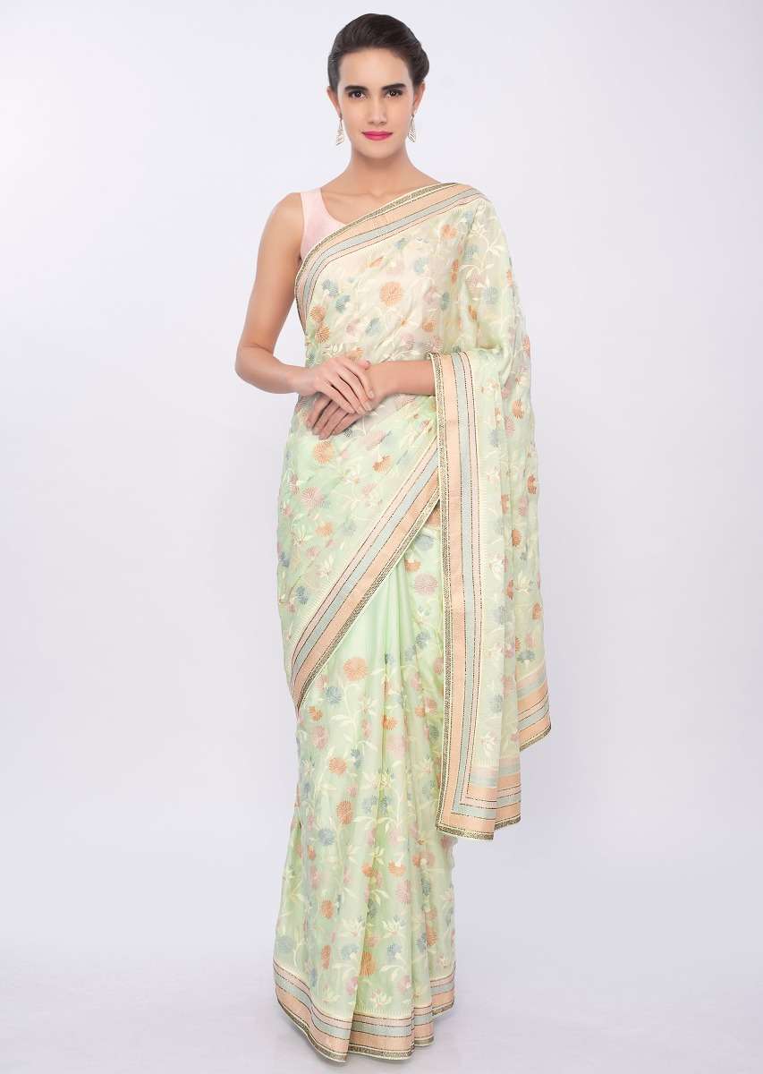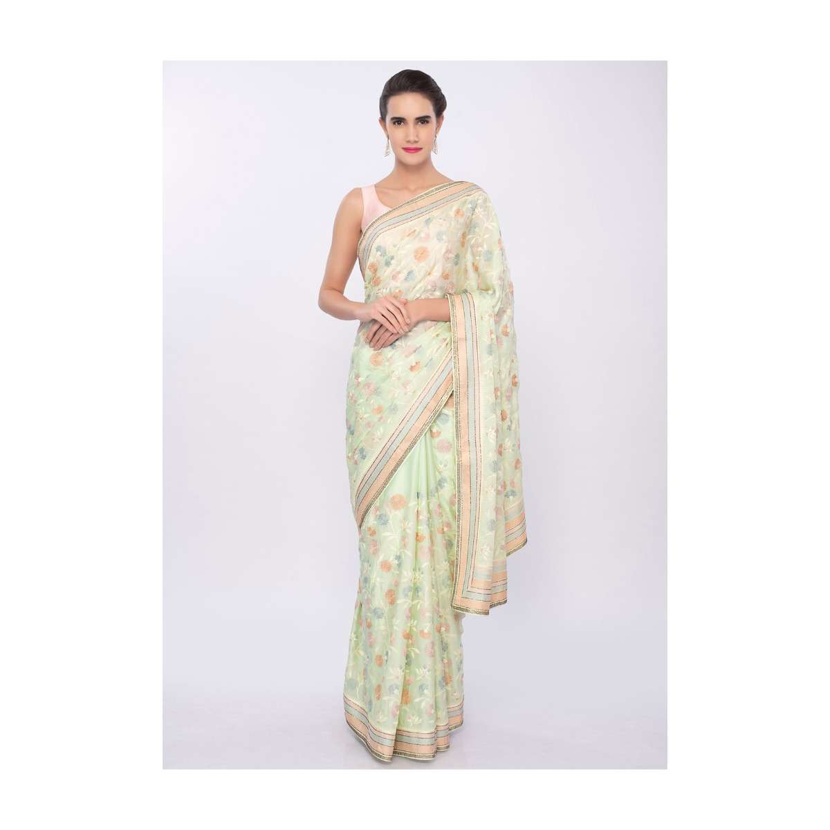 Mint green satin silk saree in multi color floral thread embroidered jaal work only on Kalki