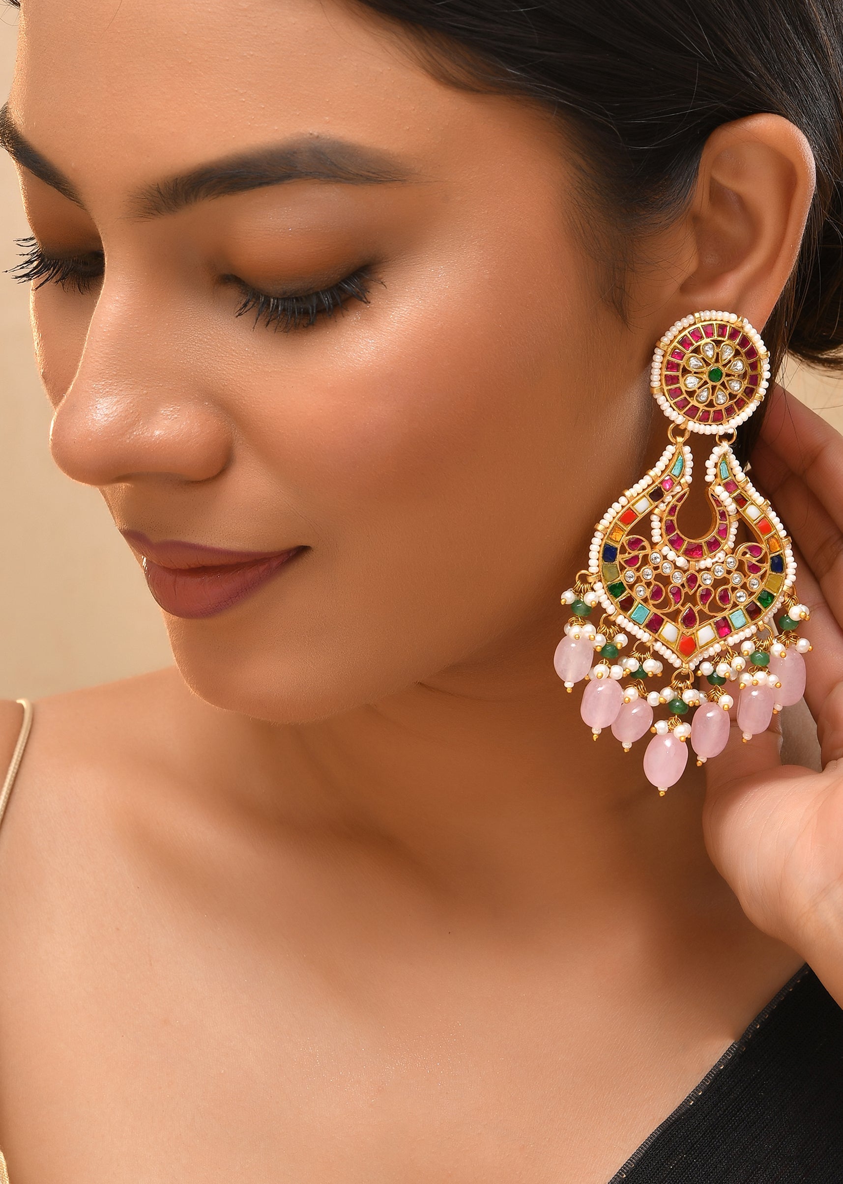 Multi Baby Pink Earrings With Pachi Kundan