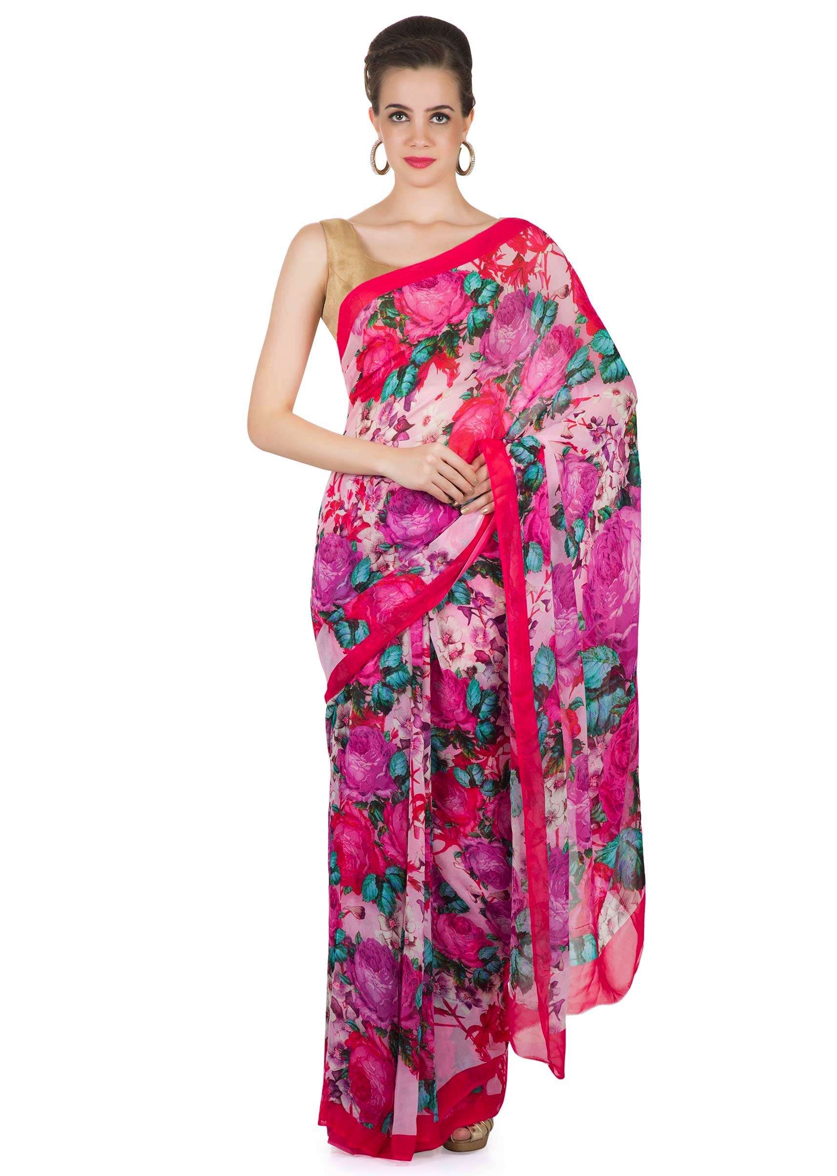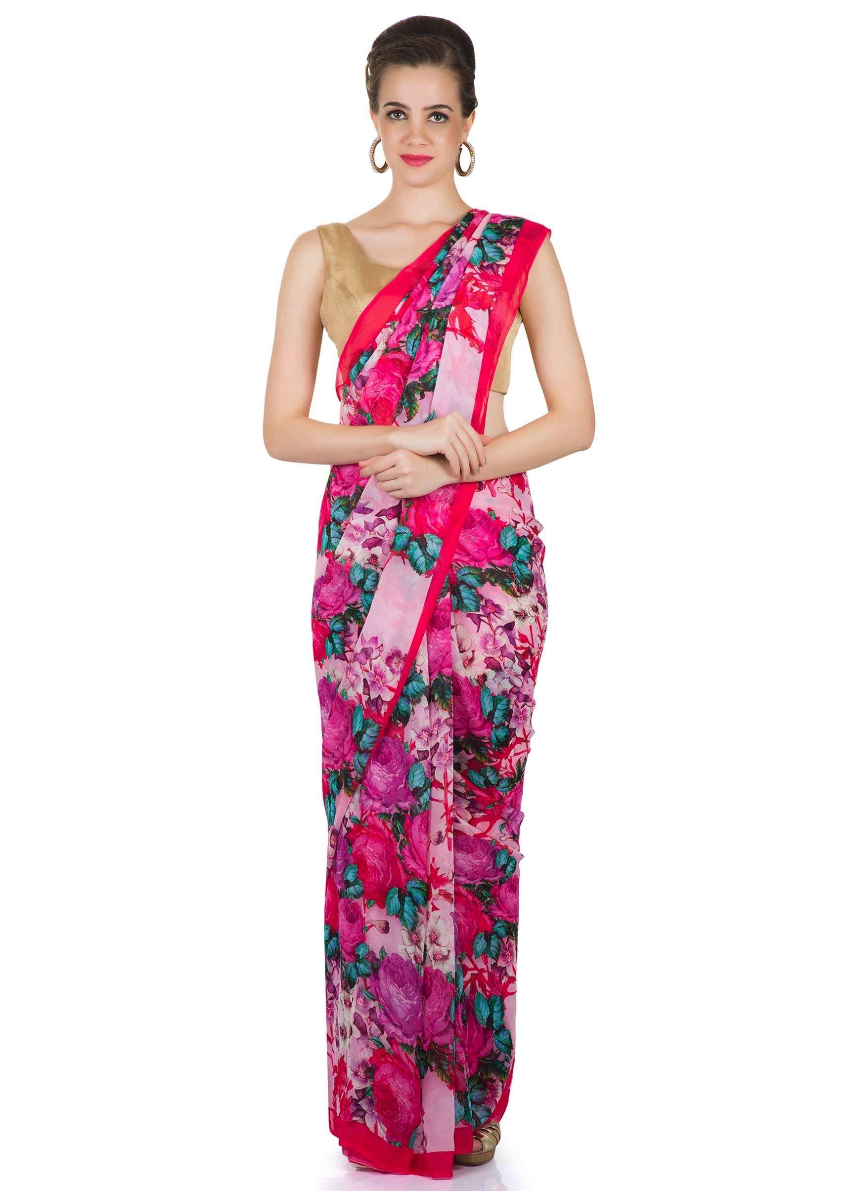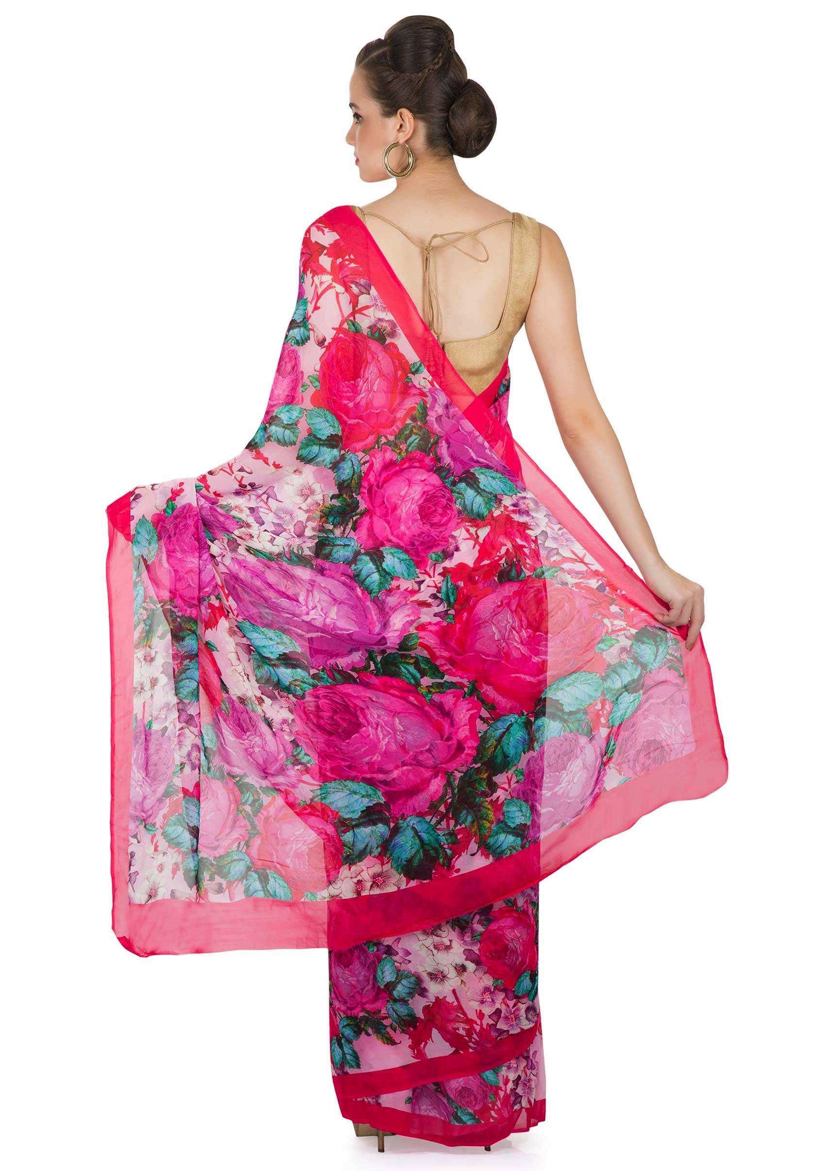 Multi-Colored Floral Printed Georgette Saree And Blouse Online - Kalki Fashion