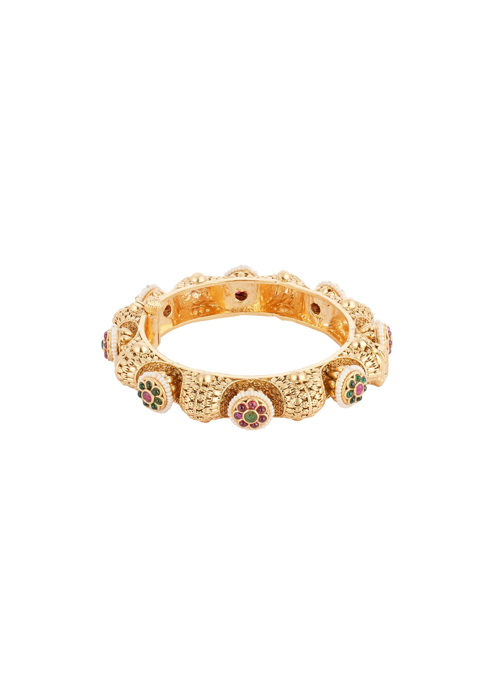 These multi colored gold bangles feature intricate kundan detailing that adds a vibrant and polished charm to your look. The careful craftsmanship highlights their timeless appeal, making them a versatile accessory that pairs beautifully with lehengas, sarees, and indo western ensembles. Lightweight and balanced, they sit comfortably on the wrist while adding a subtle touch of sophistication. Their elegant silhouette makes them perfect for those who appreciate classic style with refined detailing. Awarded as the Most Trusted Brand, we're delivering styles you love, just as promised.