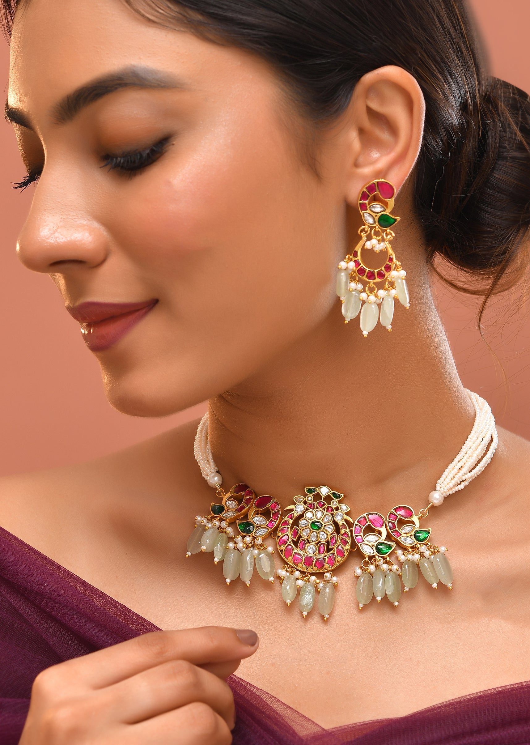 This multi mint green necklace set features intricate pachi kundan work with detailed kundan embellishments for a fresh and festive look. Perfect for haldi and mehendi ceremonies, it is ideal... More Product Details