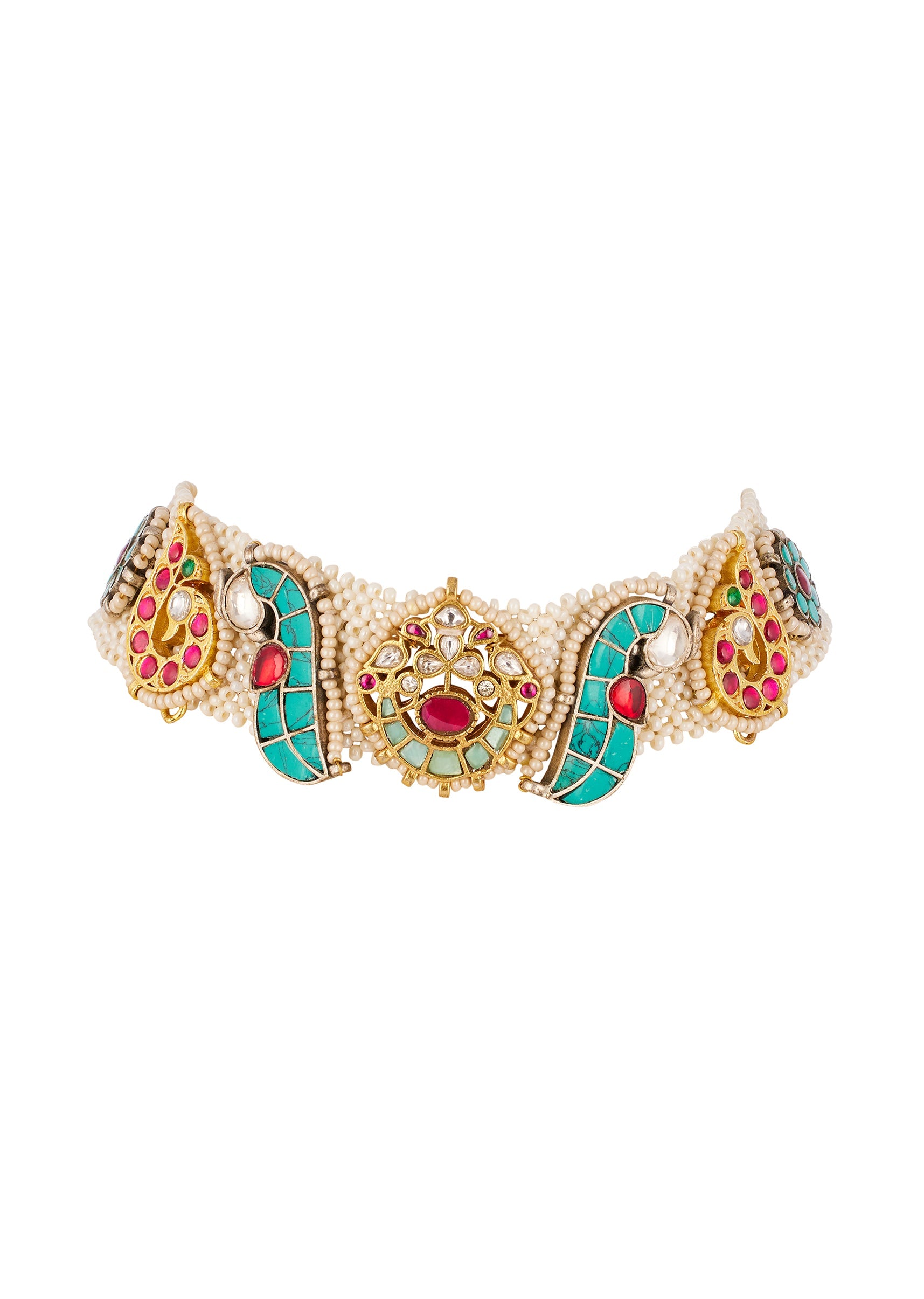 Add timeless charm to your ethnic collection with this Kundan Polki style jewelry set, crafted in an elegant gold tone finish. Accented with simulated coloured stones, the beautifully designed necklace... More Product Details