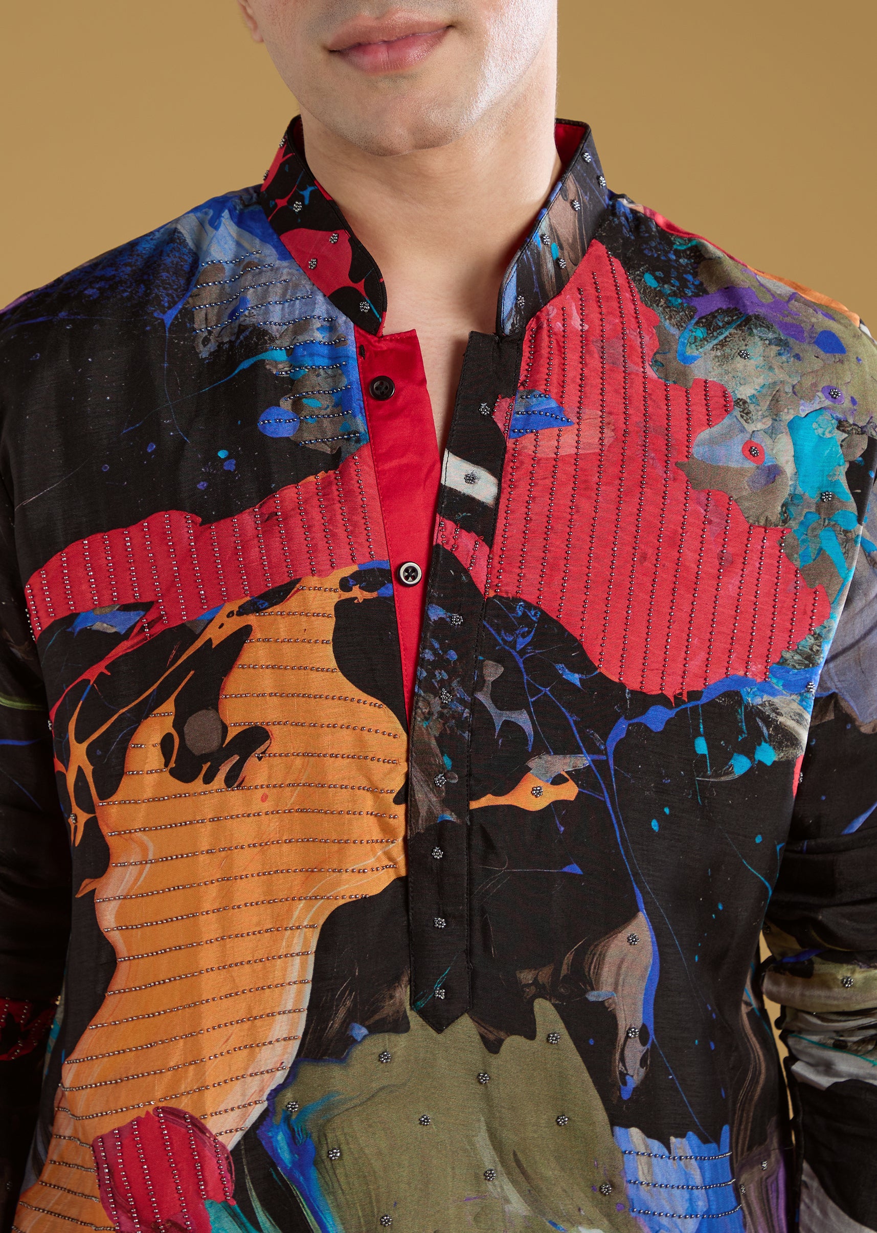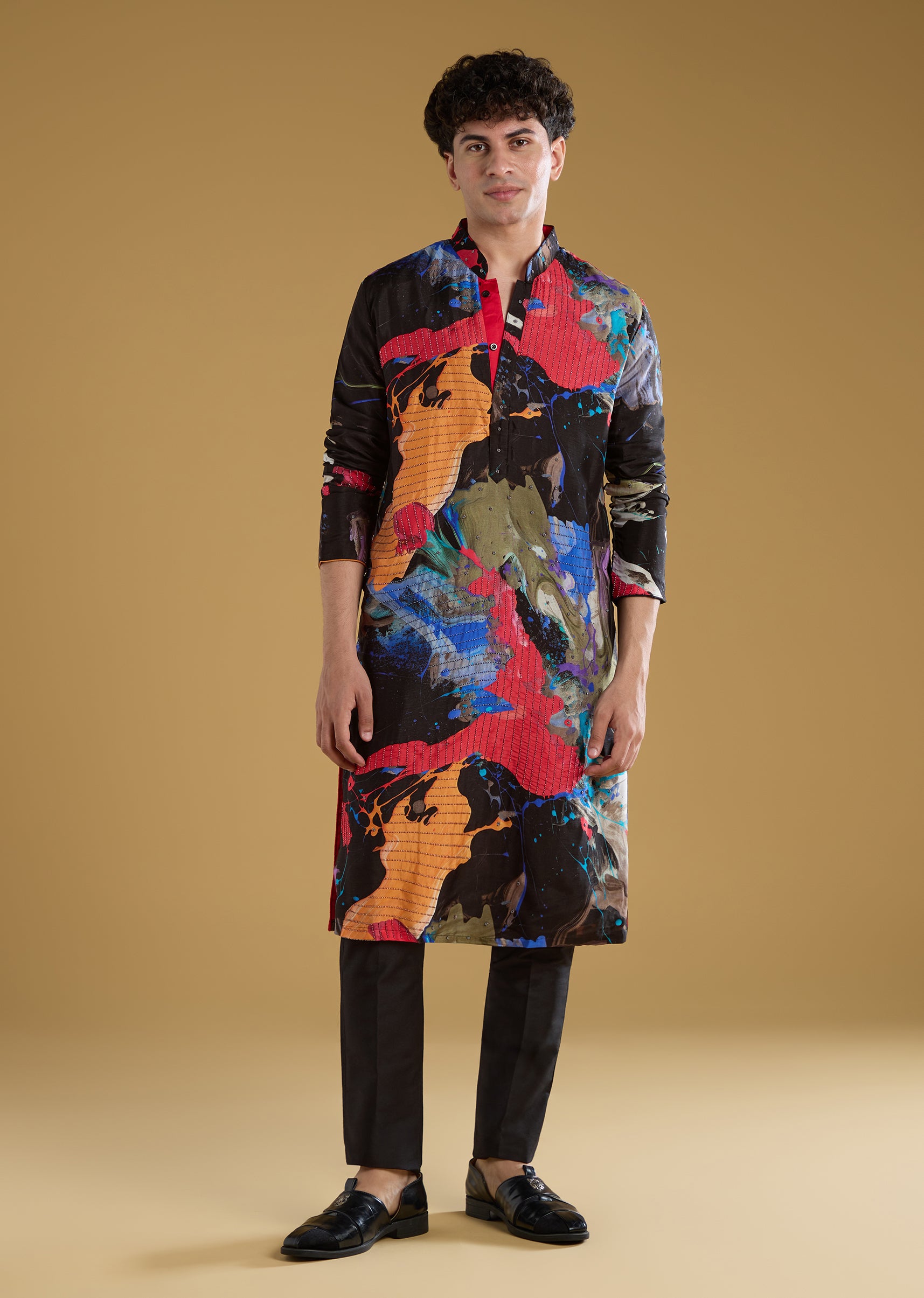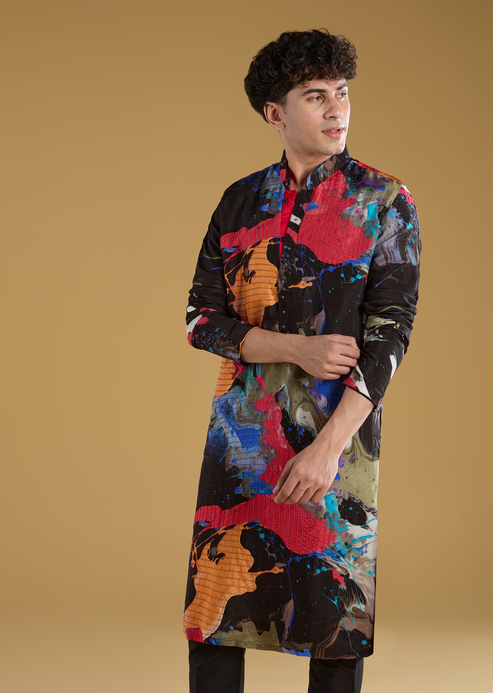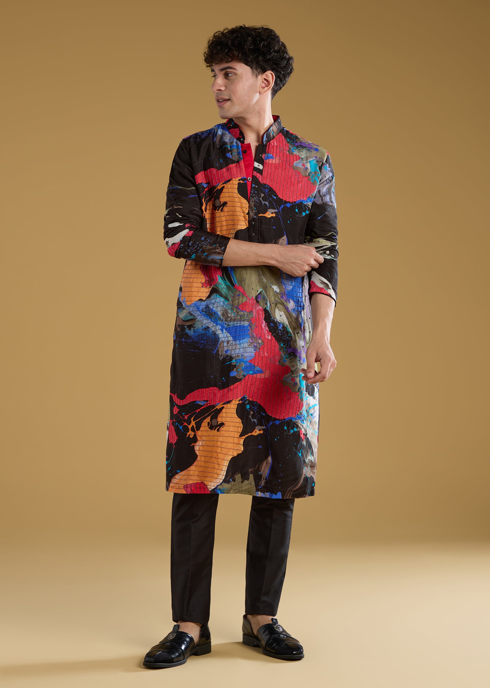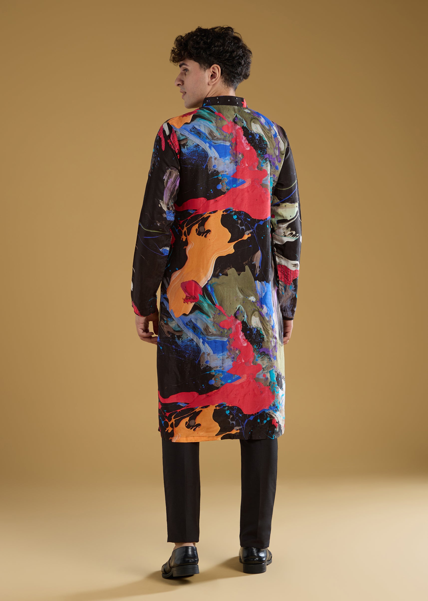 Multicolour Black Rawsilk Abstract Printed Kurta Set