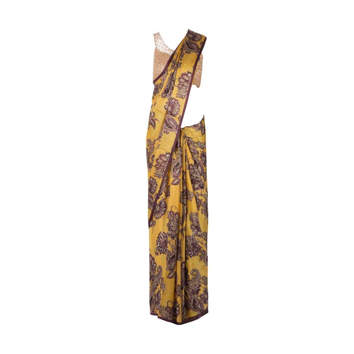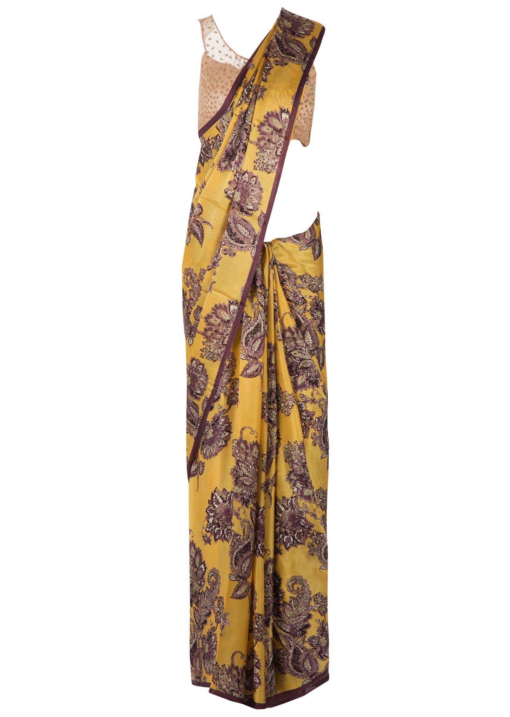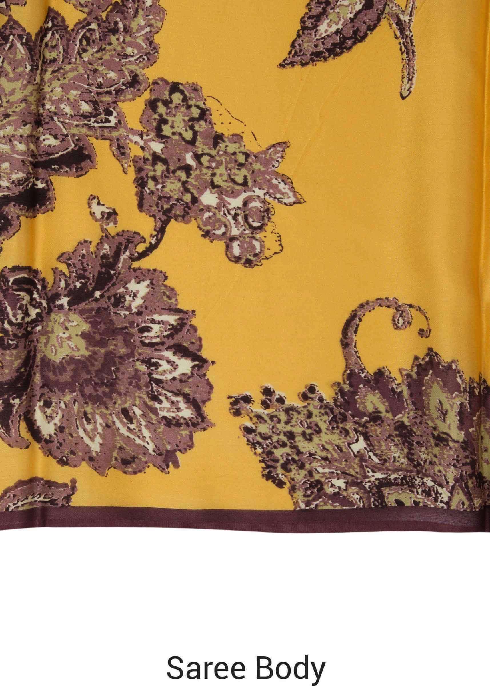 Mustard and brown saree in satin with floral and paisley print only on Kalki