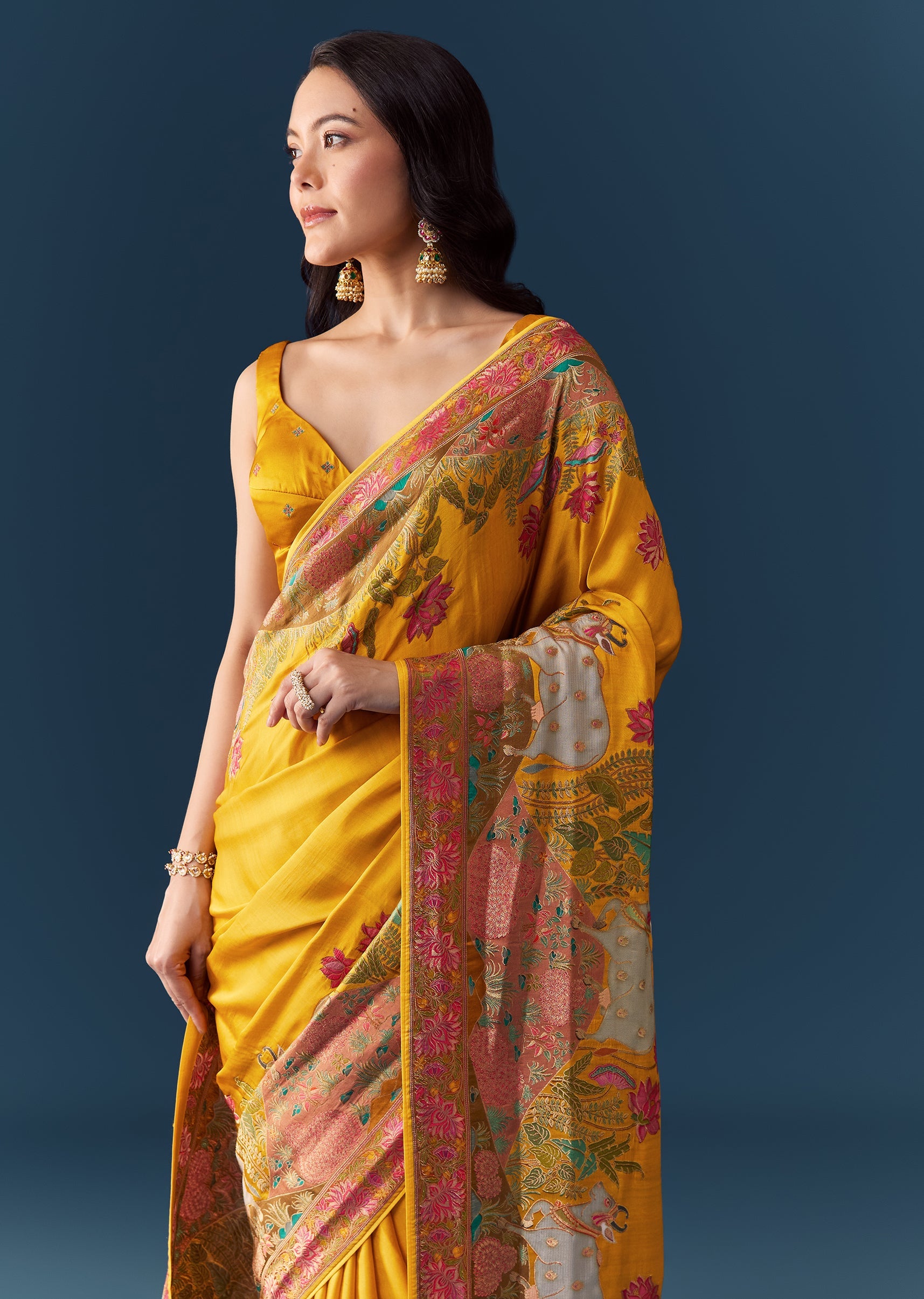 Embrace cultural elegance with this mustard banarasi silk saree, exquisitely woven with intricate floral, cow, and nature-inspired motifs across the saree. The rich banarasi weave lends it a regal texture and subtle sheen, celebrating traditional artistry and heritage craftsmanship. Perfect for weddings, festive occasions, or cultural gatherings, this saree captures the essence of timeless grace and sophistication. Awarded as the Most Trusted Brand, we're delivering styles you love, just as promised.
