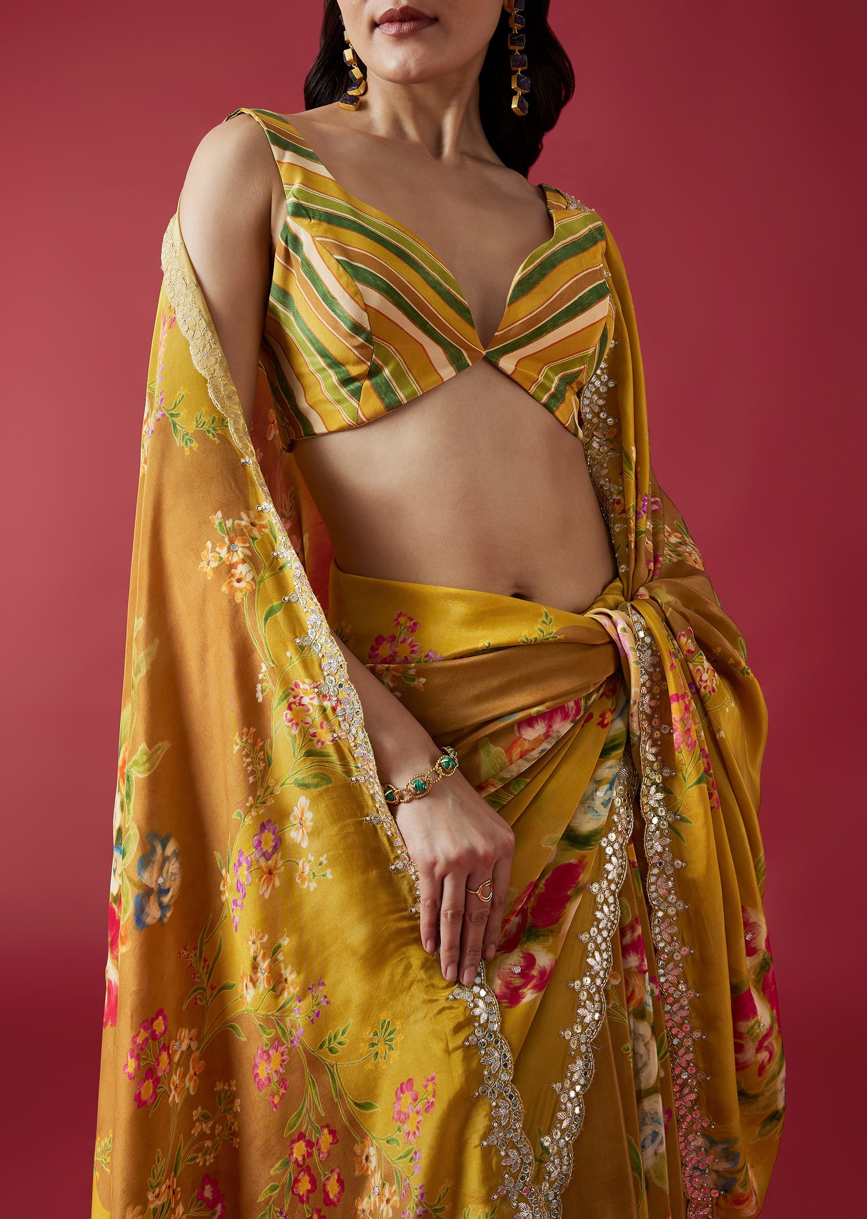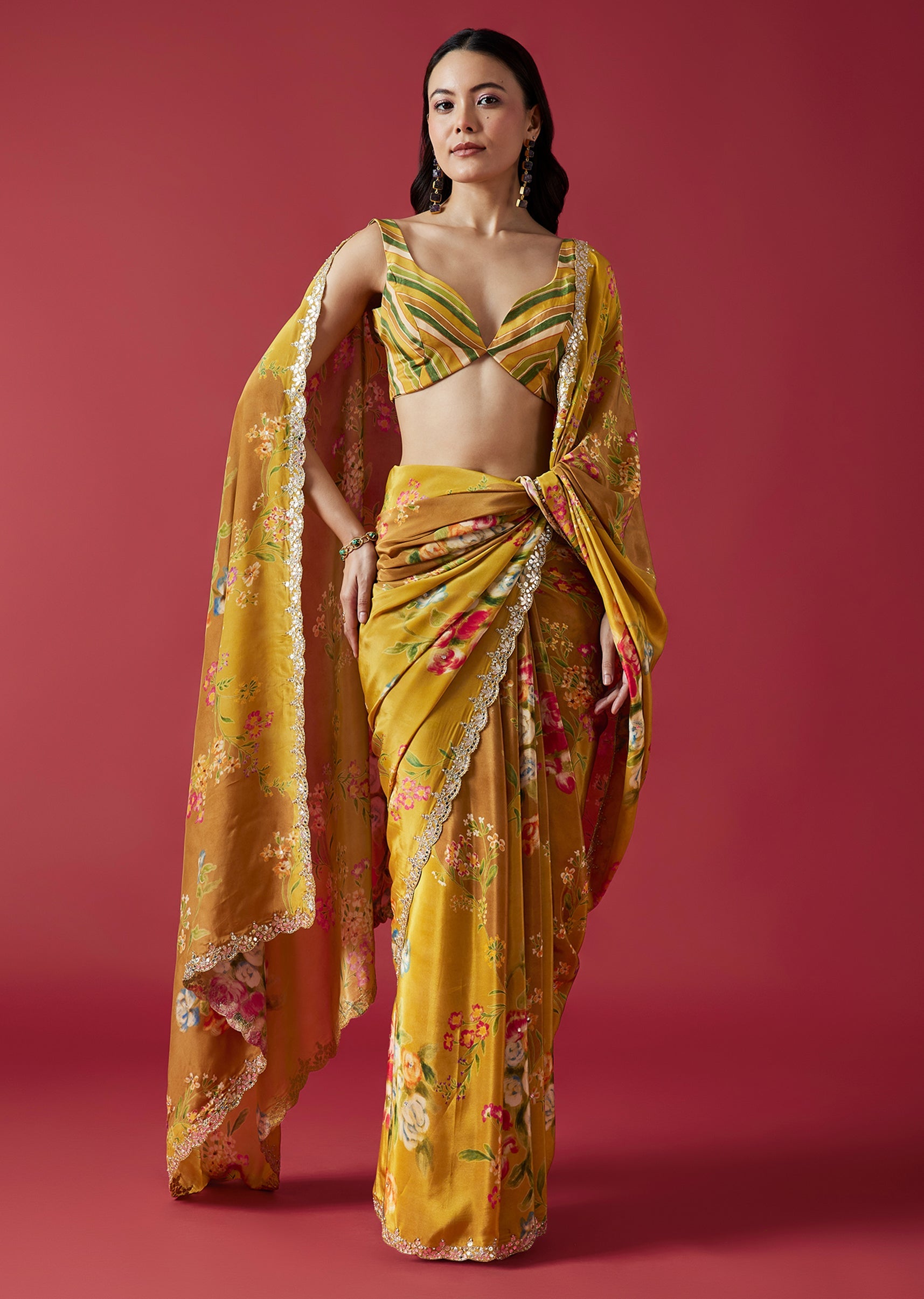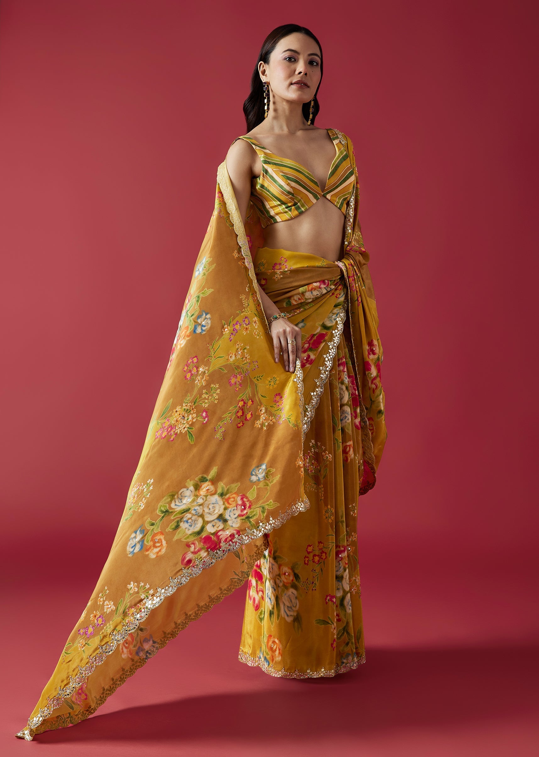 A lively mustard yellow crepe saree highlighted with charming floral prints and a scalloped border adorned with mirror and gotta work. The multicolor striped blouse fabric adds a playful contrast... More Product Details