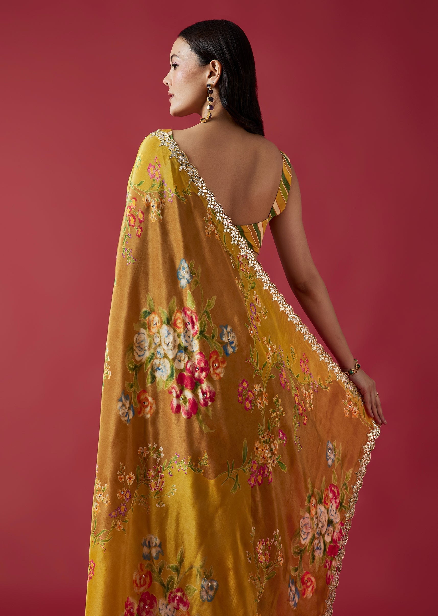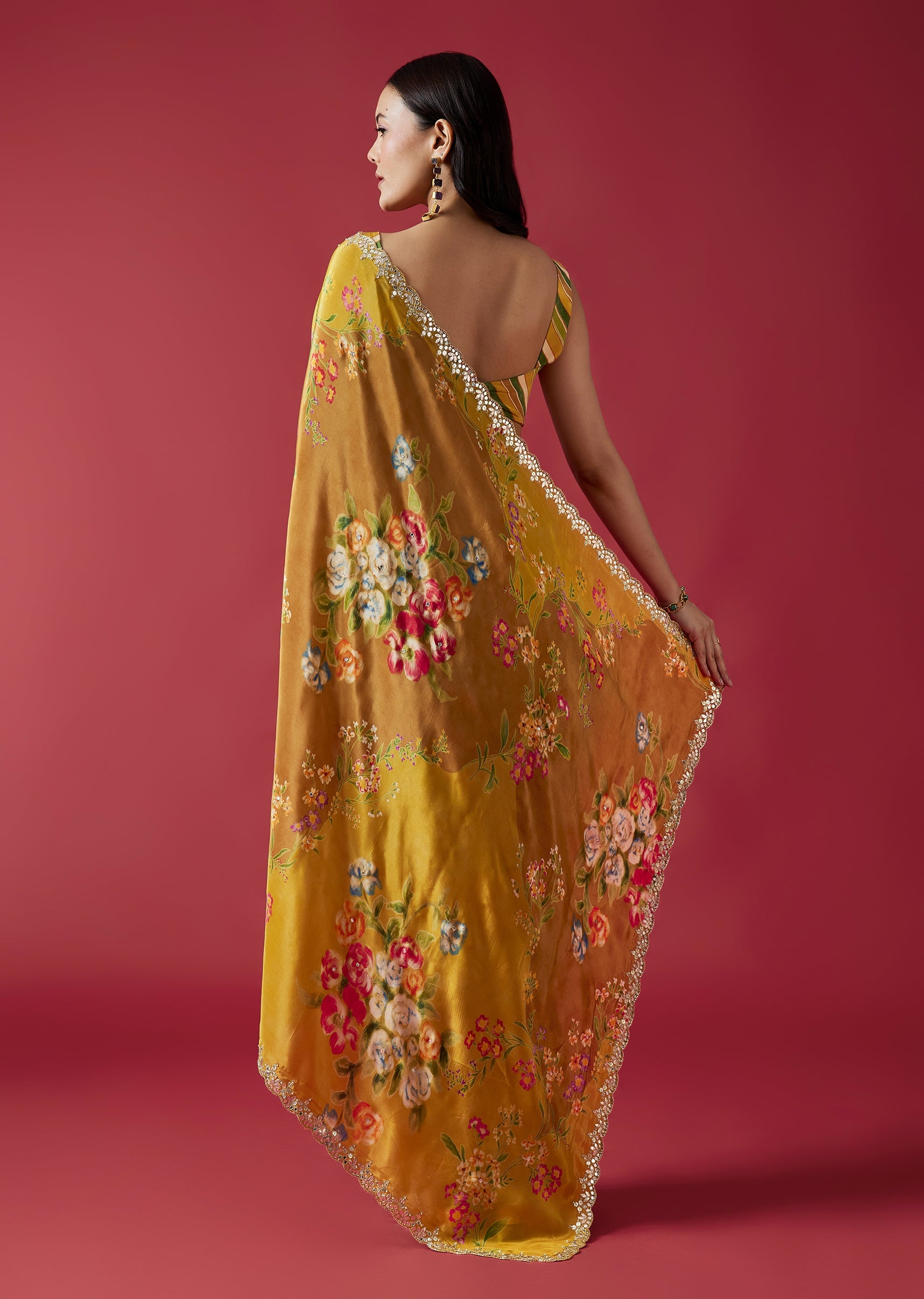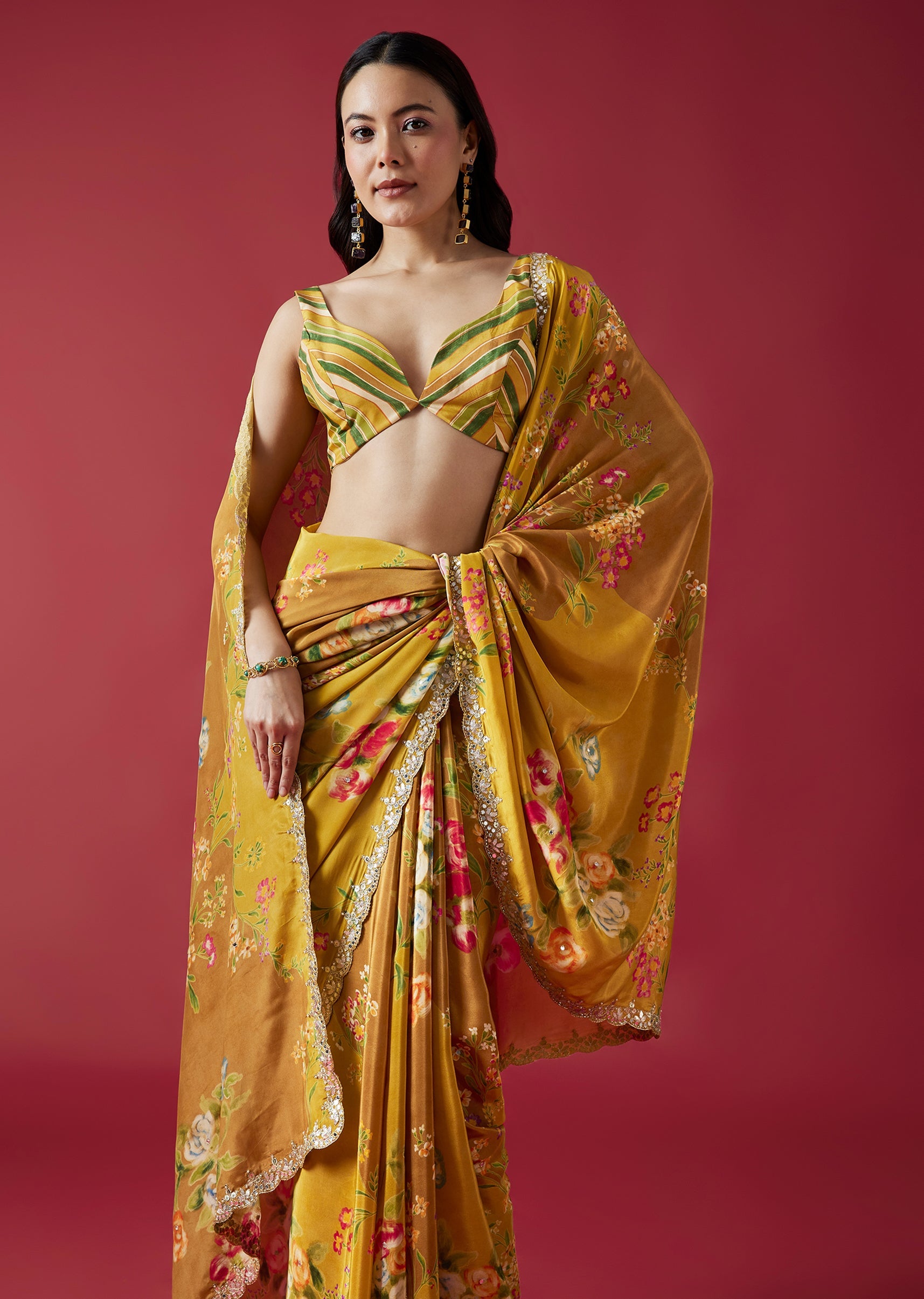 A lively mustard yellow crepe saree highlighted with charming floral prints and a scalloped border adorned with mirror and gotta work. The multicolor striped blouse fabric adds a playful contrast... More Product Details