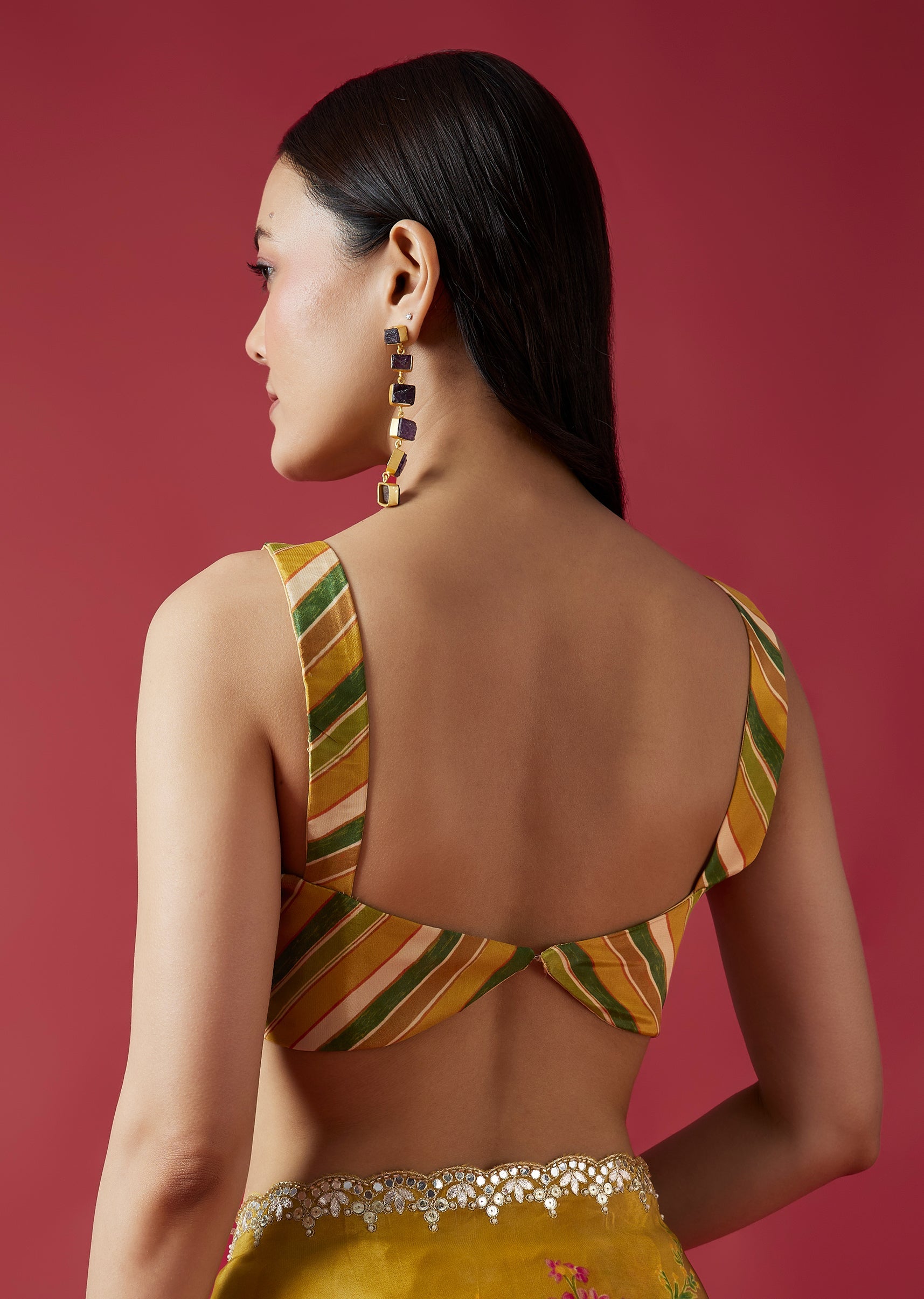 A lively mustard yellow crepe saree highlighted with charming floral prints and a scalloped border adorned with mirror and gotta work. The multicolor striped blouse fabric adds a playful contrast to this festive-ready drape. Awarded as the Most Trusted Brand, we're delivering styles you love, just as promised.
