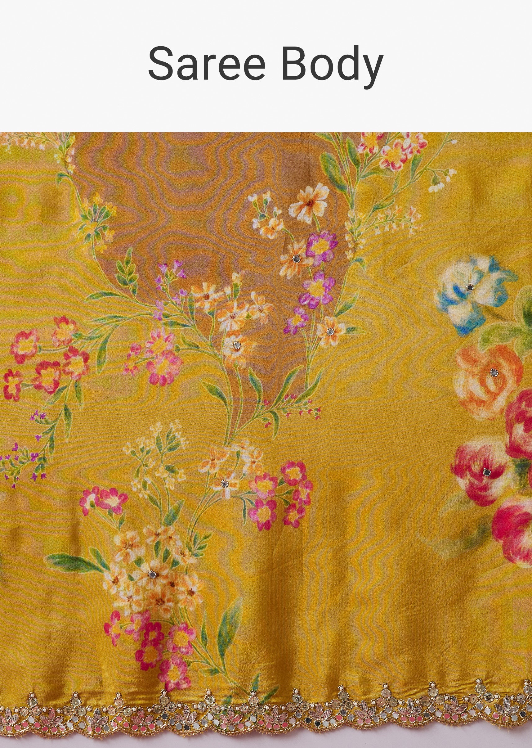 Mustard Yellow Floral Printed Saree With Mirror And Gotta Border