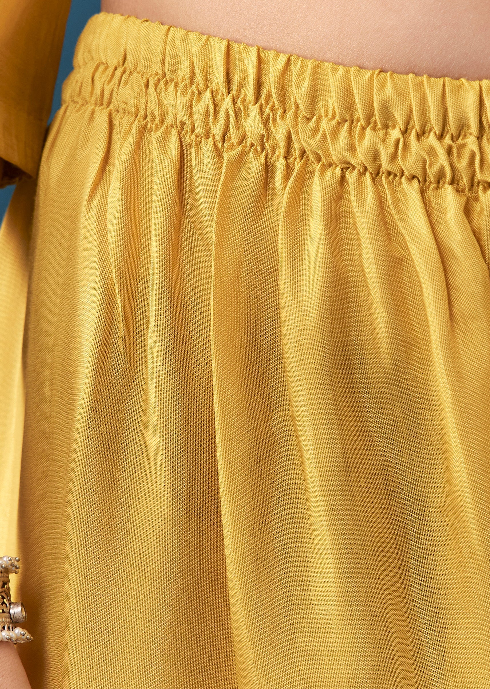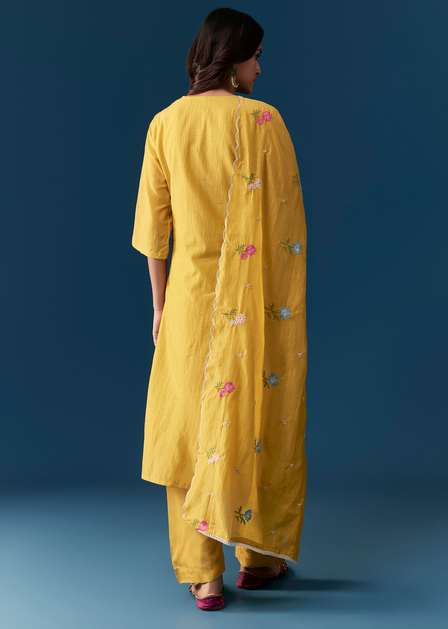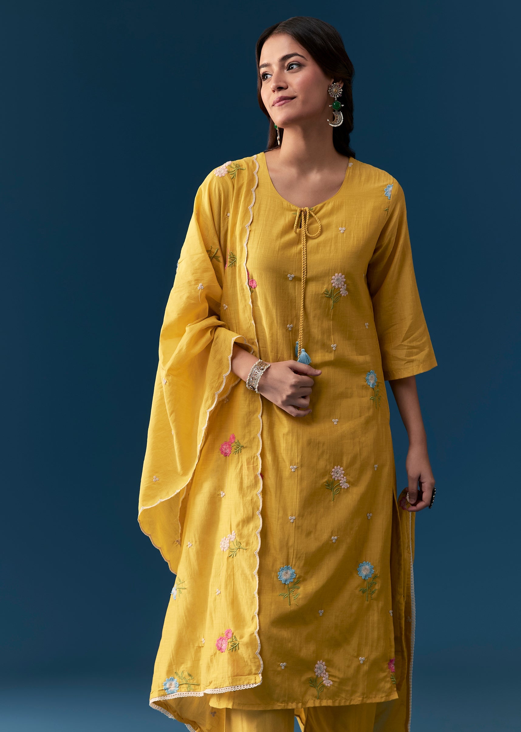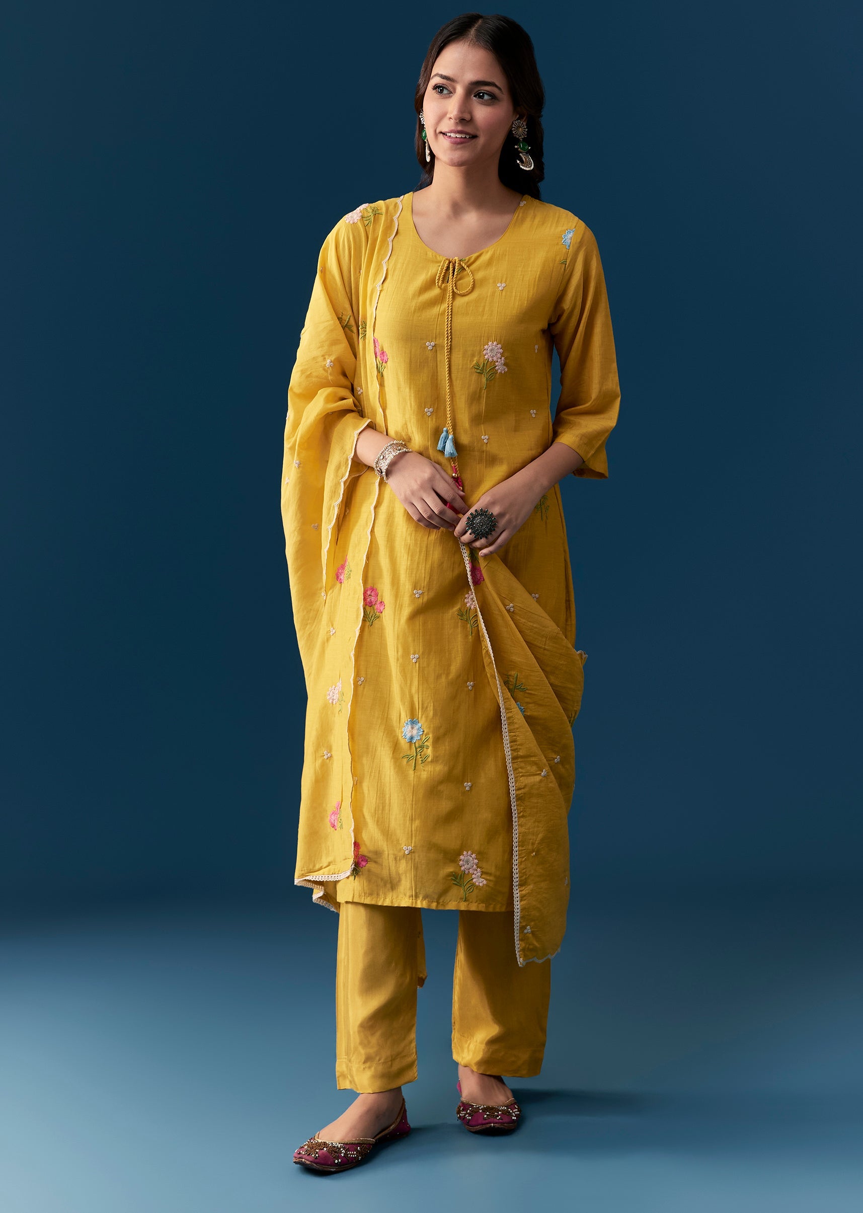 A radiant mustard yellow kurta set crafted in a straight Pakistani silhouette, this ensemble features intricate cotton thread work for a refined textural charm. Designed with a classic round neckline... More Product Details